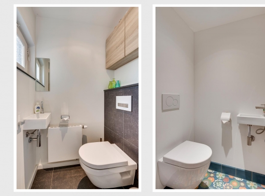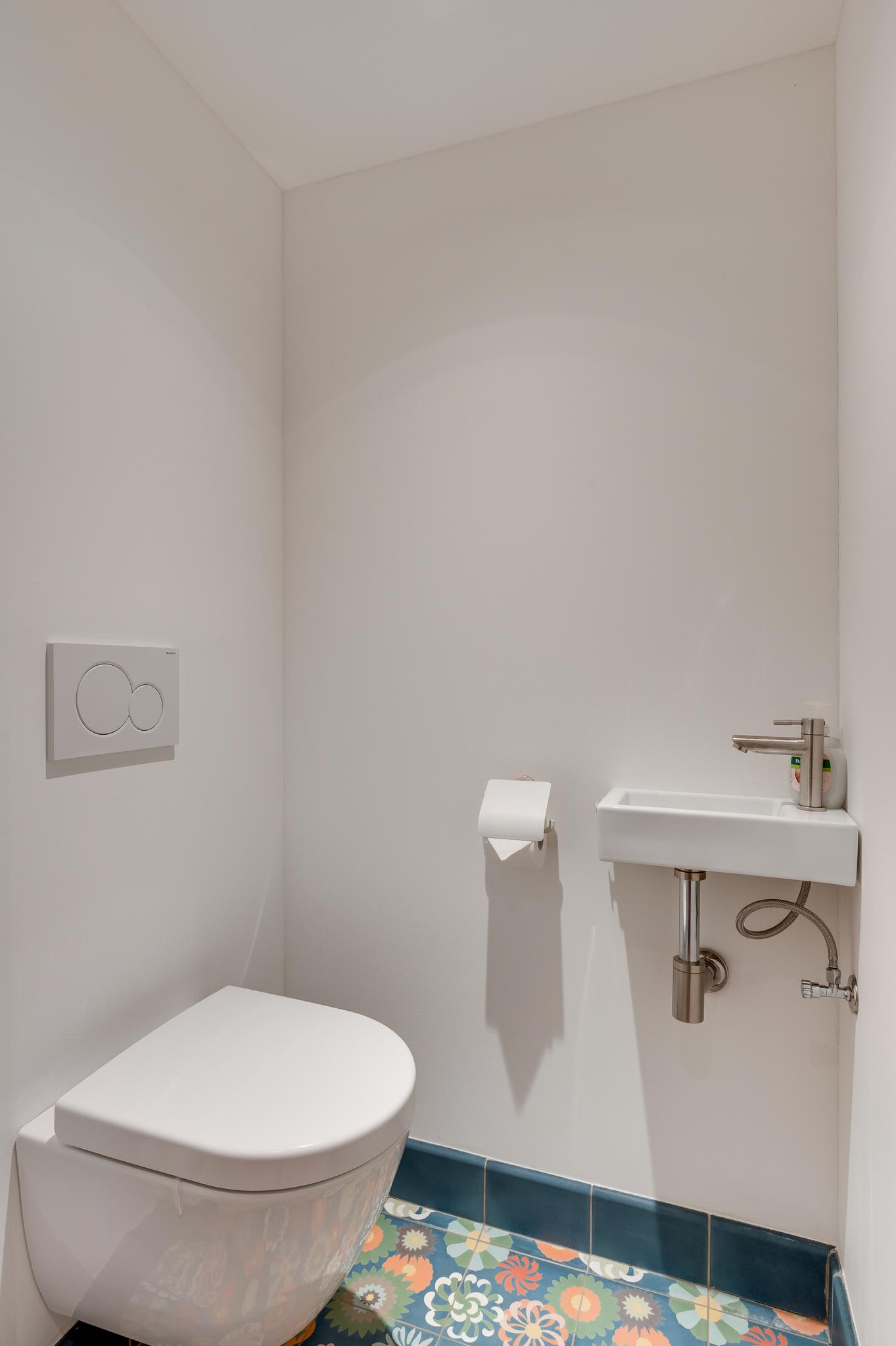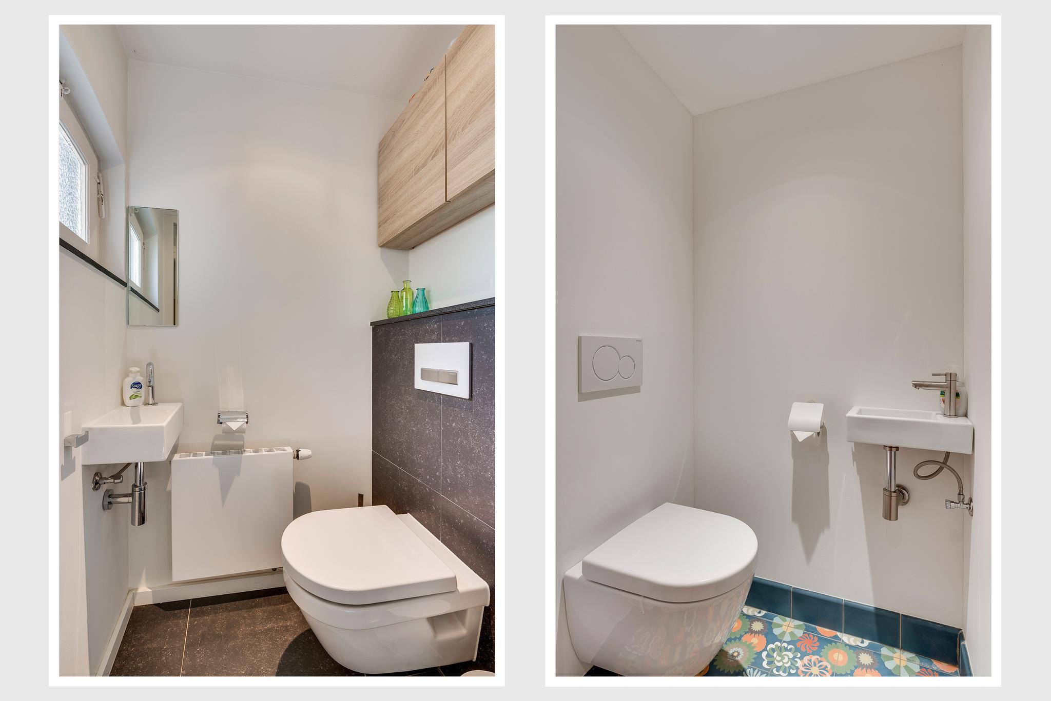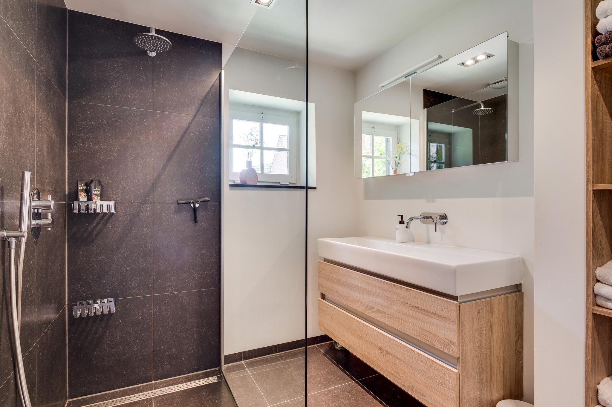 Vanuit de woonkamer is een portaal te bereiken waaraan de moderne toiletruimte met fonteintje en de badkamer (2014) grenzen. De badkamer (3,20 x 2,05) is ingedeeld met een inloopdouche en wastafelmeubel.
