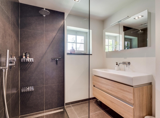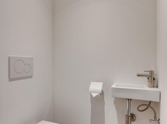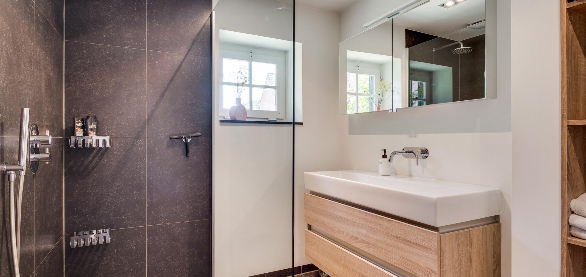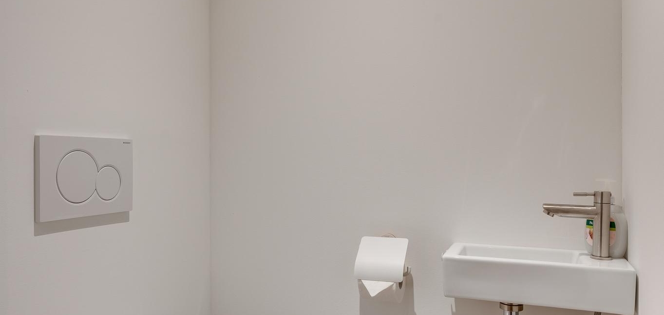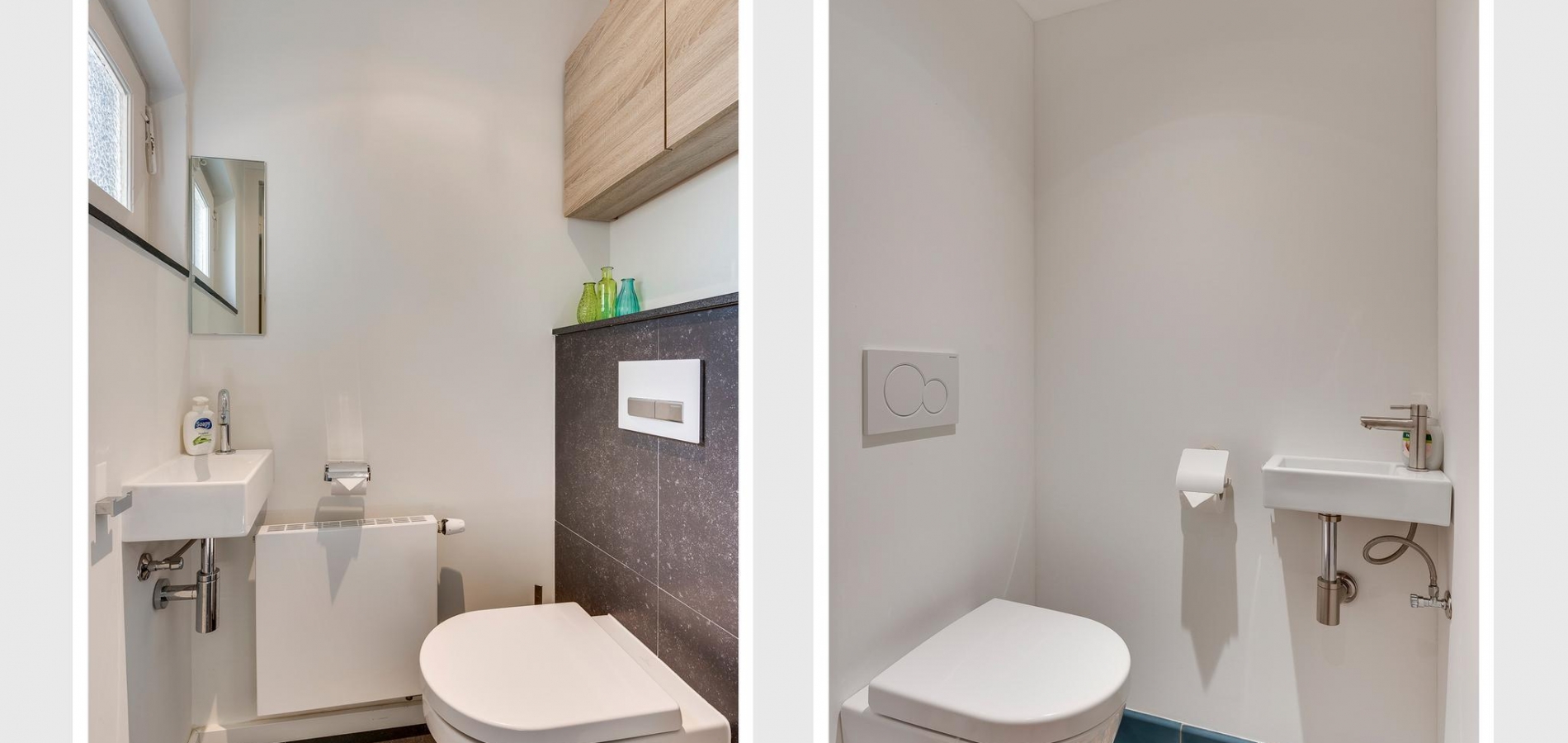 Vanuit de woonkamer is een portaal te bereiken waaraan de moderne toiletruimte met fonteintje en de badkamer (2014) grenzen. De badkamer (3,20 x 2,05) is ingedeeld met een inloopdouche en wastafelmeubel.