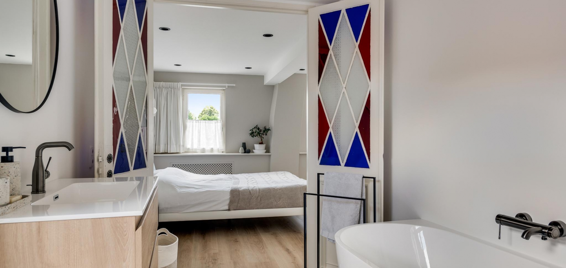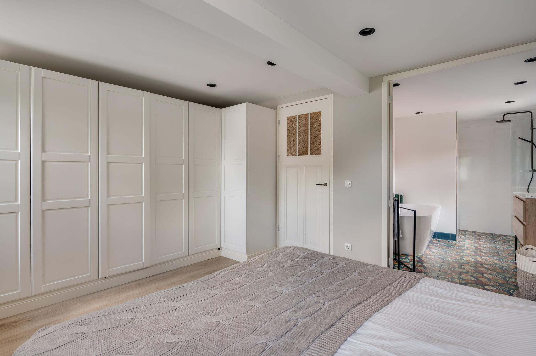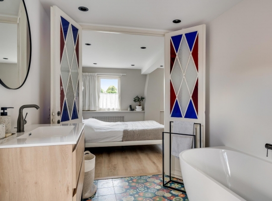Slaapkamer I/master bedroom (4,35 x 3,66) met op maat gemaakte kastenwand straalt een aangename rust uit en en-suite de badkamer (3,61 x 2,10) is ingedeeld met een prachtig, bad, inloopdouche en een wastafelmeubel. Blikvangers zijn de zwarte kranen, kleurrijke tegelvloer en de oude deuren.