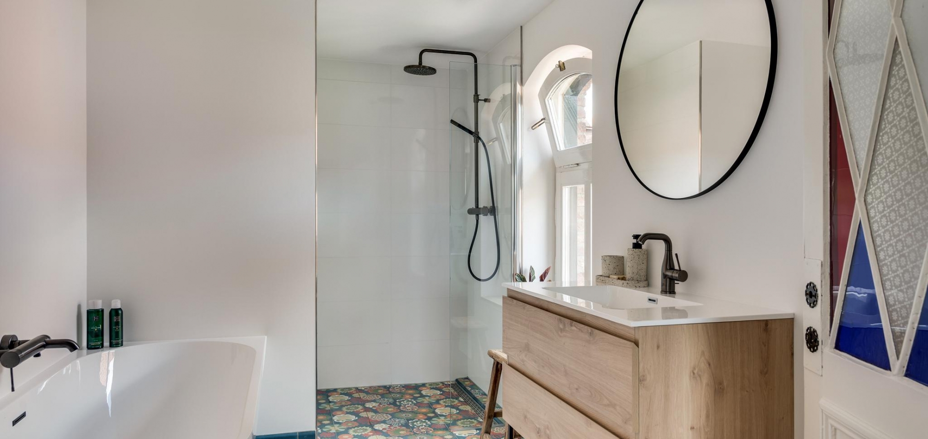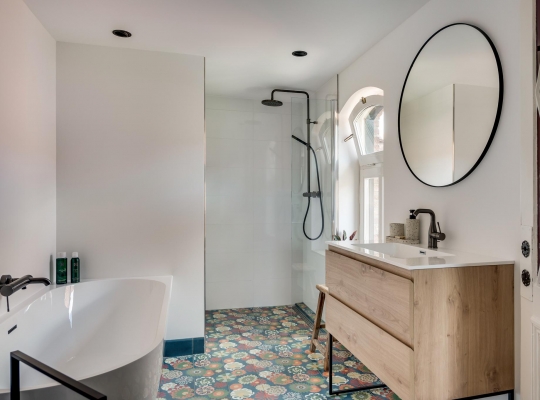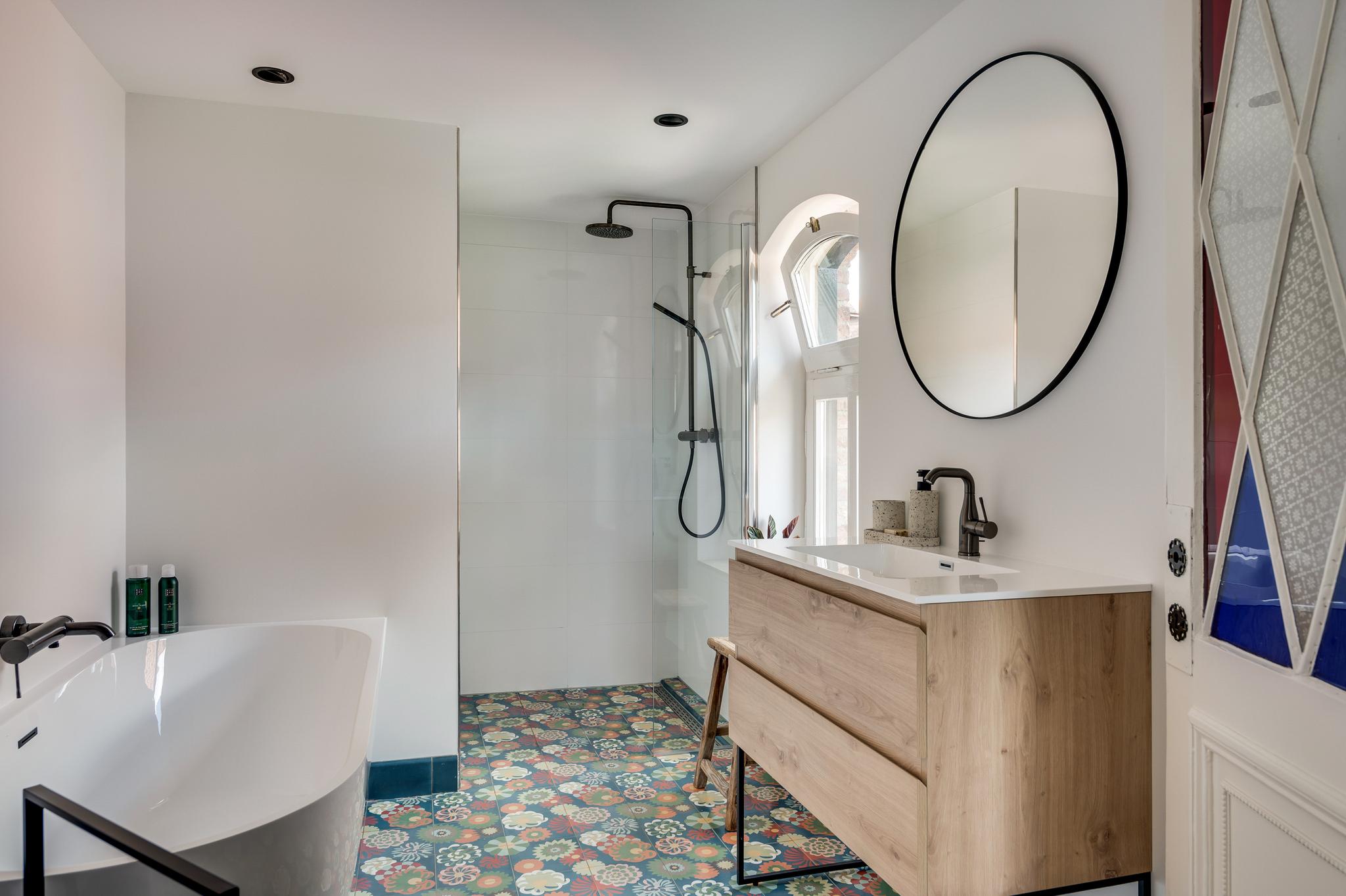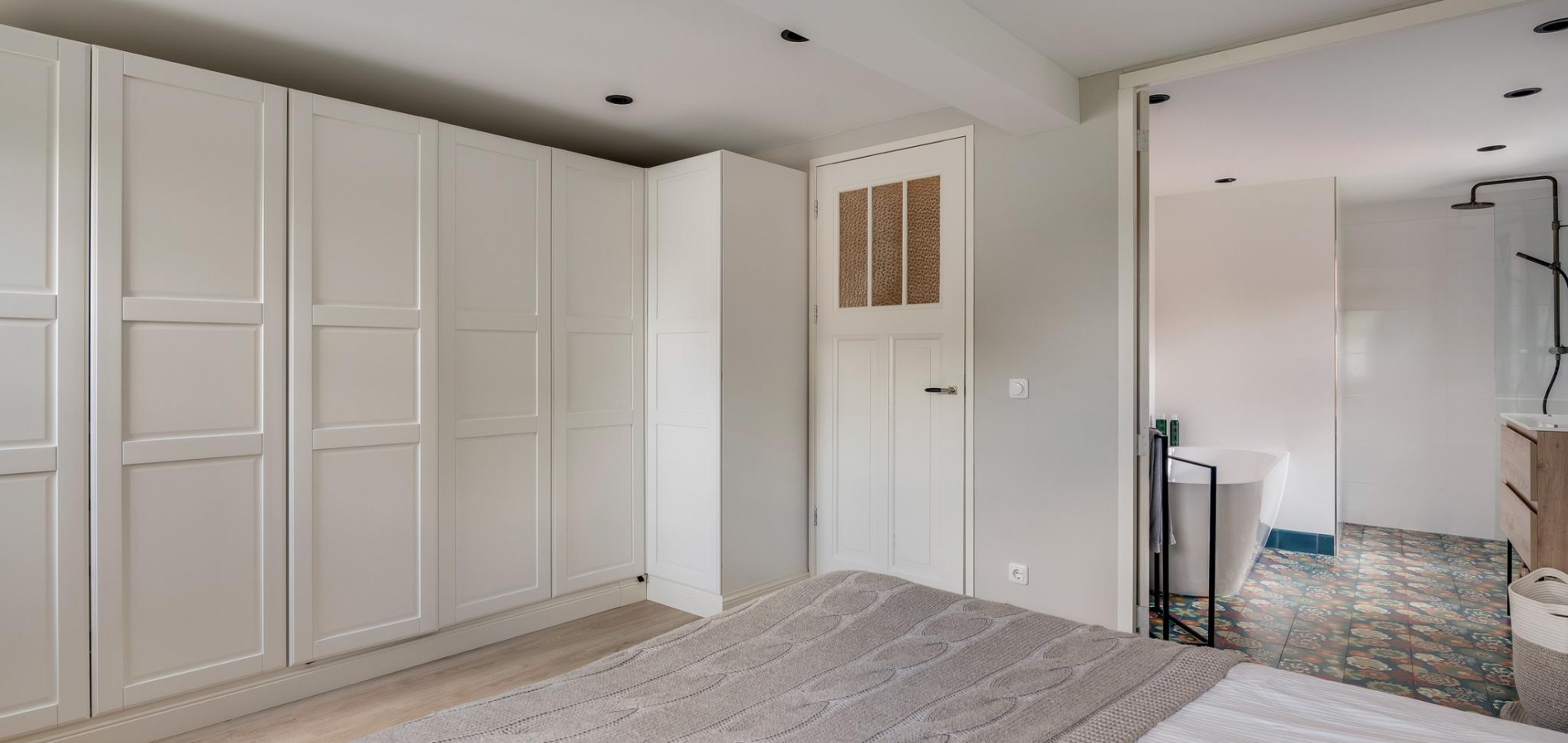 Slaapkamer I/master bedroom (4,35 x 3,66) met op maat gemaakte kastenwand straalt een aangename rust uit en en-suite de badkamer (3,61 x 2,10) is ingedeeld met een prachtig, bad, inloopdouche en een wastafelmeubel. Blikvangers zijn de zwarte kranen, kleurrijke tegelvloer en de oude deuren.
