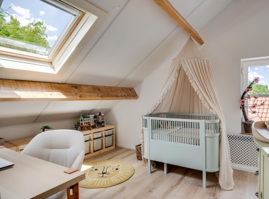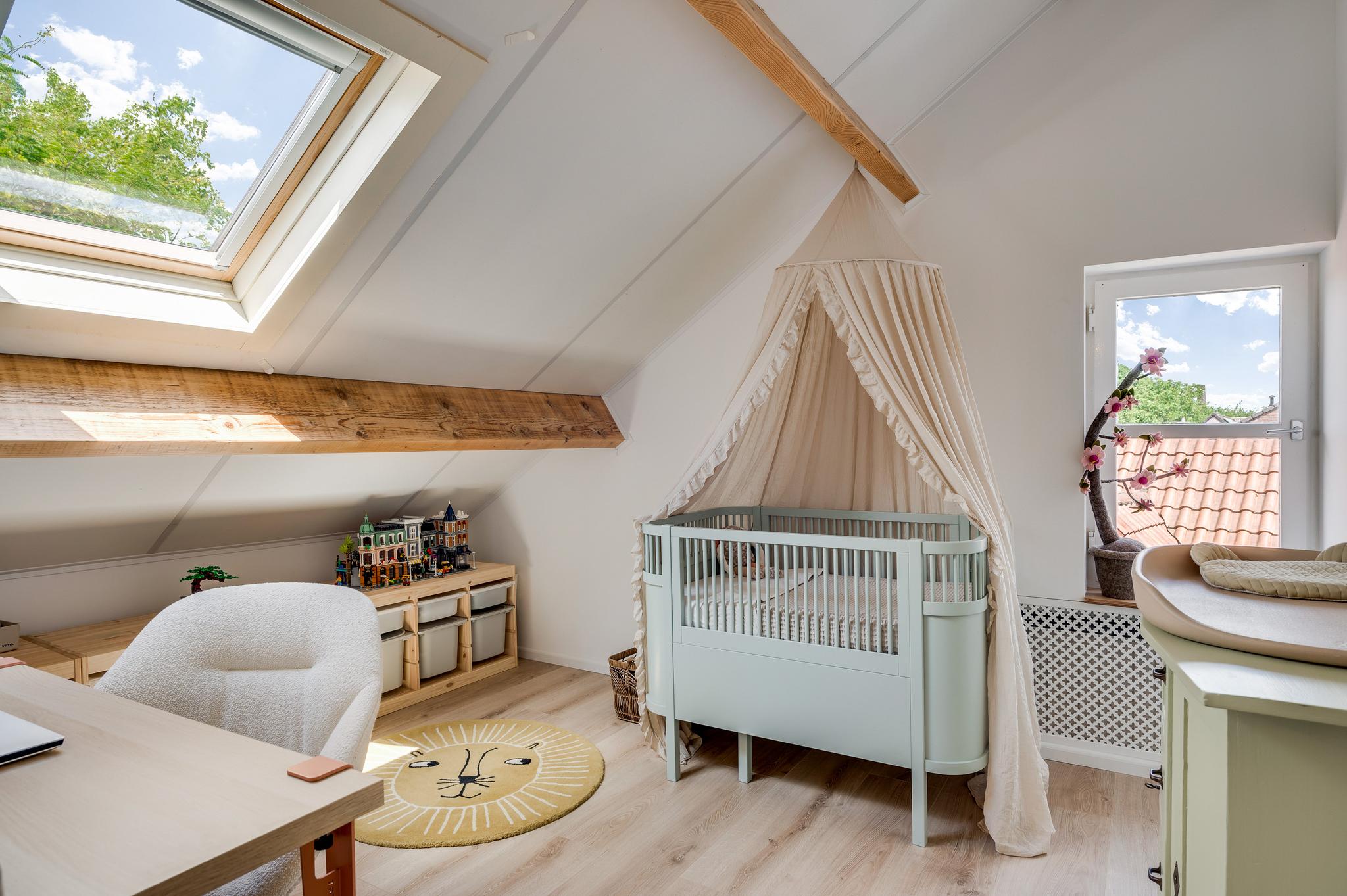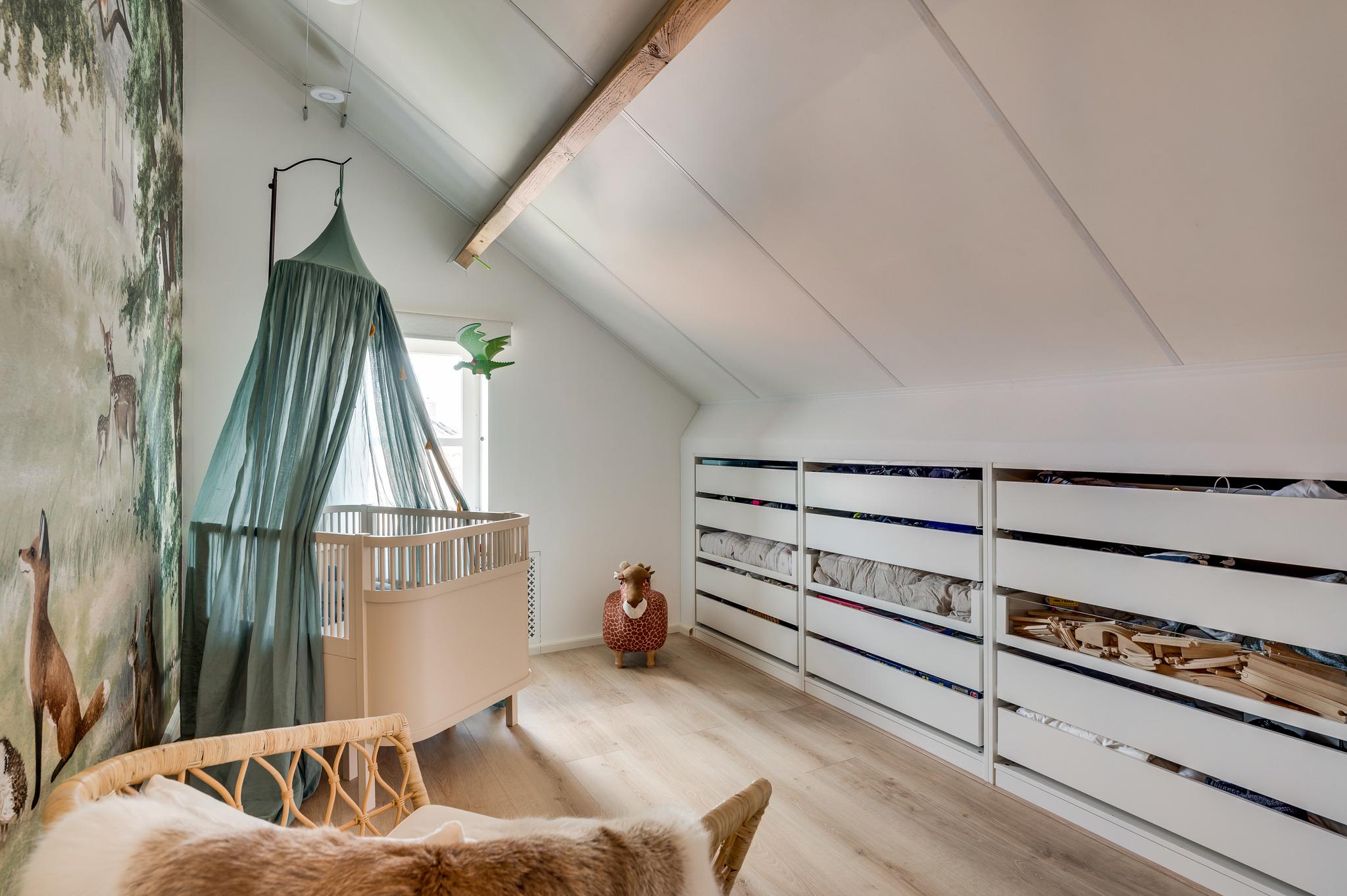 De eikenhouten trap volgt zijn weg naar de tweede verdieping, waar nog twee slaapkamers zijn. Slaapkamer II (4,35 x 2,52) heeft vaste kasten in de schuinte van het dak met brede lades. Aan de achterzijde is slaapkamer III (3,72 x 3,01), die eveneens als kinderkamer is ingericht.