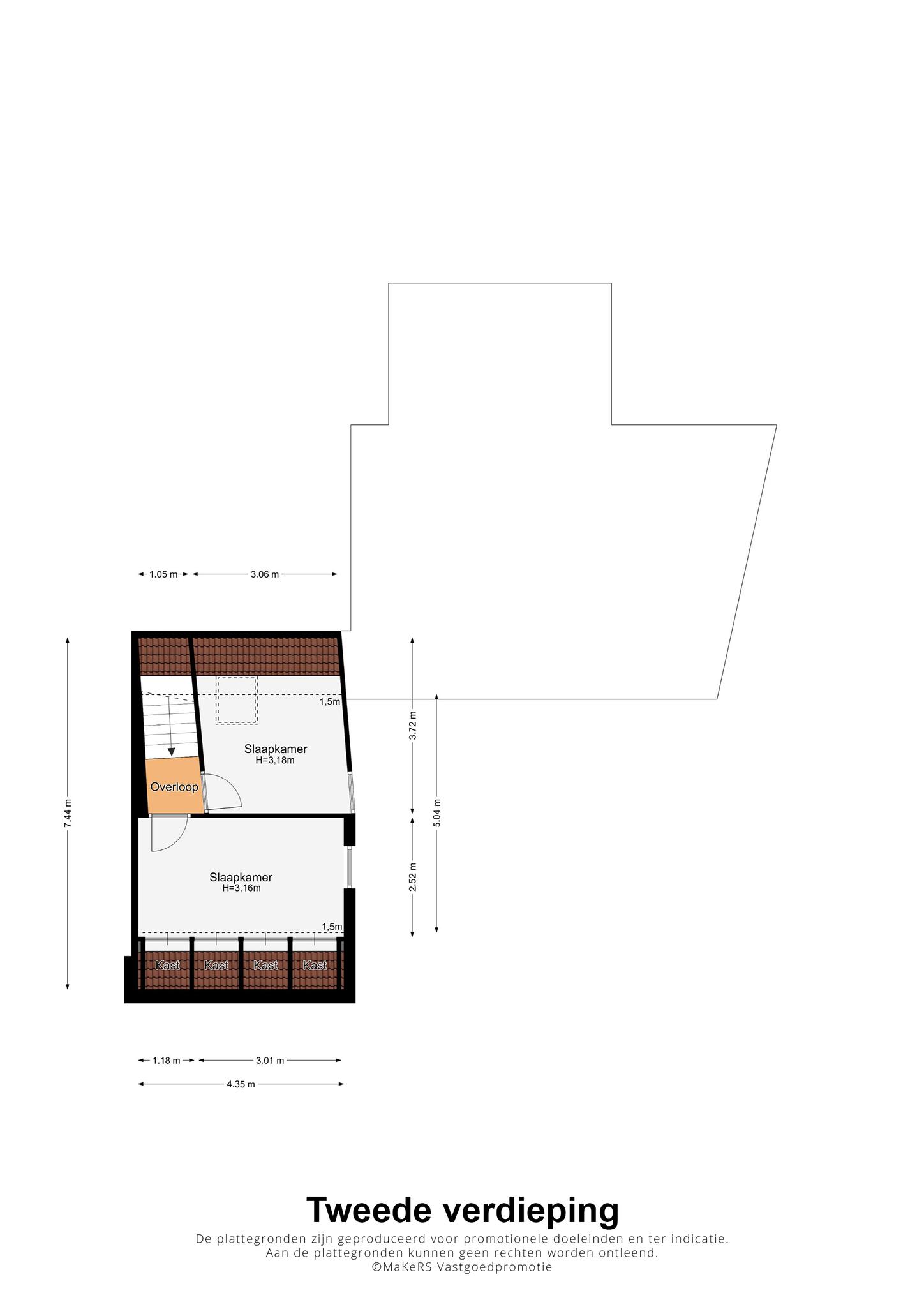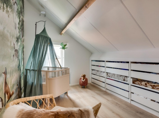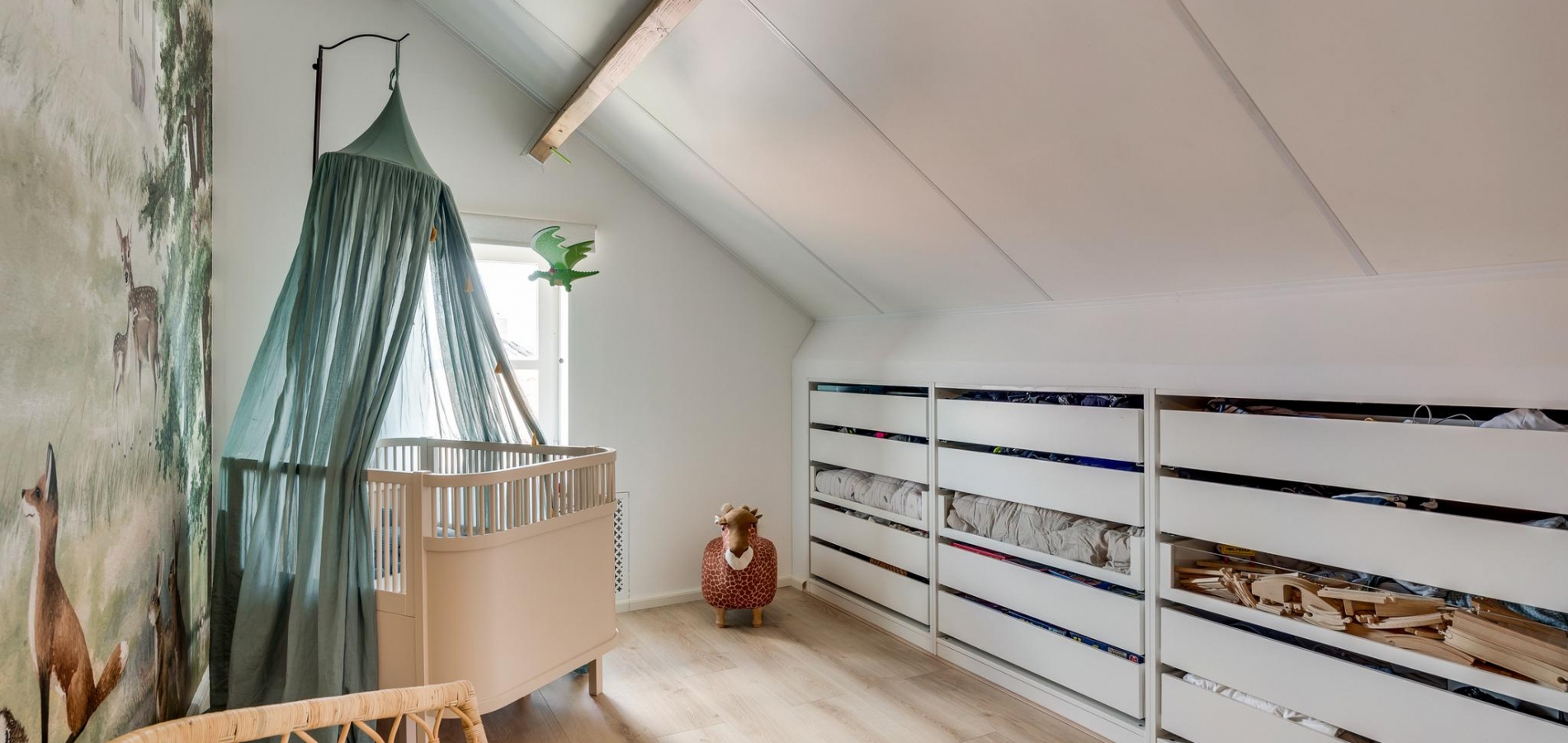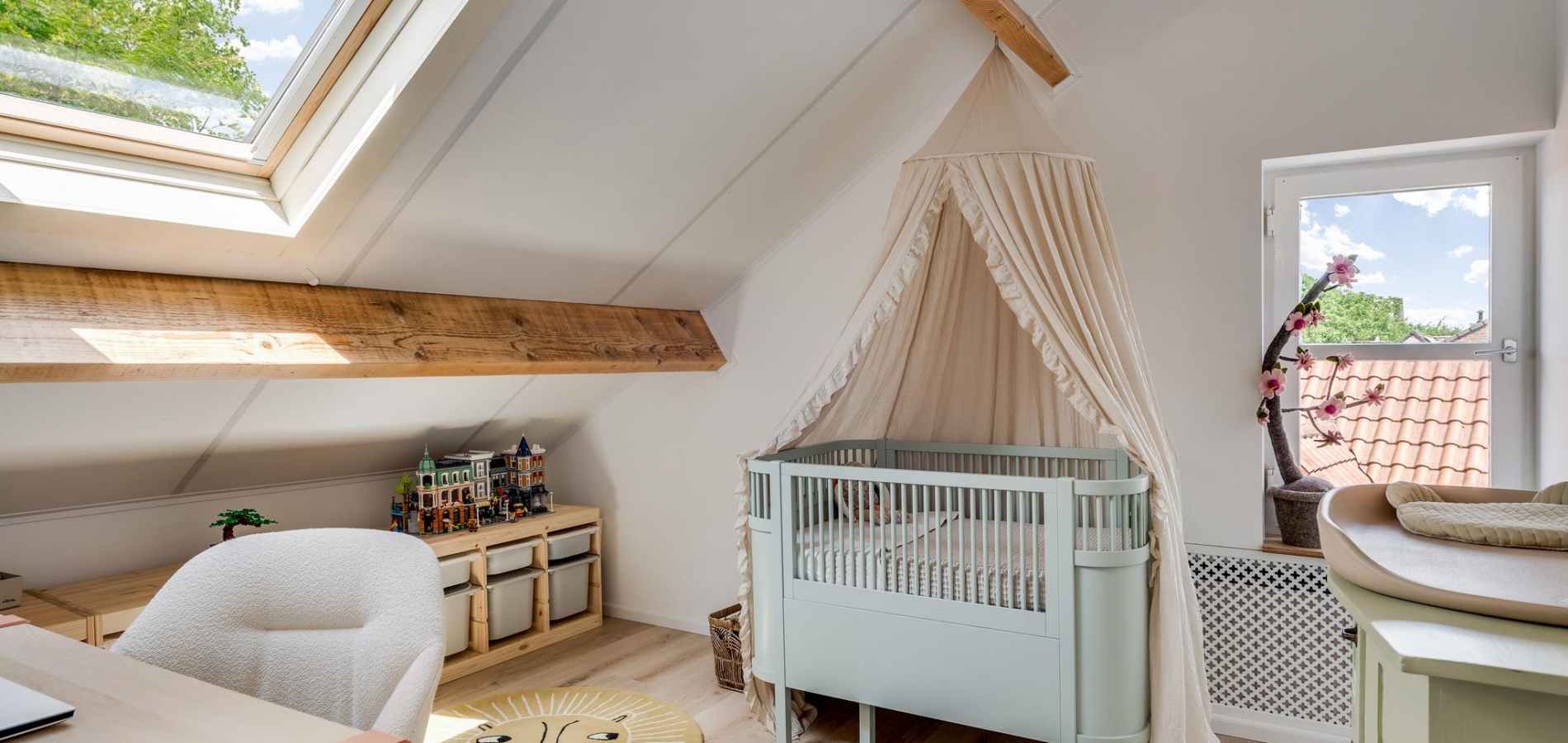 De eikenhouten trap volgt zijn weg naar de tweede verdieping, waar nog twee slaapkamers zijn. Slaapkamer II (4,35 x 2,52) heeft vaste kasten in de schuinte van het dak met brede lades. Aan de achterzijde is slaapkamer III (3,72 x 3,01), die eveneens als kinderkamer is ingericht.
