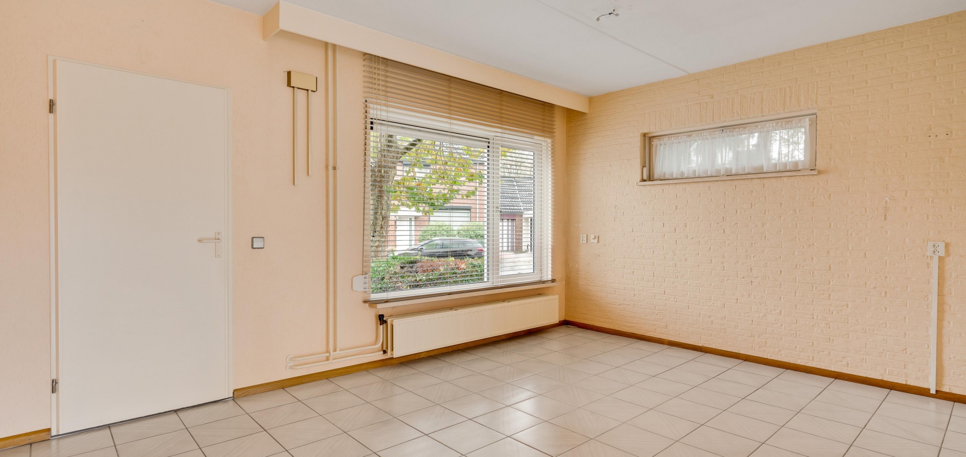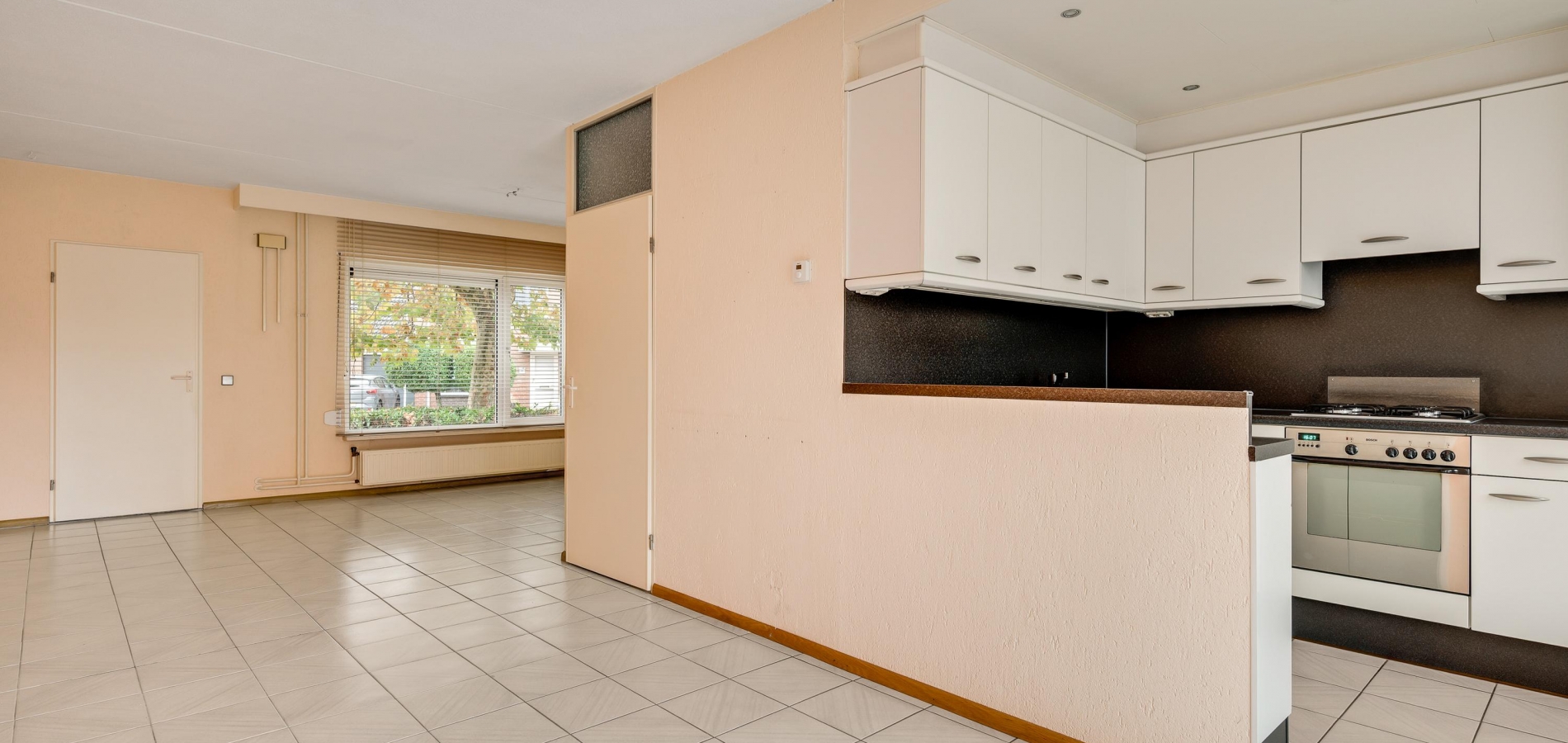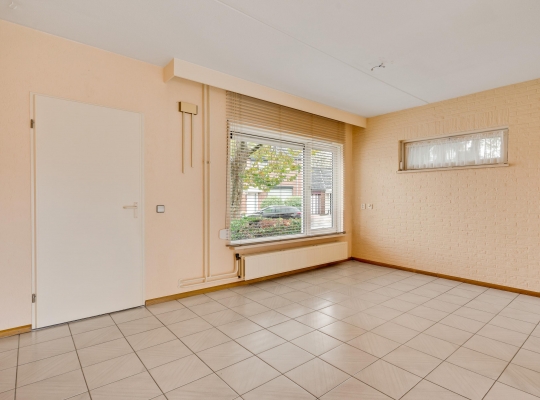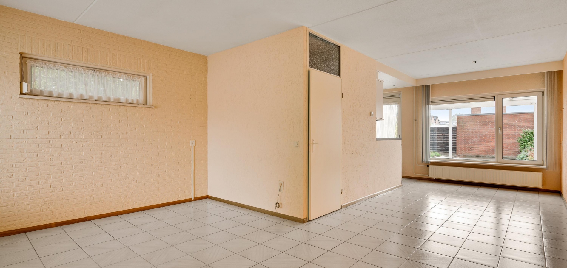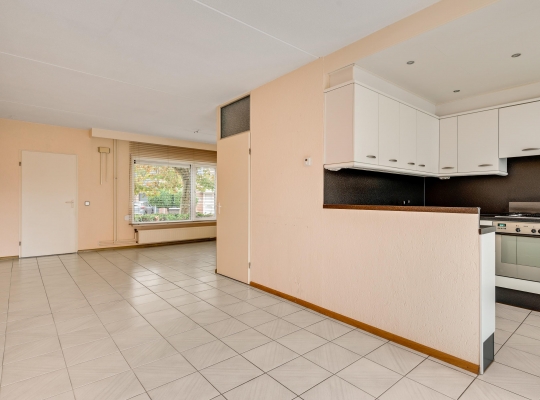 Vanaf de openbare parkeerplekken is het maar een paar stappen naar de entree van deze hoekwoning. Via de hal (circa 1,66 x 1,39) loop je naar de L-vormige woonkamer (circa 30 m2). Nu is de woonkamer leeg, maar de meest logische indeling is het zitgedeelte aan de voorzijde en het eetgedeelte aan de achterzijde.