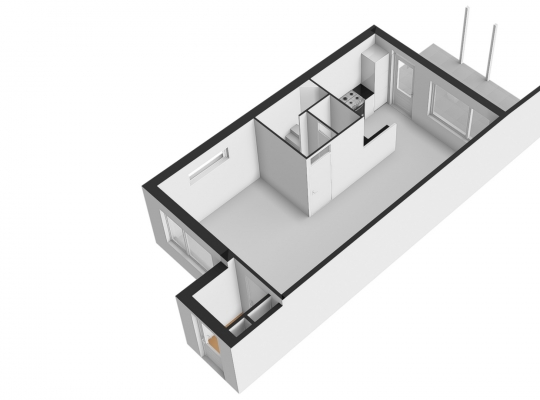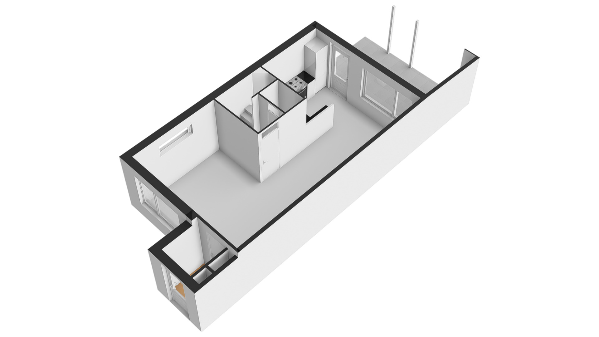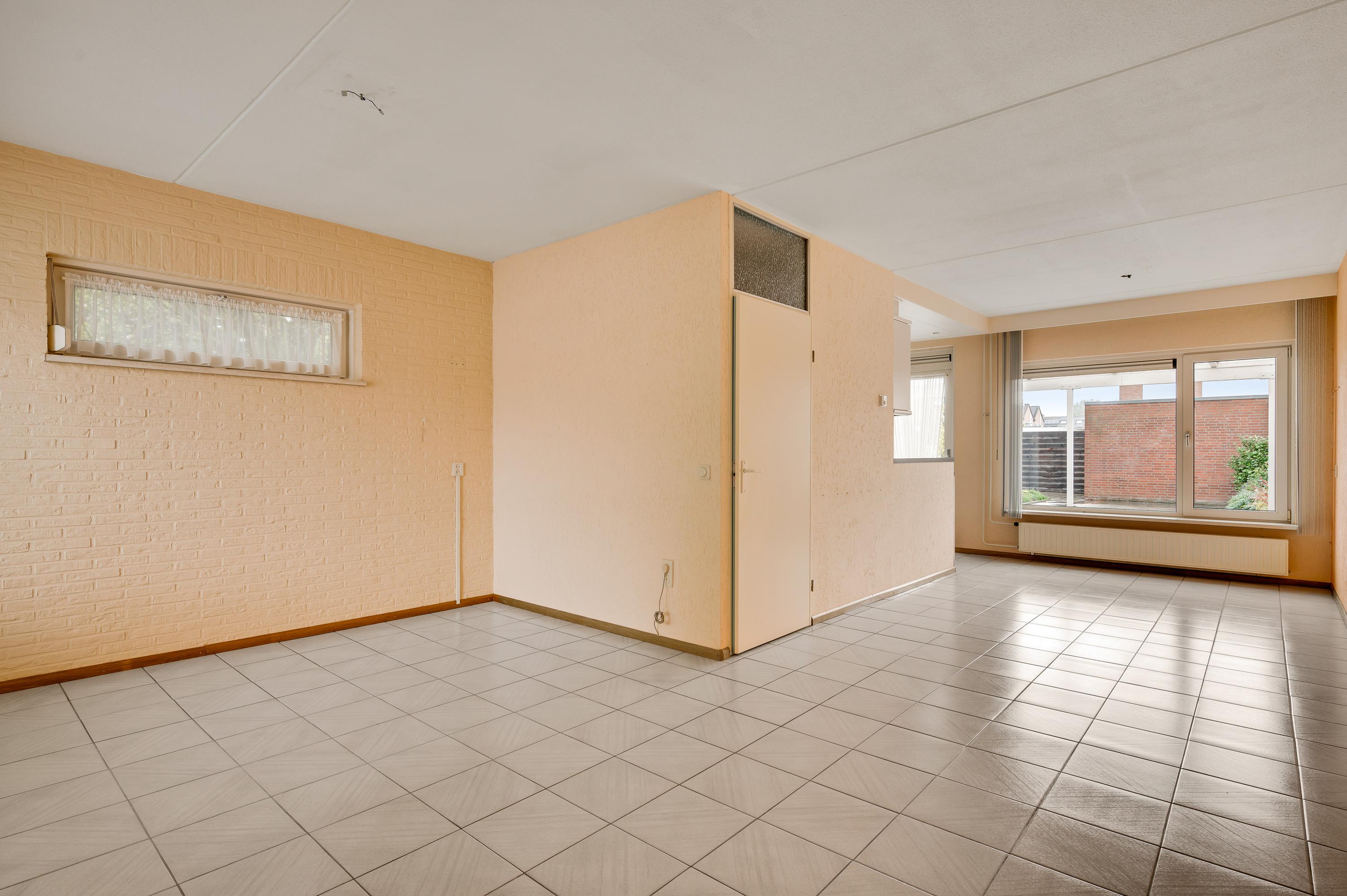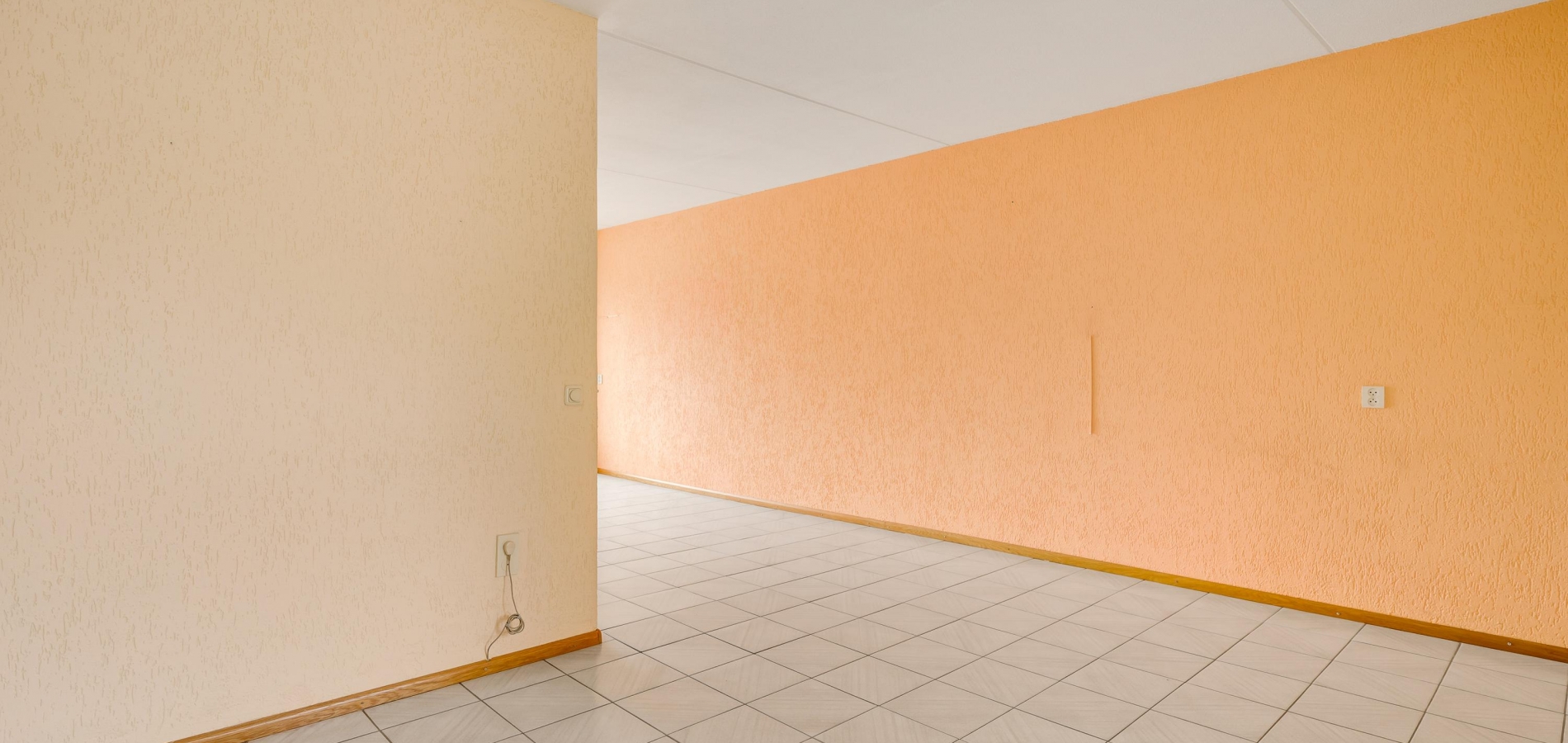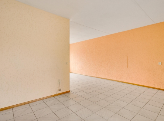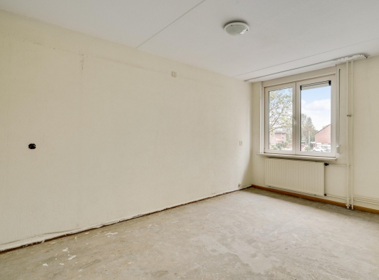 Vanaf de openbare parkeerplekken is het maar een paar stappen naar de entree van deze hoekwoning. Via de hal (circa 1,66 x 1,39) loop je naar de L-vormige woonkamer (circa 30 m2). Nu is de woonkamer leeg, maar de meest logische indeling is het zitgedeelte aan de voorzijde en het eetgedeelte aan de achterzijde.