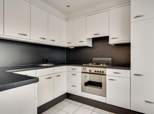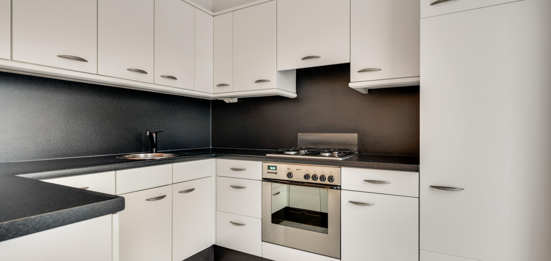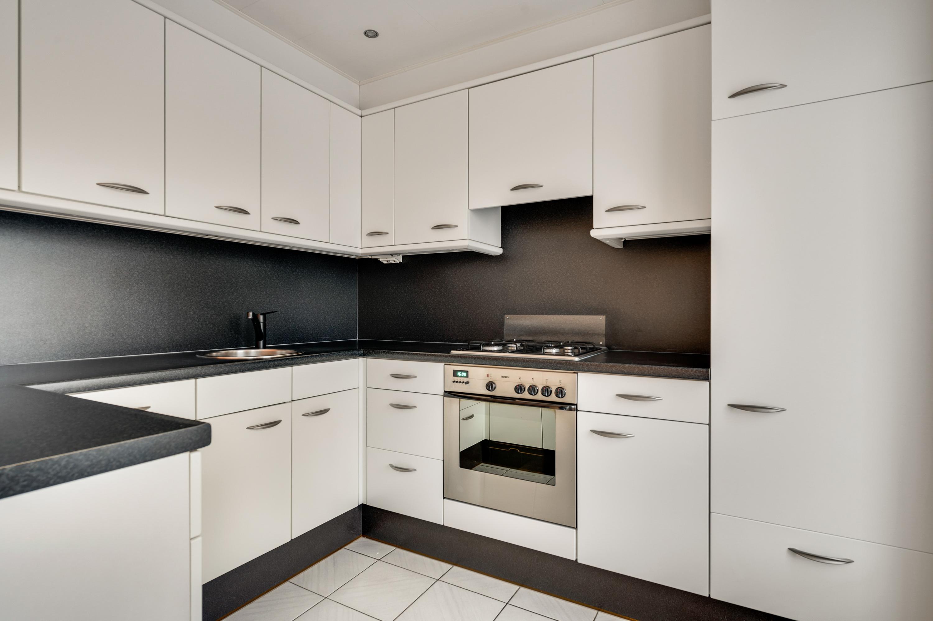In de halfopen keuken (circa 2,71 x 2,09) staat een lichte U-opstelling met een granietlook aanrechtblad en achterwand. De gaskookplaat, afzuigkap, oven en koelkast zijn ingebouwd. Het halfhoge muurtje zorgt voor verbinding met het eetgedeelte, terwijl je vanaf tafel het aanrecht niet ziet. Er ligt, net als in de woonkamer, een lichte tegelvloer in de keuken.