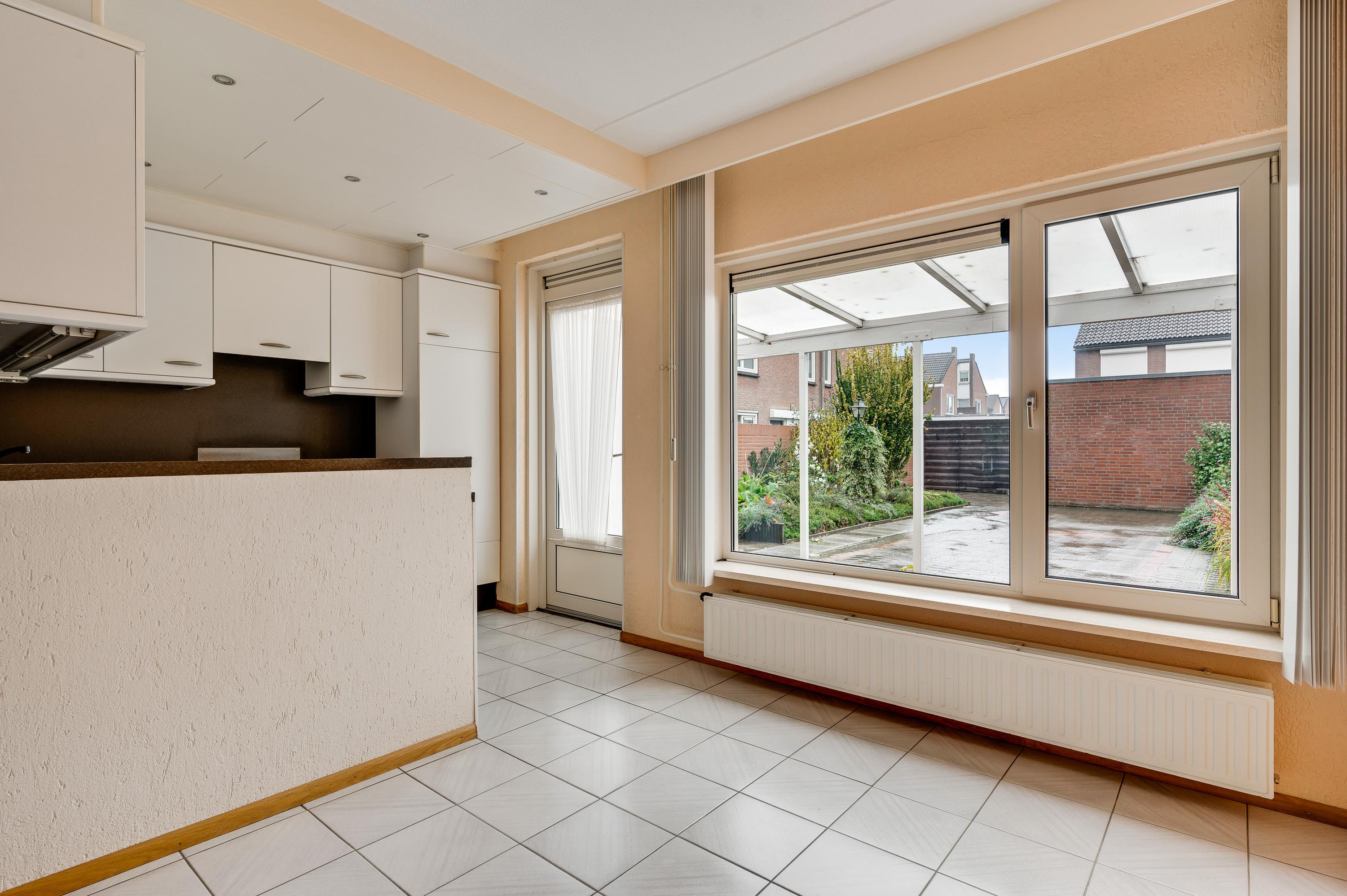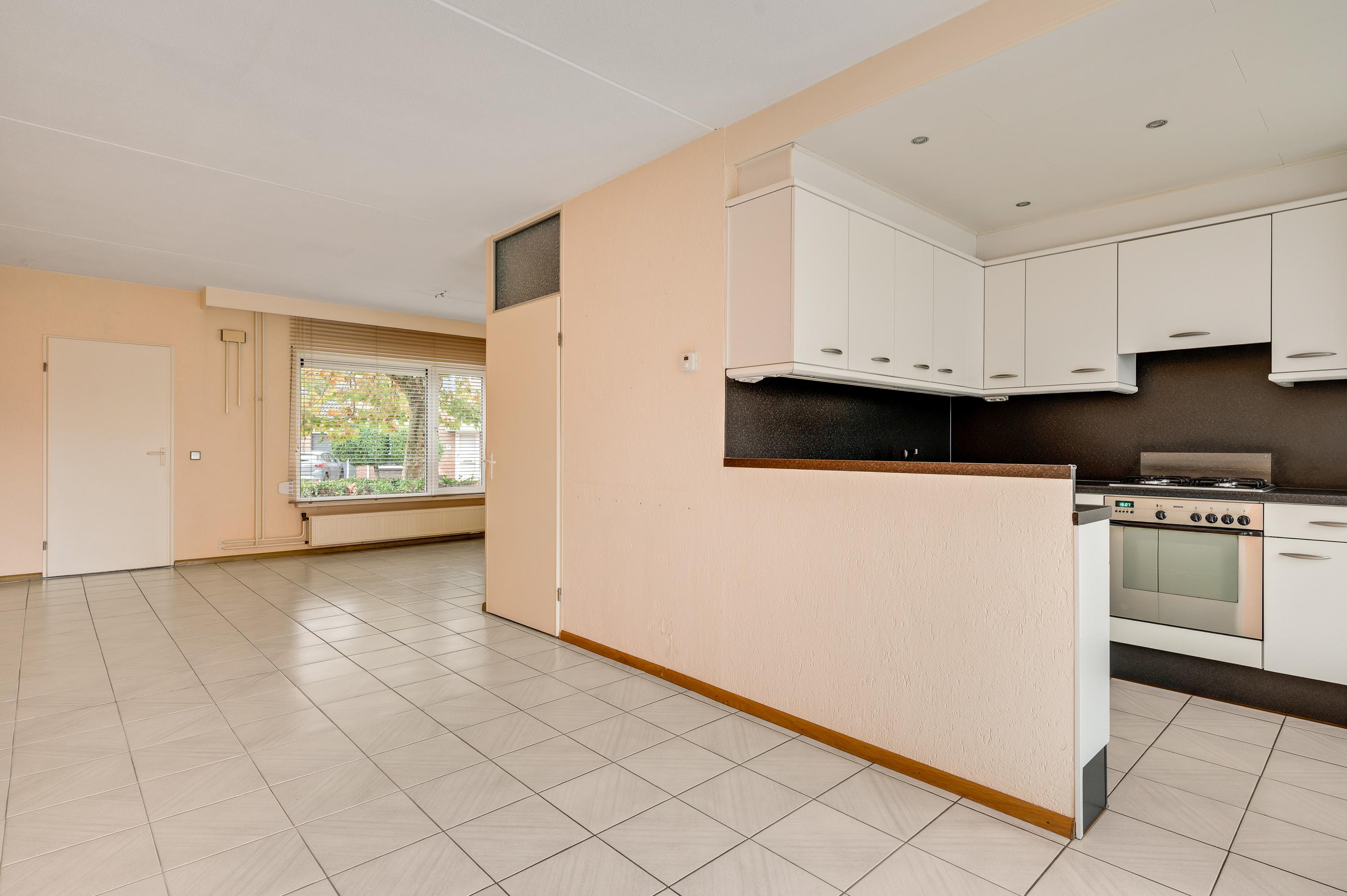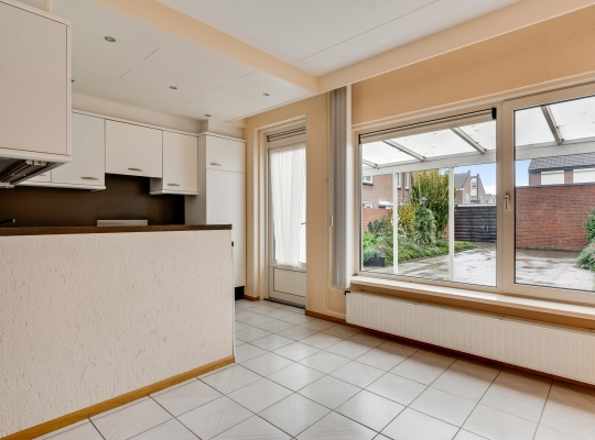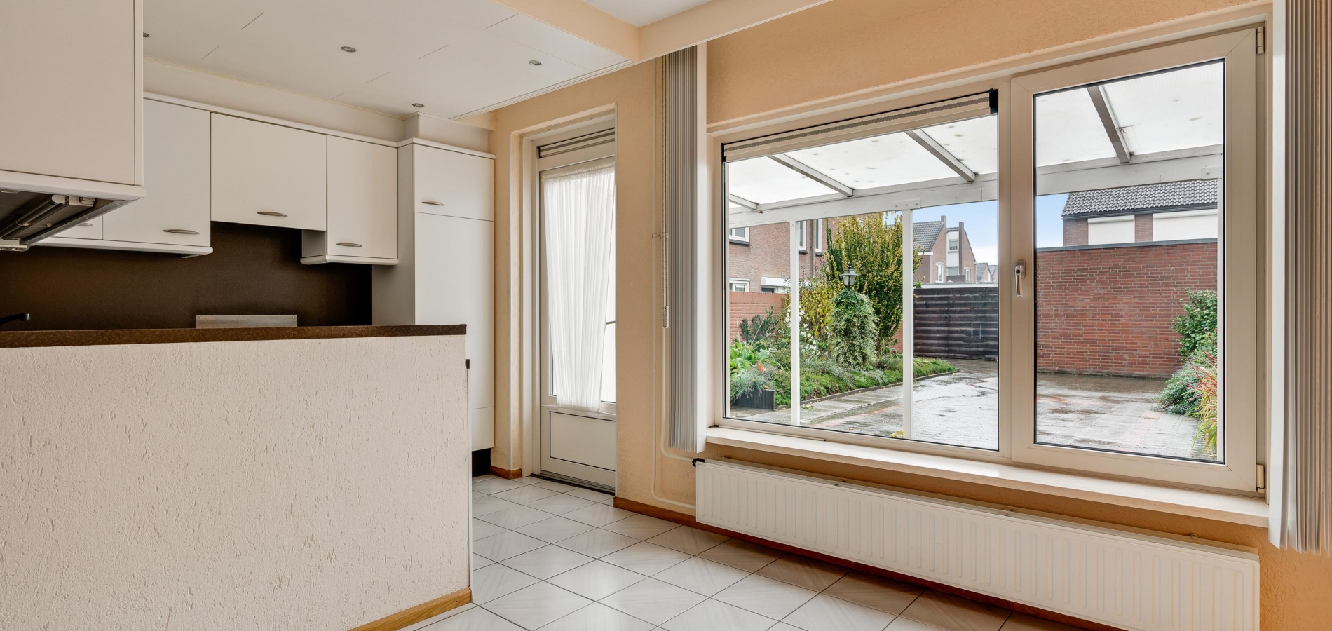 In de halfopen keuken (circa 2,71 x 2,09) staat een lichte U-opstelling met een granietlook aanrechtblad en achterwand. De gaskookplaat, afzuigkap, oven en koelkast zijn ingebouwd. Het halfhoge muurtje zorgt voor verbinding met het eetgedeelte, terwijl je vanaf tafel het aanrecht niet ziet. Er ligt, net als in de woonkamer, een lichte tegelvloer in de keuken.