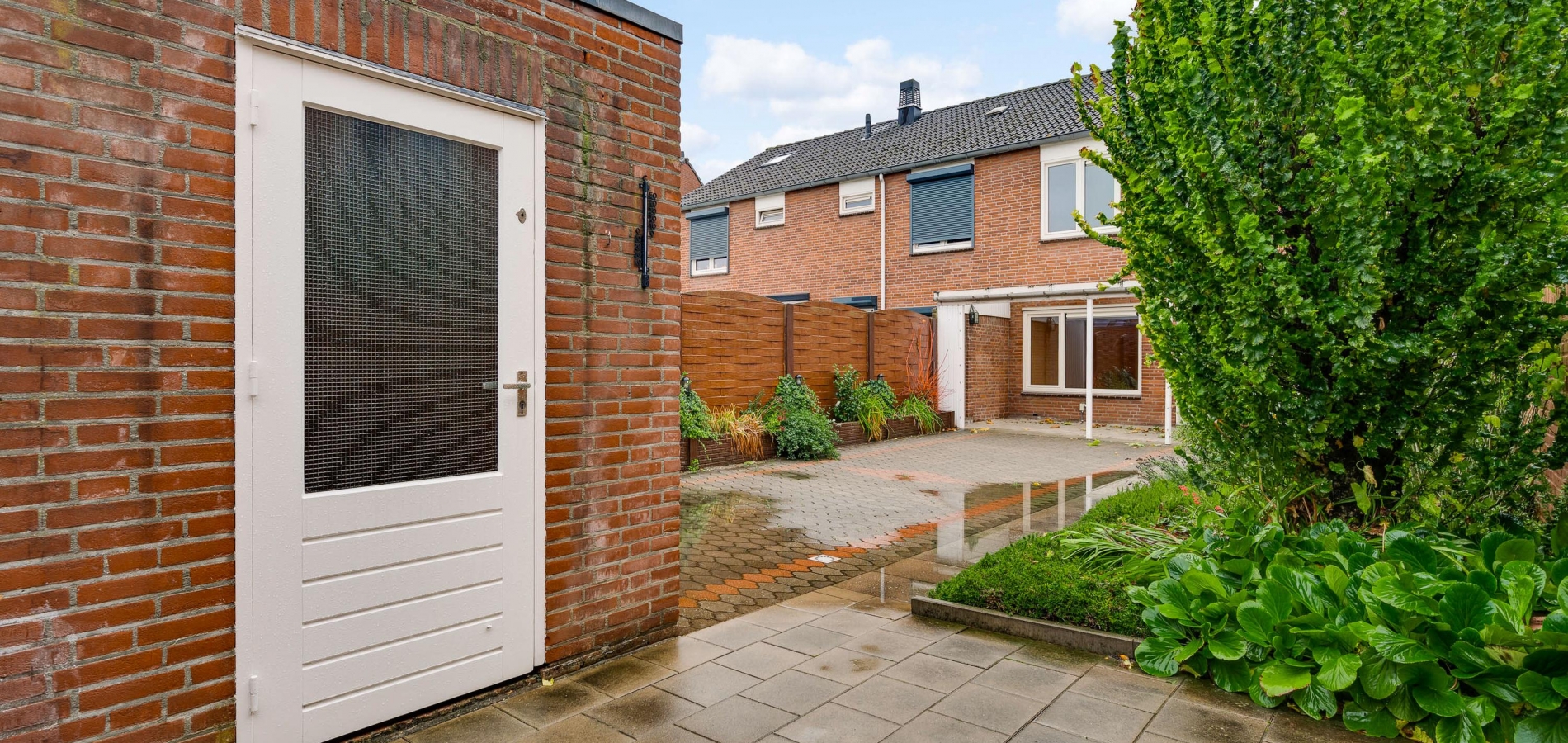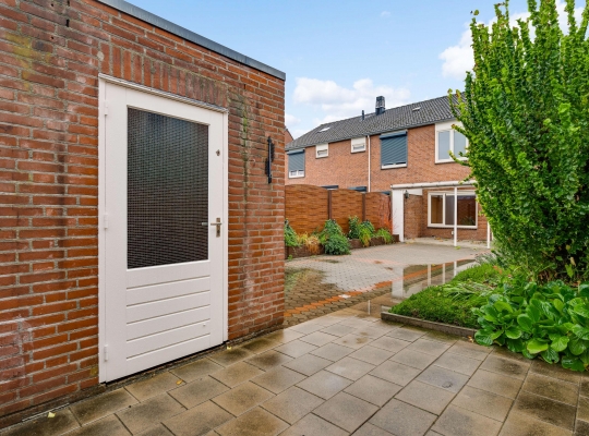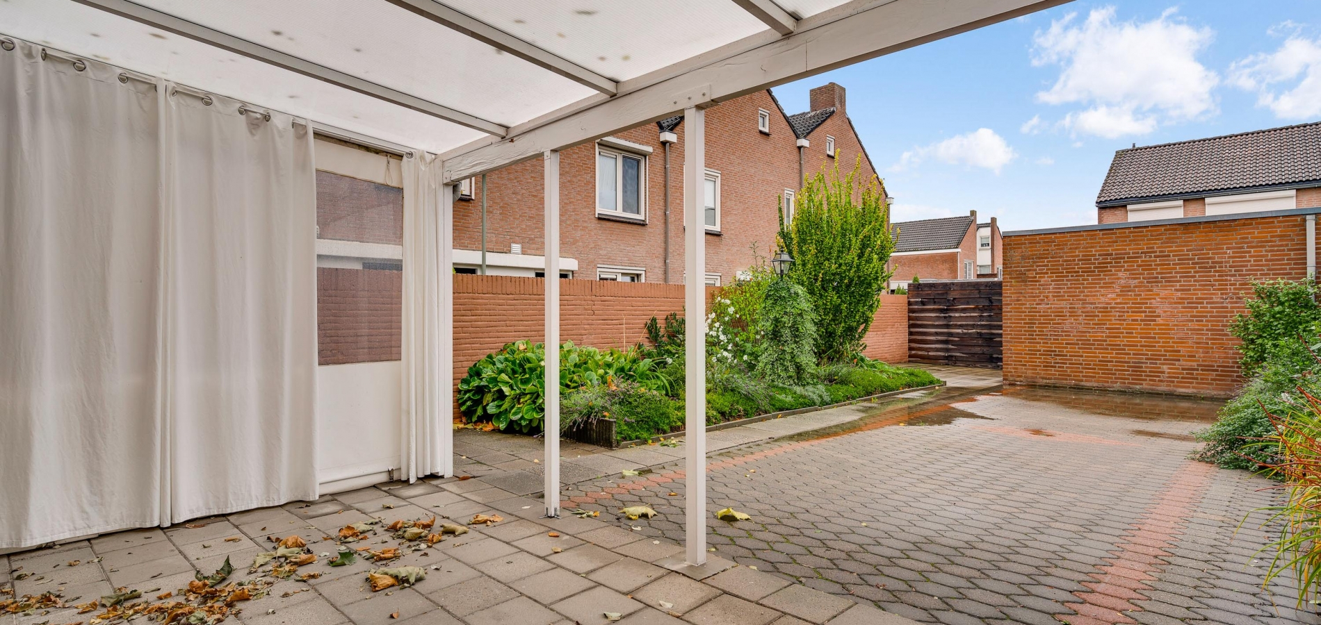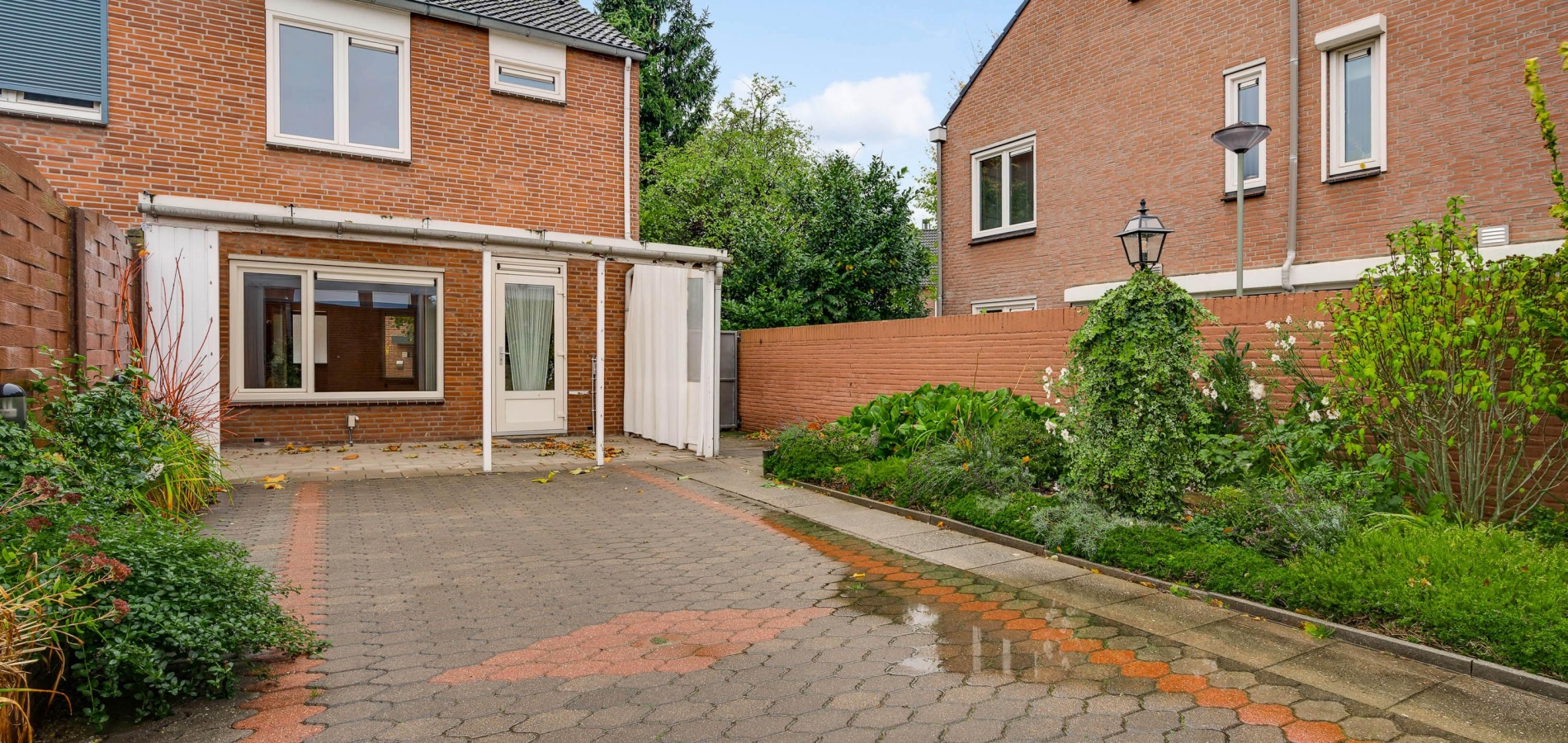 Het overdekte terras (circa 5,07 x 2,88) is een verlengstuk van de woonkamer en keuken. De aansluitende tuin is aangelegd met bestrating en twee borders, waarin een grote variatie aan beplanting staat. In de berging (circa 3,88 x 2,10) kunnen de fietsen staan.