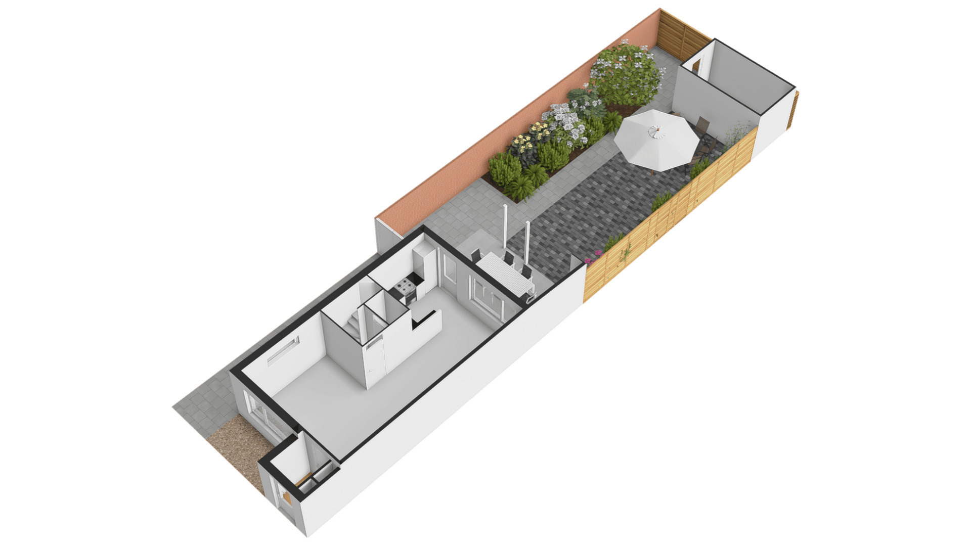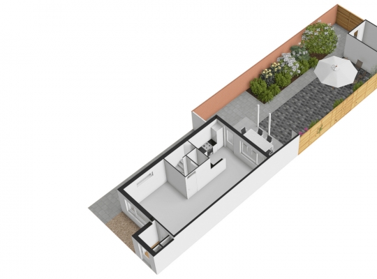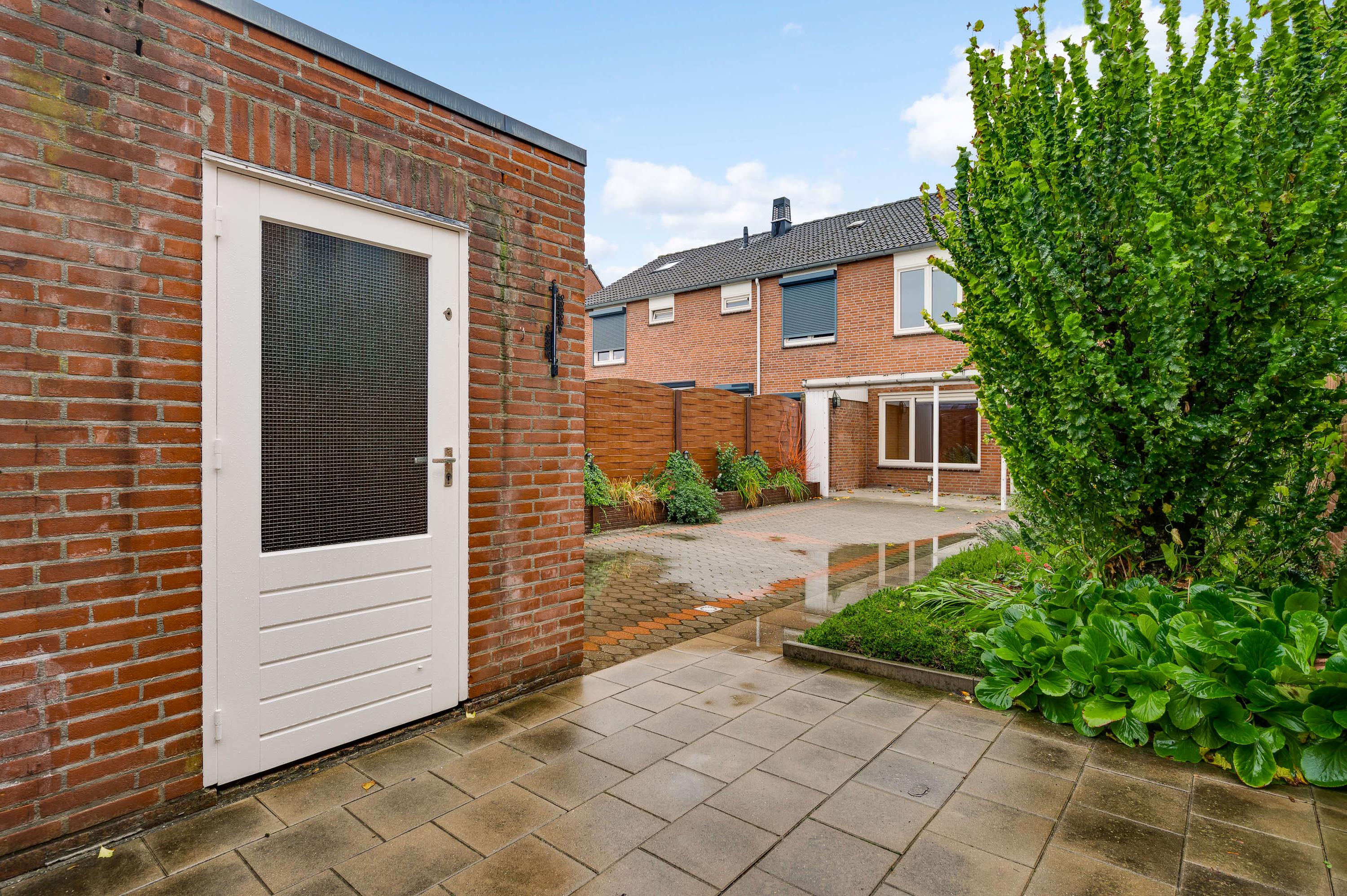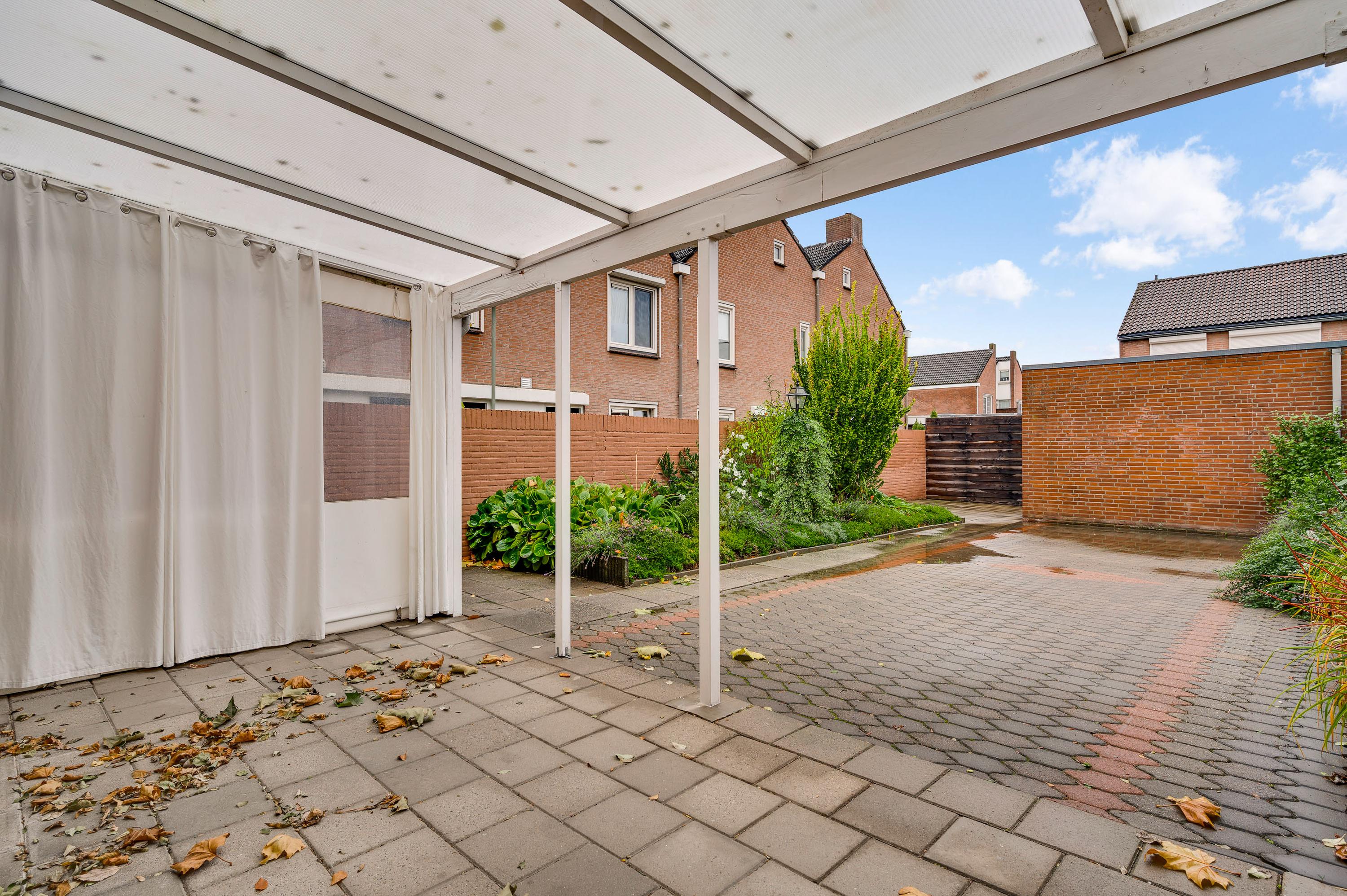Het overdekte terras (circa 5,07 x 2,88) is een verlengstuk van de woonkamer en keuken. De aansluitende tuin is aangelegd met bestrating en twee borders, waarin een grote variatie aan beplanting staat. In de berging (circa 3,88 x 2,10) kunnen de fietsen staan.