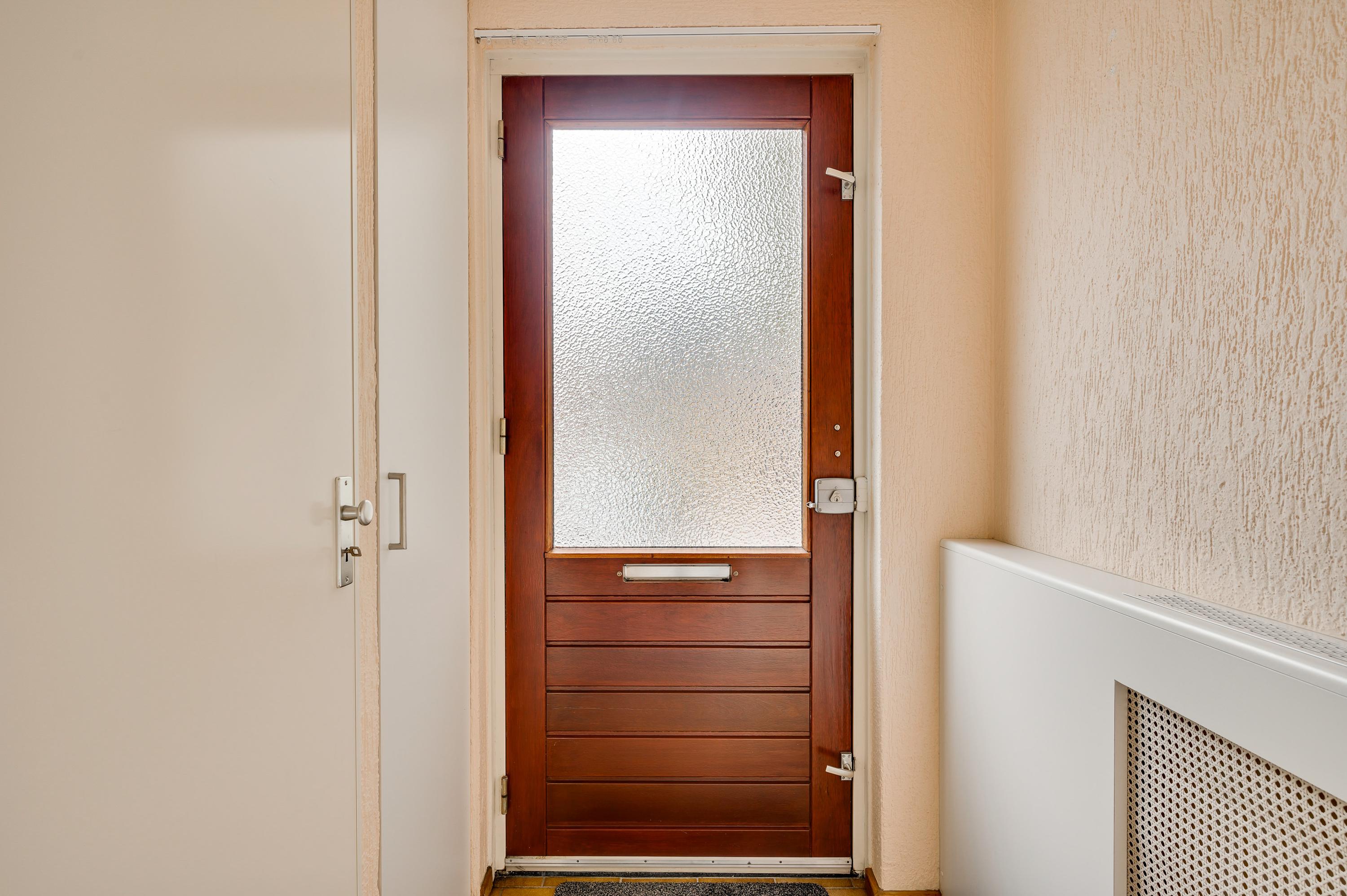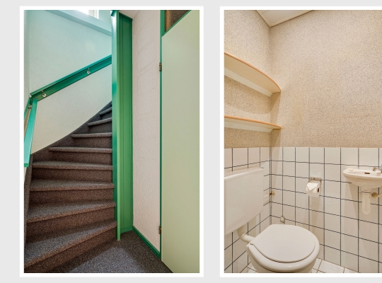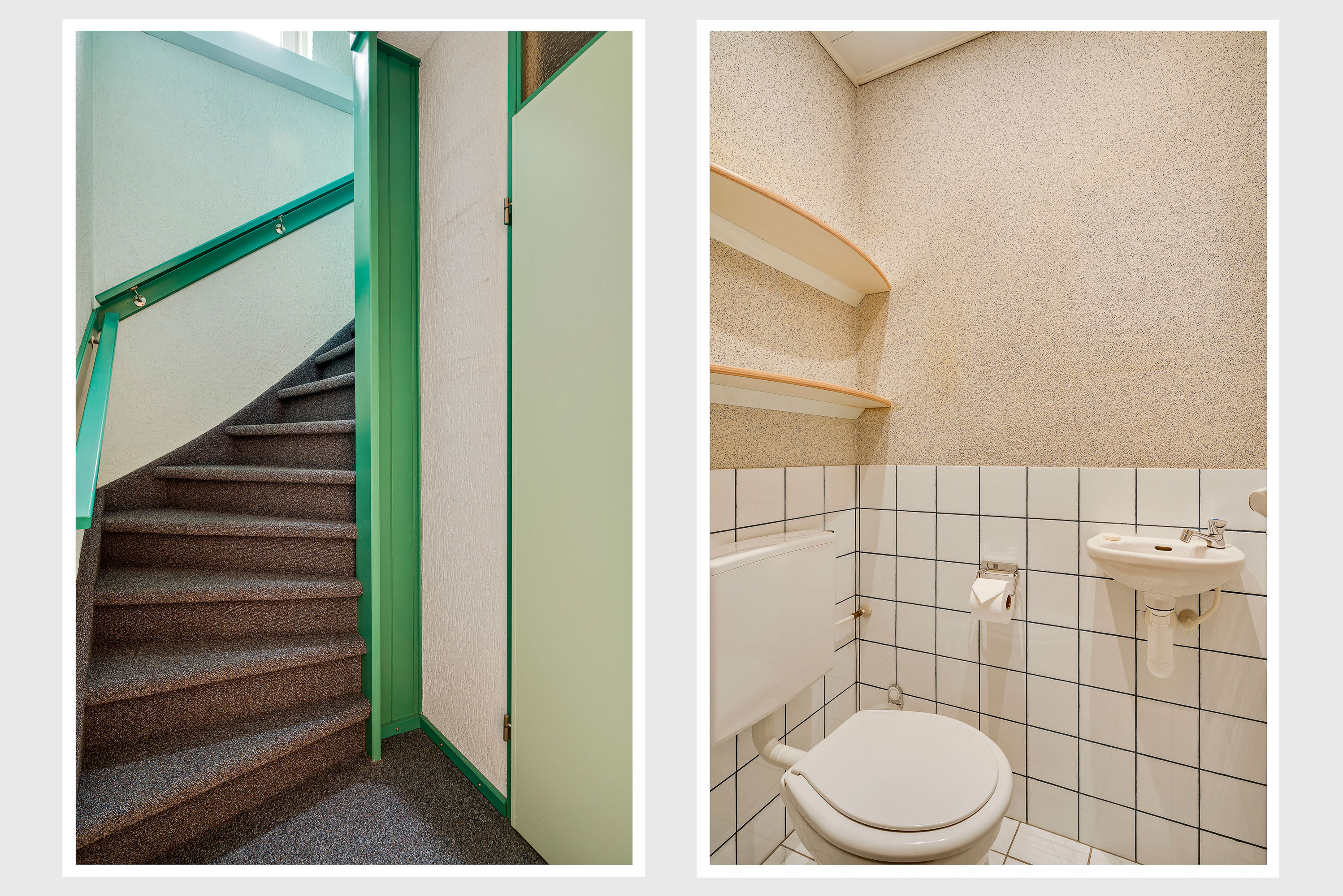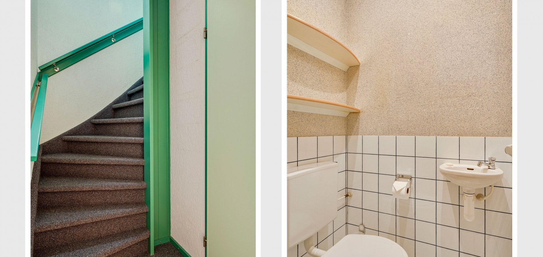Vanuit de woonkamer is het trapportaal te bereiken, dat tevens de plek is van de toiletruimte met fonteintje. Op de vloer van het portaal en op de trap ligt donker tapijt. Het raam in de zijgevel zorgt voor lichtinval.