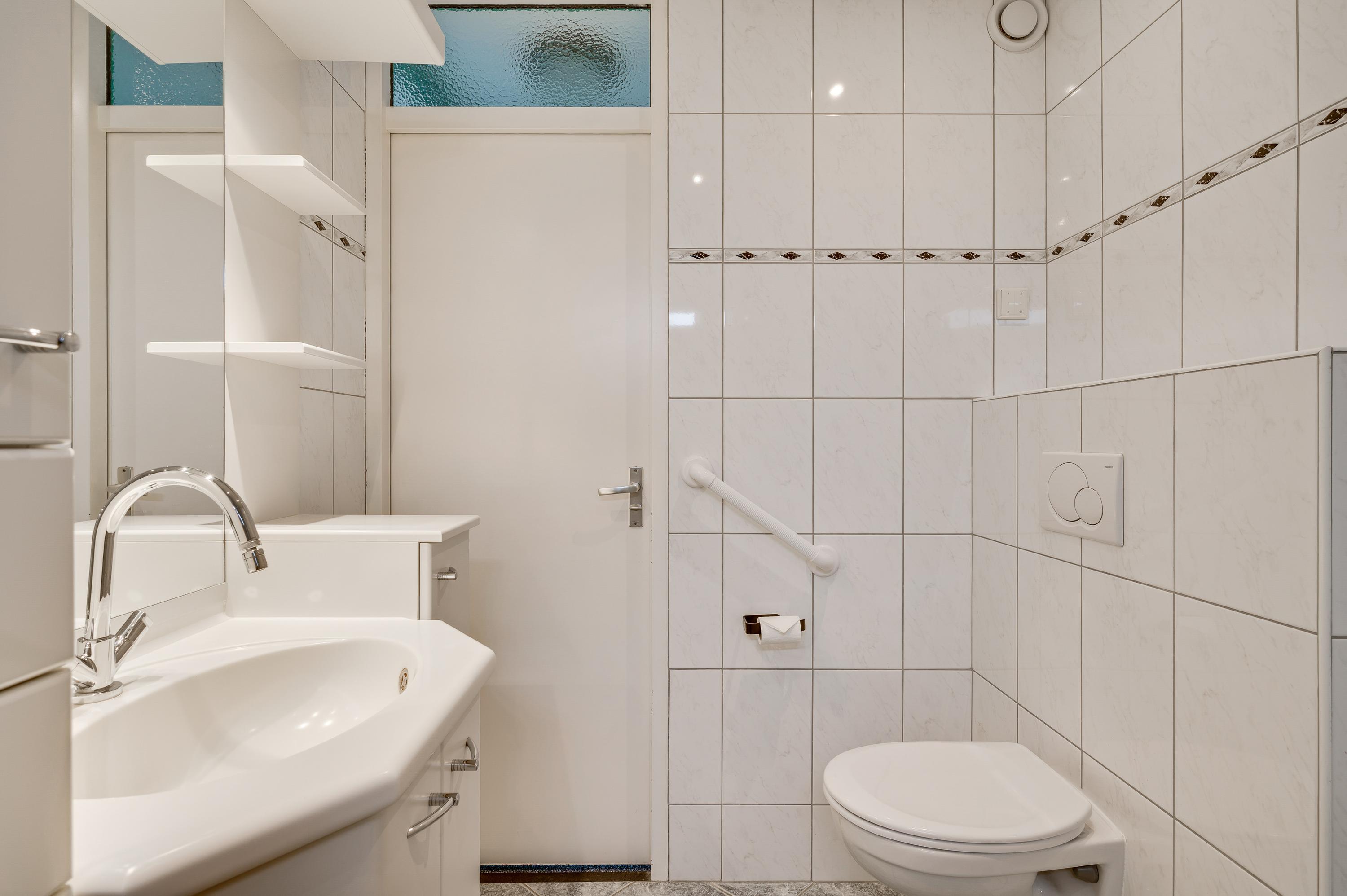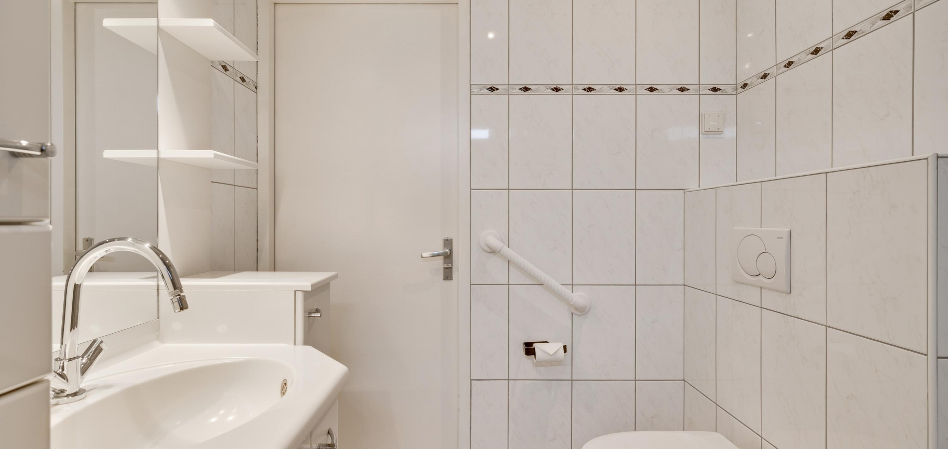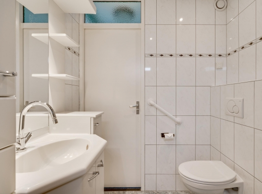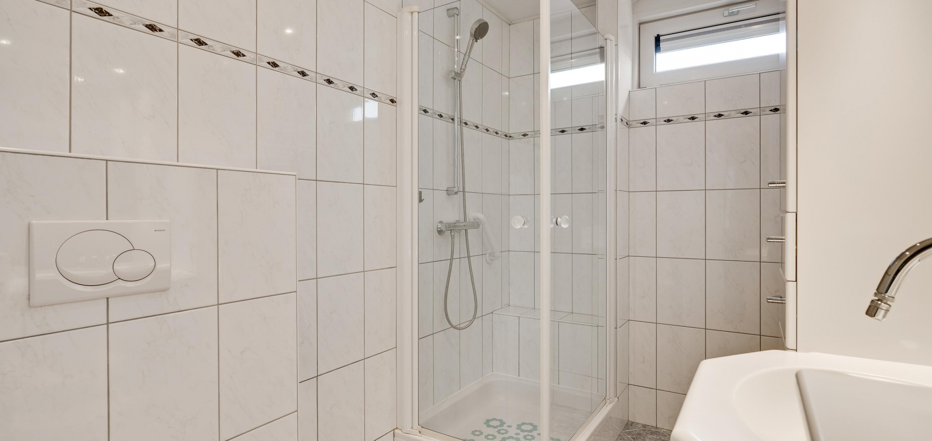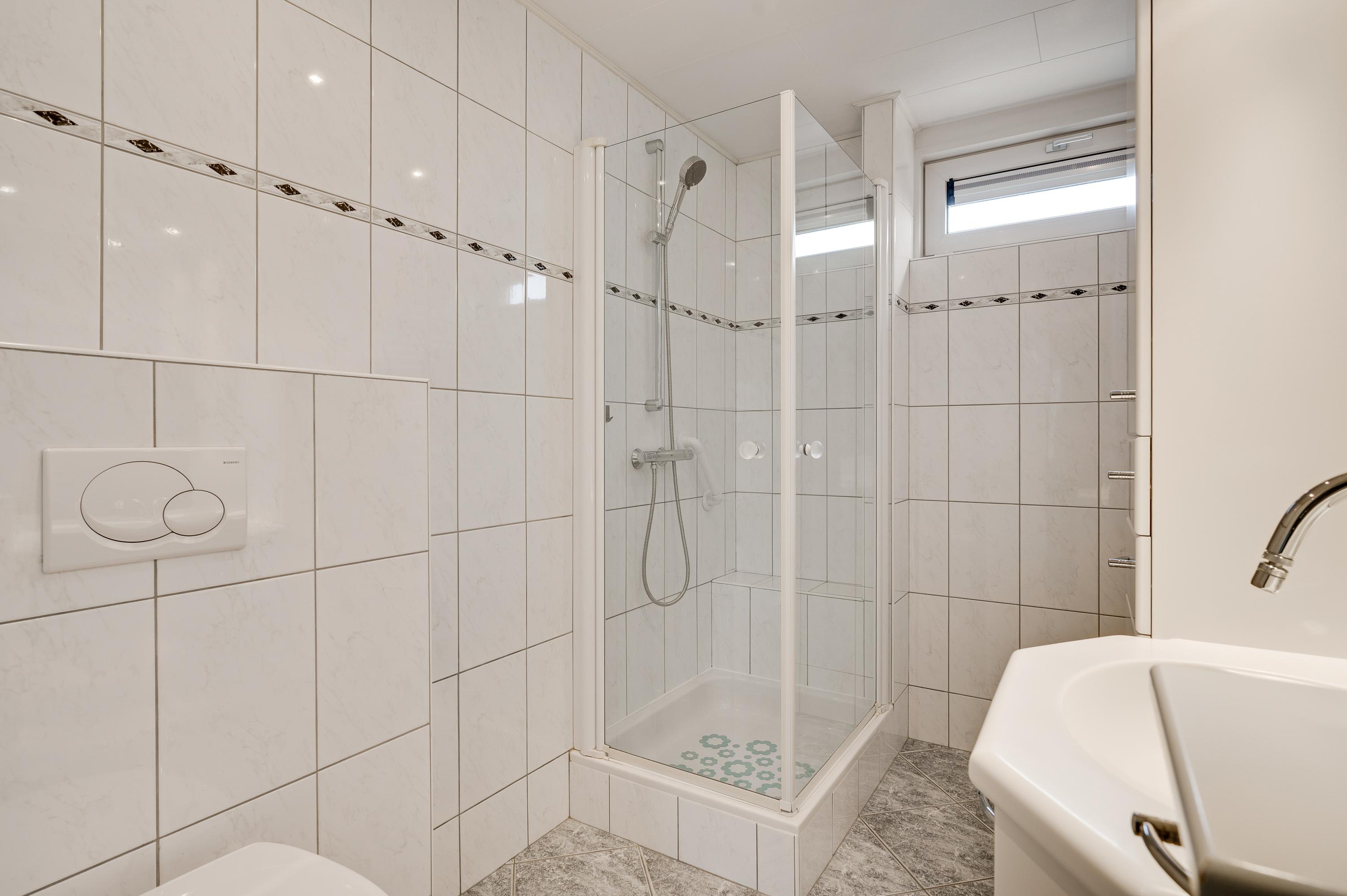 Naast deze kamer is de badkamer (circa 2,71 x 1,79) met een douche, een wandcloset en een groot wastafelmeubel. De wanden zijn geheel betegeld in een lichte kleurstelling en het raam met rooster zorgt ervoor dat de badkamer goed geventileerd kan worden.