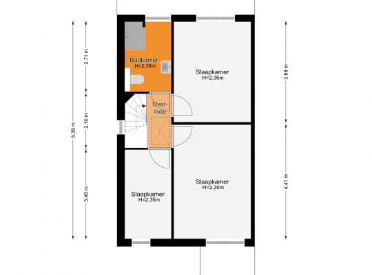 Vanaf de overloop zijn drie slaapkamers en de badkamer te bereiken. Aan de voorzijde zijn slaapkamer I (circa 4,41 x 2,97) en slaapkamer II (circa 3,45 x 1,79). Slaapkamer III (circa 3,88 x 2,97) bevindt zich aan de achterzijde.