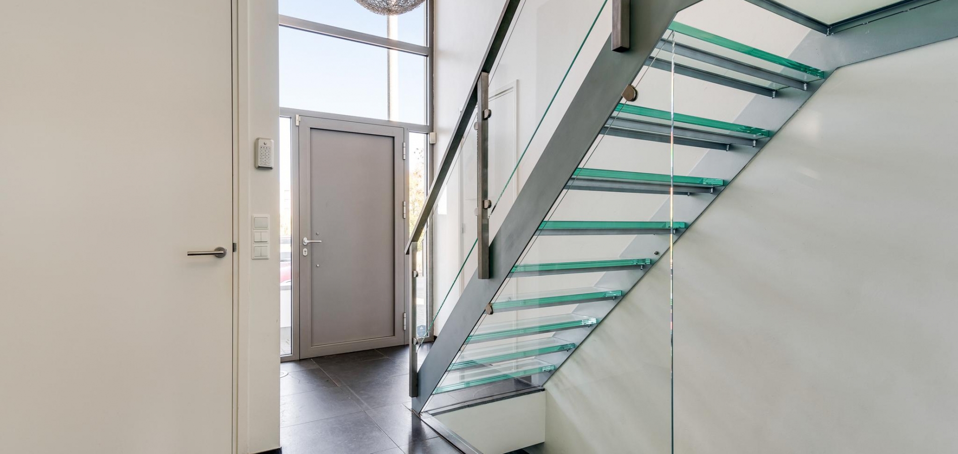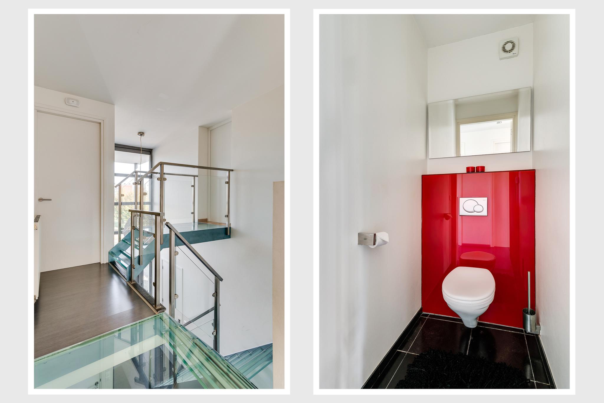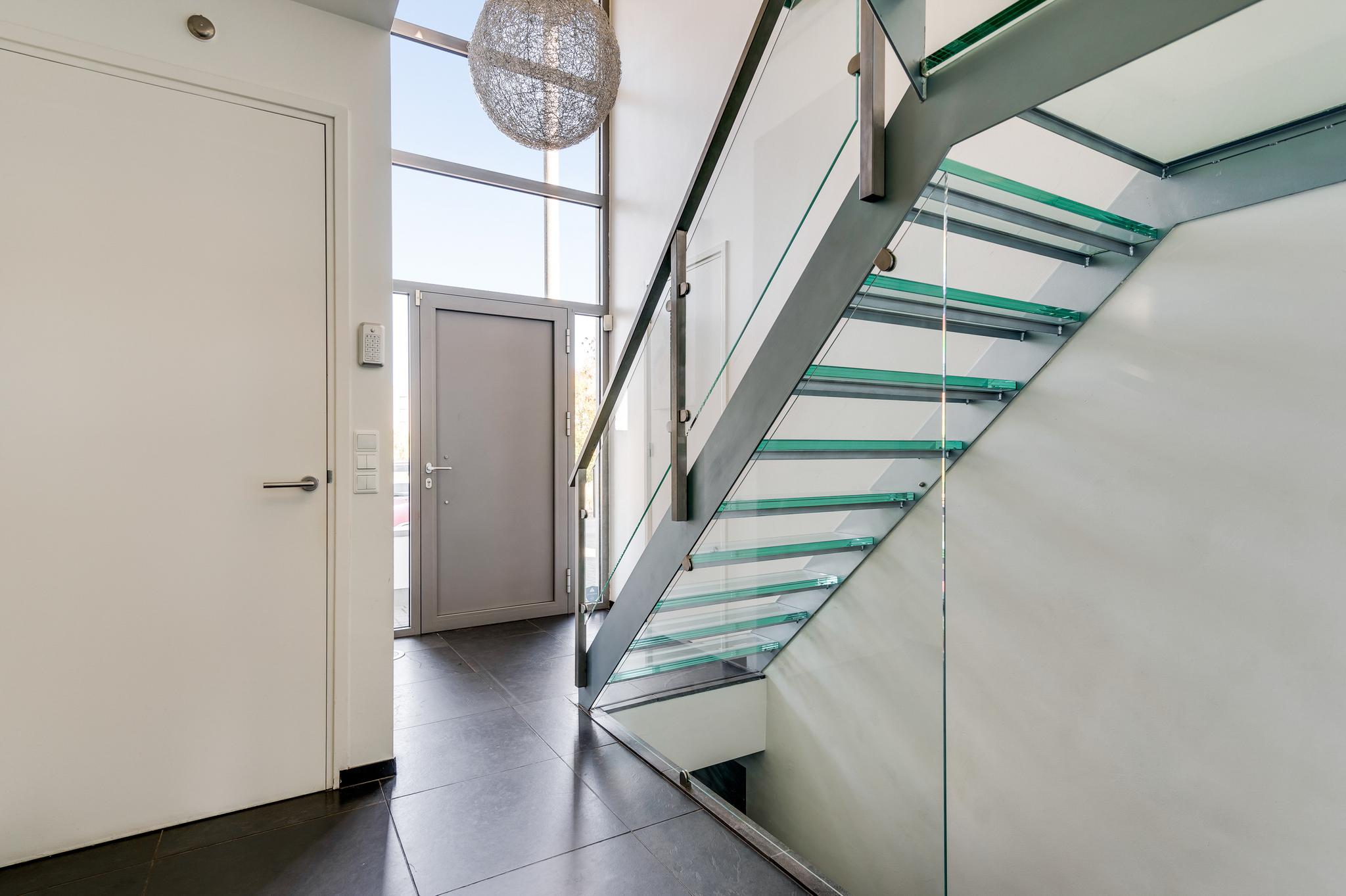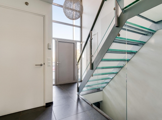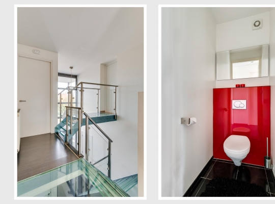 Op de eerste verdieping zijn drie slaapkamers, de badkamer en een separate toiletruimte. Niet alleen de trappen, maar ook een deel van de vloeren is uitgevoerd in glas. De vide en de twee verdiepingen hoge raampartij versterken het gevoel van licht en ruimte.