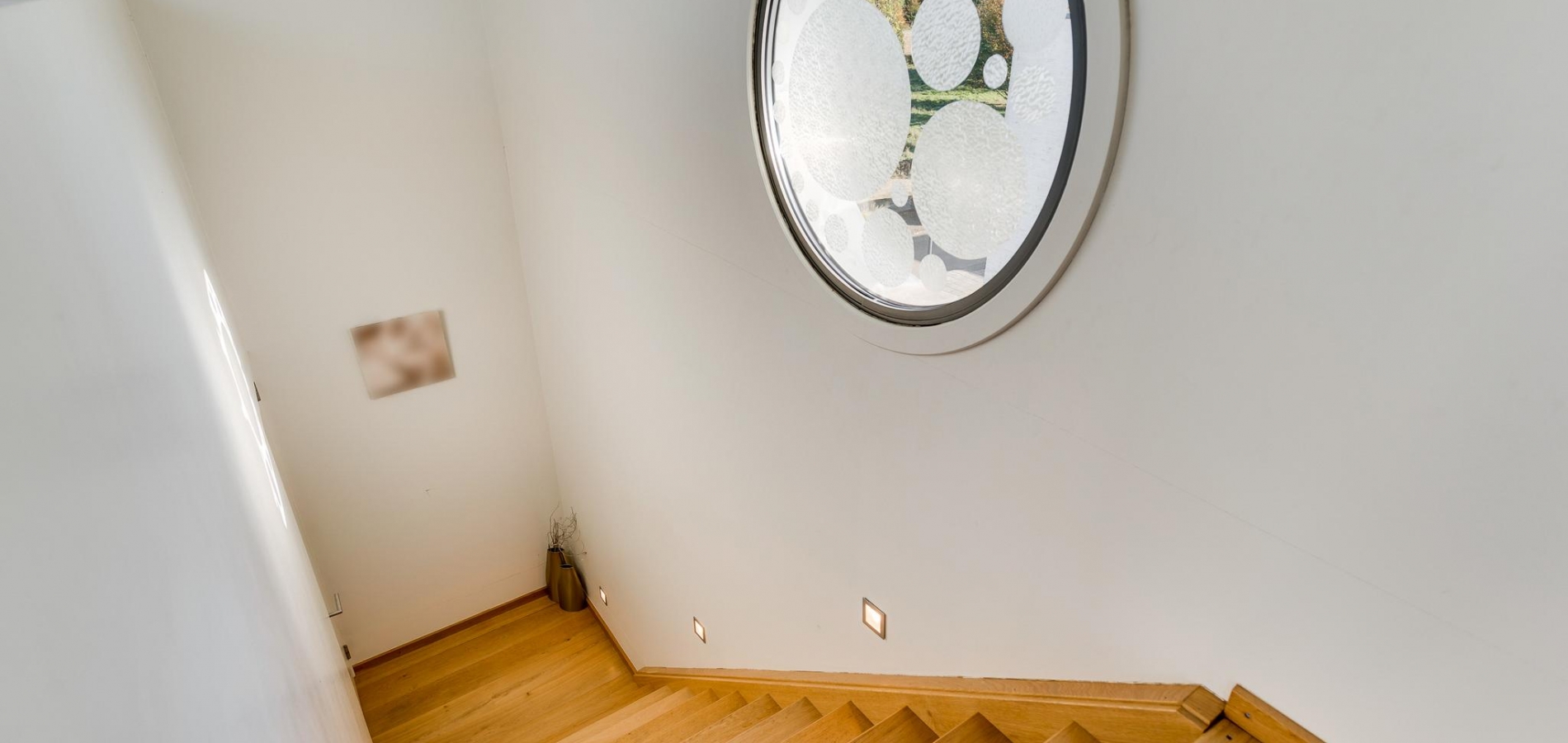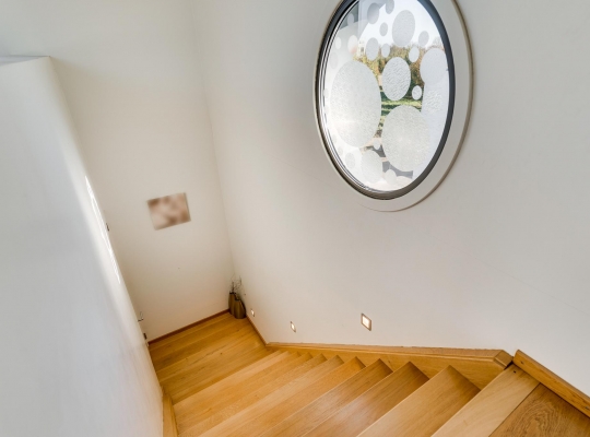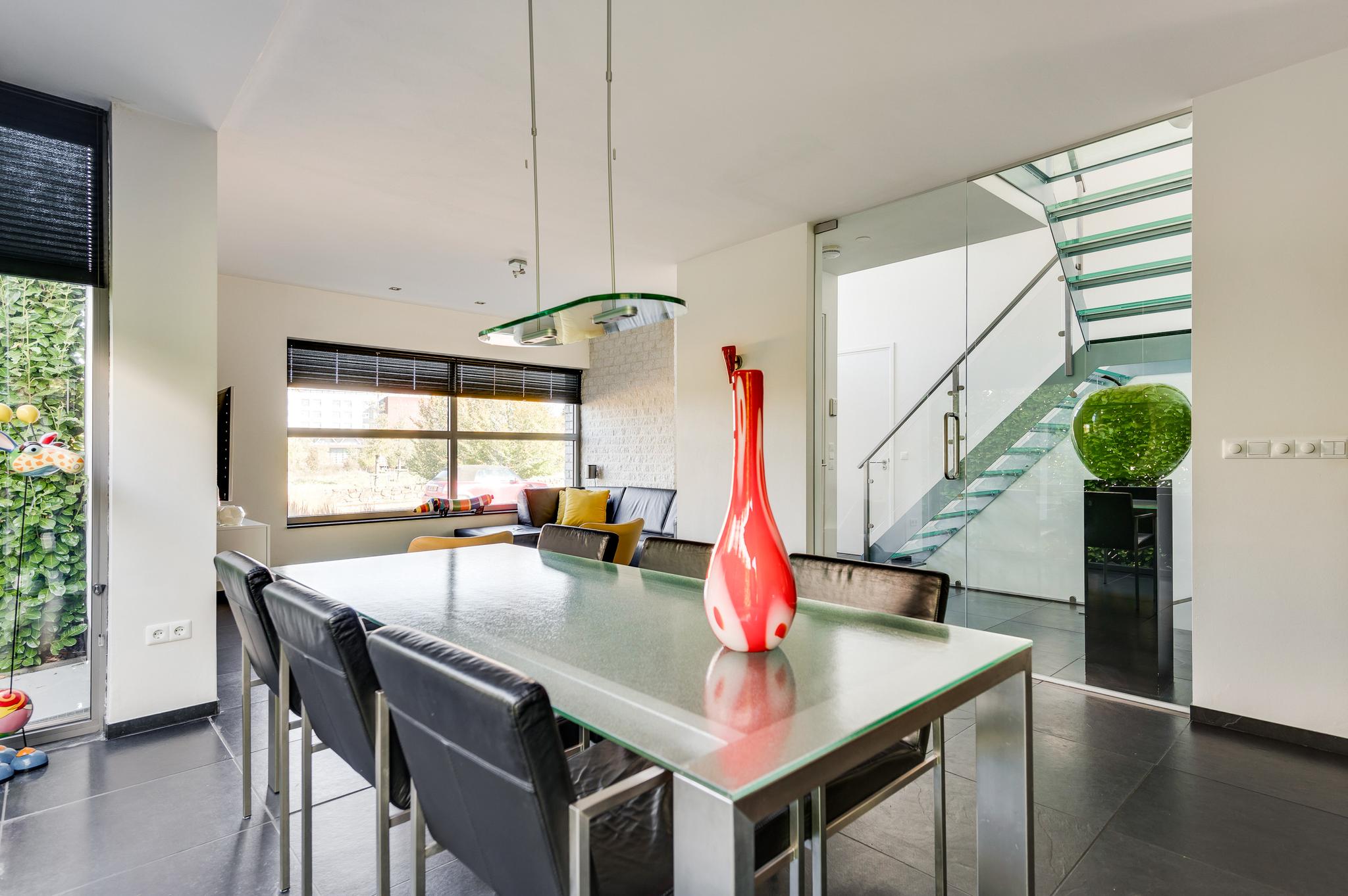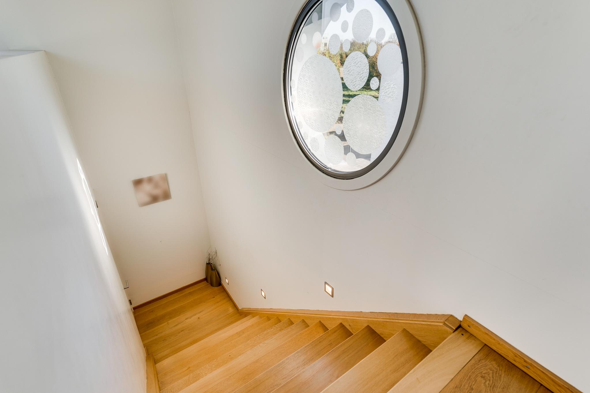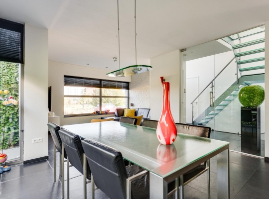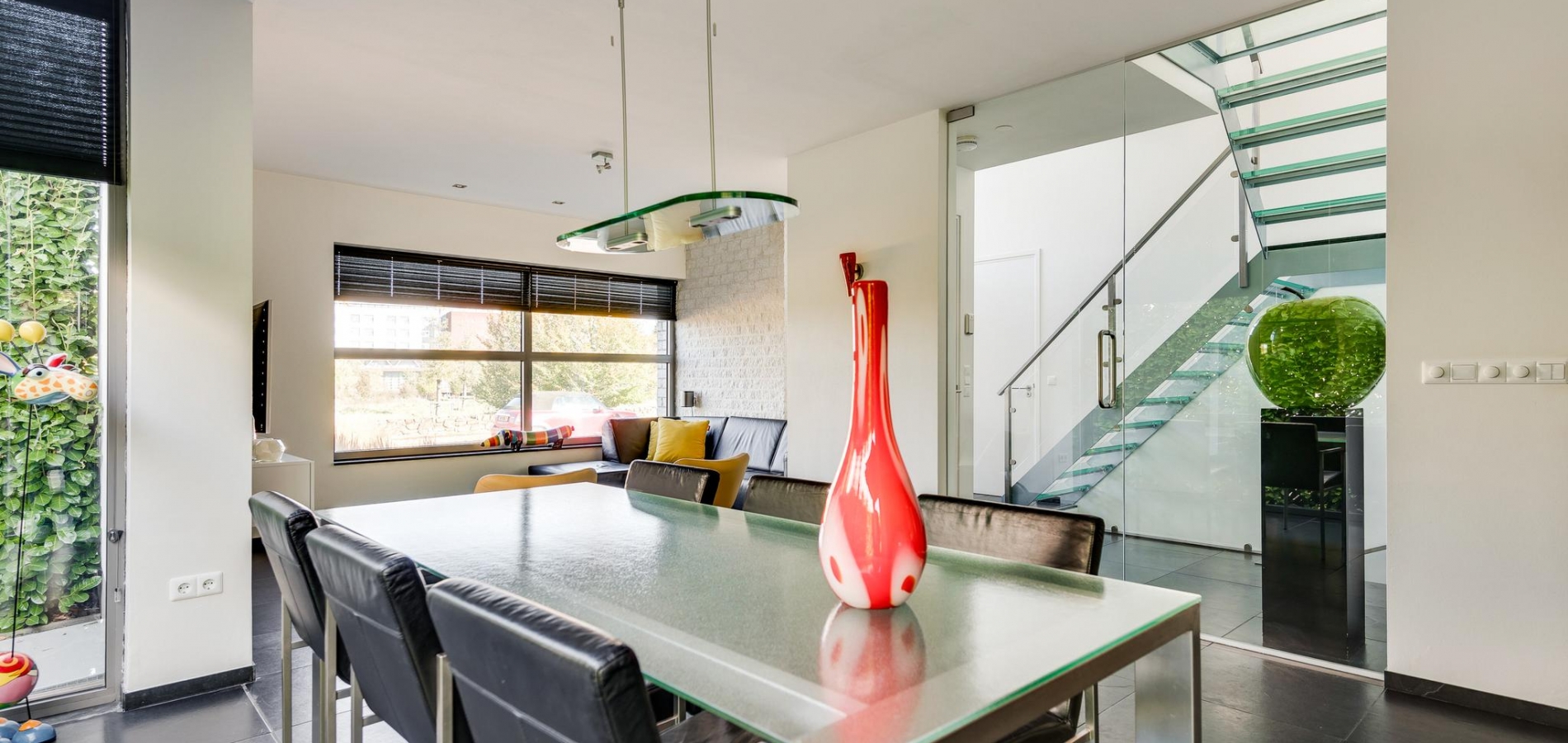 Op de eerste verdieping zijn drie slaapkamers, de badkamer en een separate toiletruimte. Niet alleen de trappen, maar ook een deel van de vloeren is uitgevoerd in glas. De vide en de twee verdiepingen hoge raampartij versterken het gevoel van licht en ruimte.
