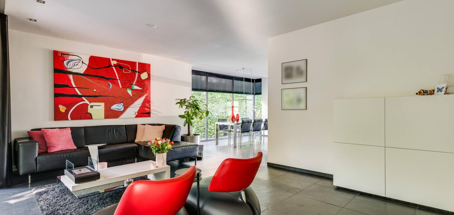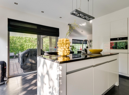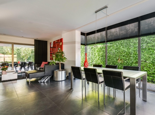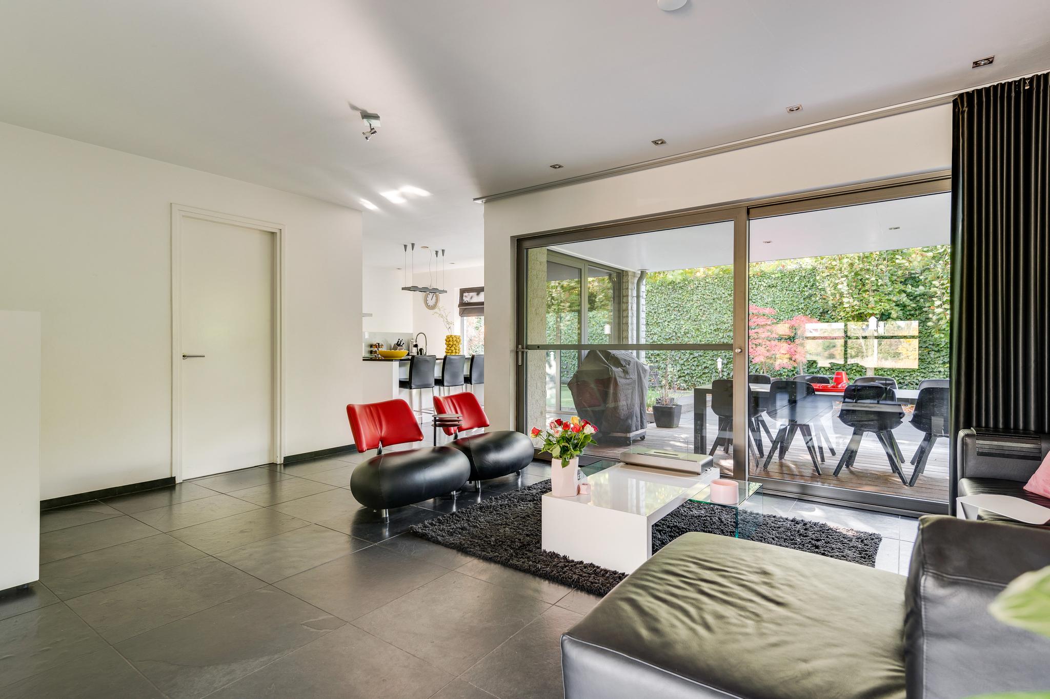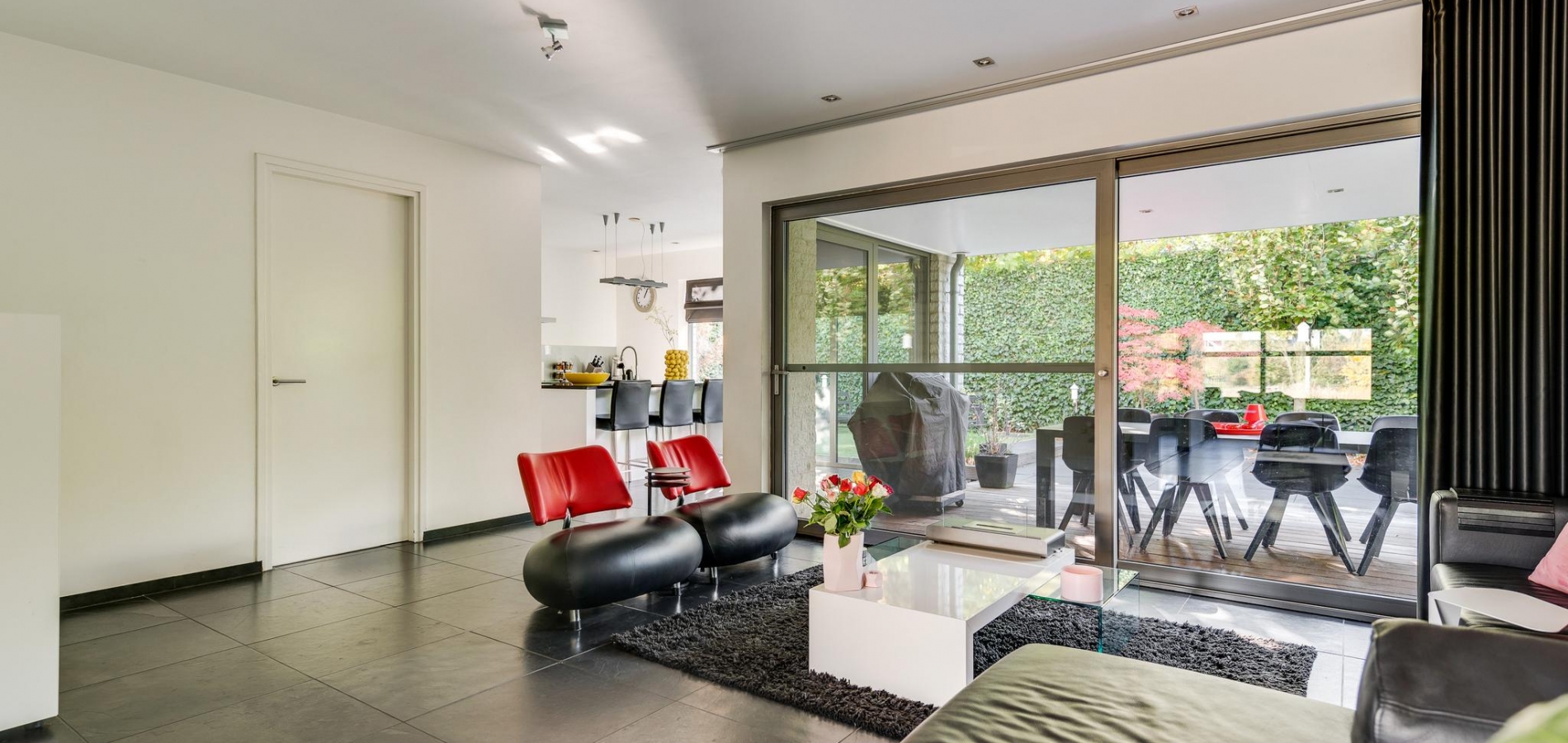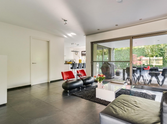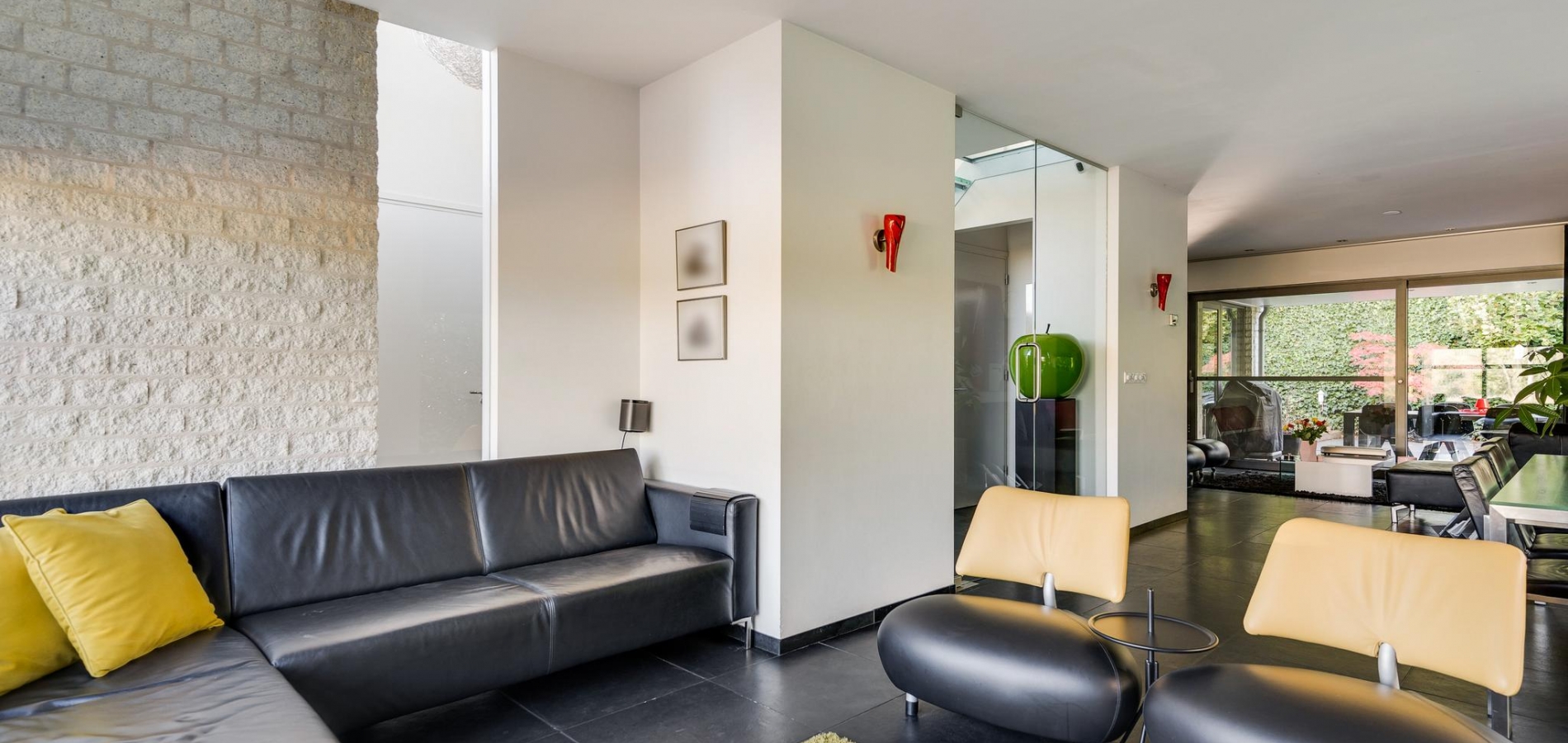 Aan de andere kant van de hal loopt u de woonkamer in, met een erker aan de westkant en een schuifpui naar het overdekte terras aan de achterzijde. Met een oppervlakte van circa 54 m2 is dit een woonkamer van formaat, met een dubbel zitgedeelte en een royaal eetgedeelte. Aan drie kanten zorgen grote ramen voor een uitstekende verbinding met de tuin.