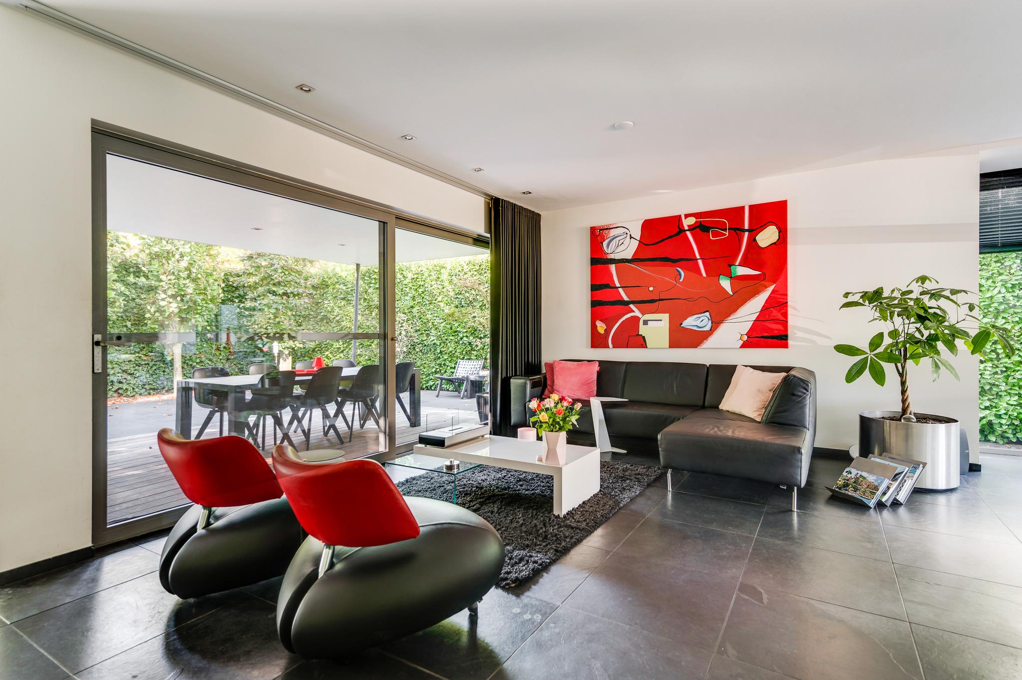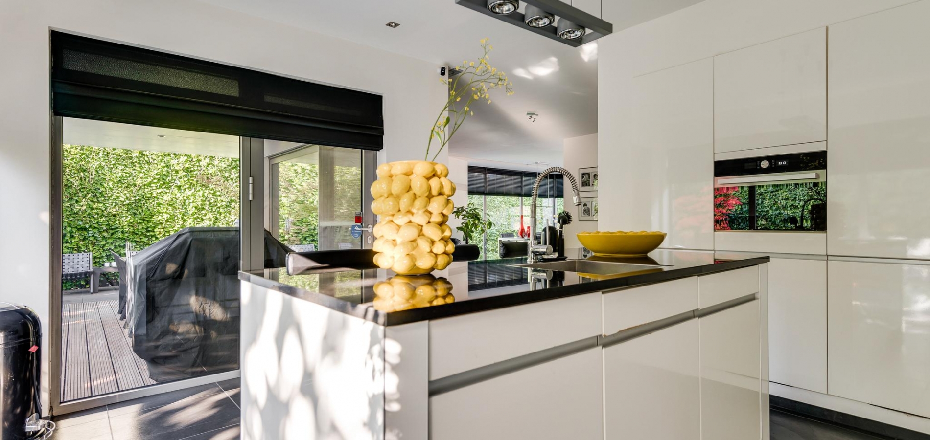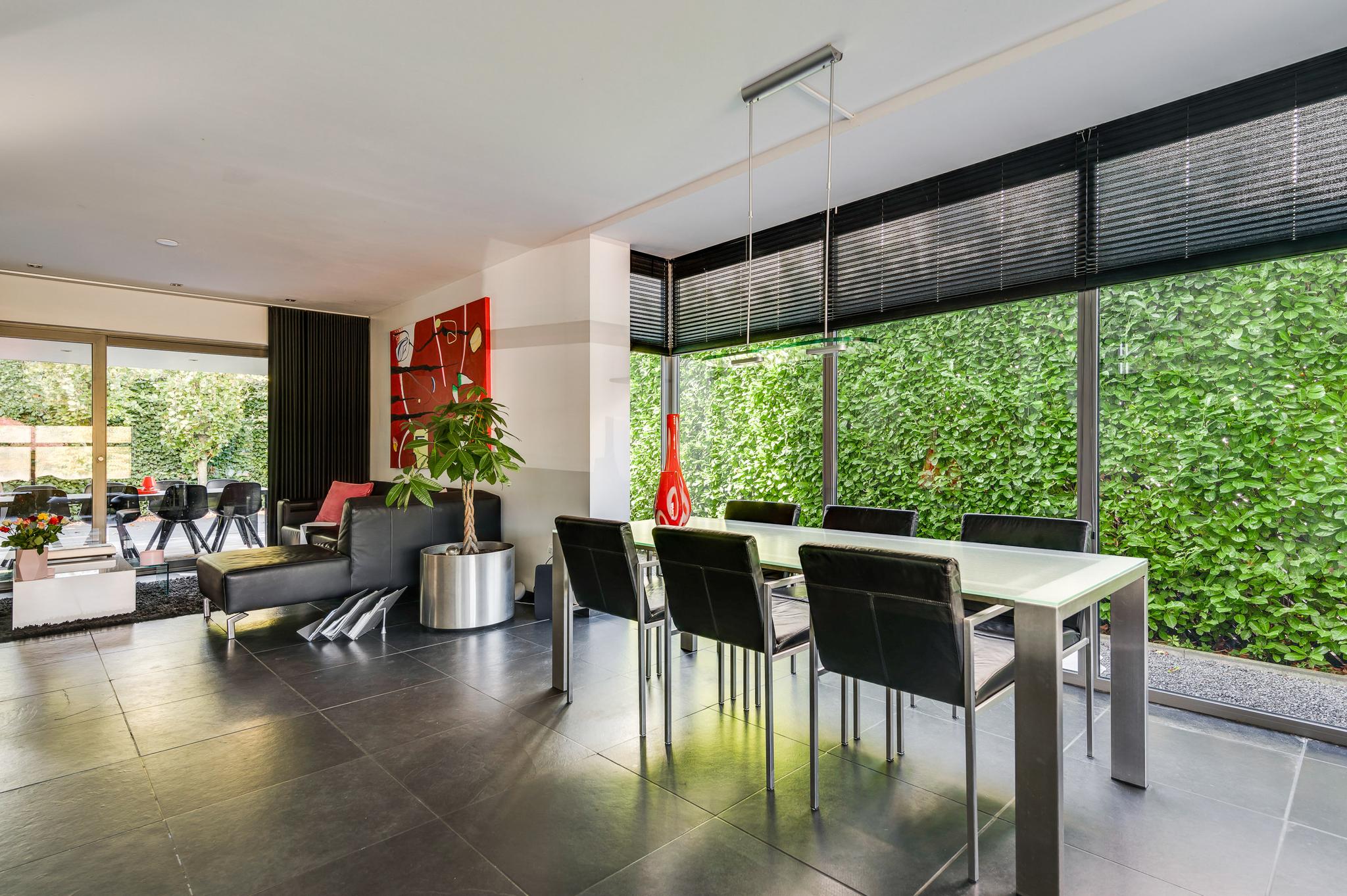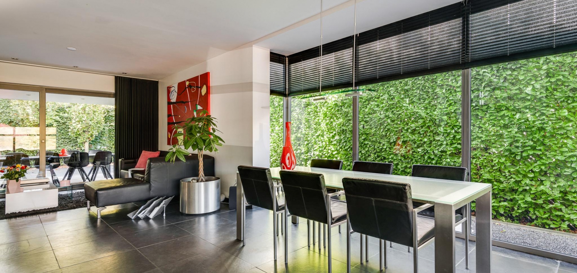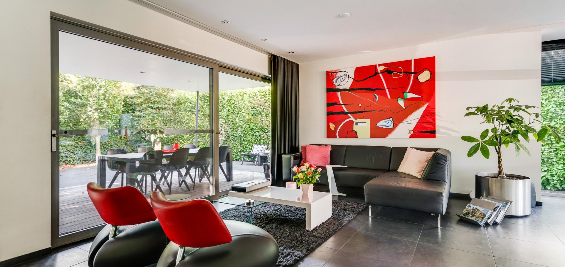 Aan de andere kant van de hal loopt u de woonkamer in, met een erker aan de westkant en een schuifpui naar het overdekte terras aan de achterzijde. Met een oppervlakte van circa 54 m2 is dit een woonkamer van formaat, met een dubbel zitgedeelte en een royaal eetgedeelte. Aan drie kanten zorgen grote ramen voor een uitstekende verbinding met de tuin.