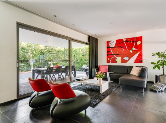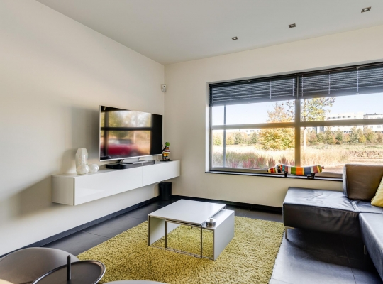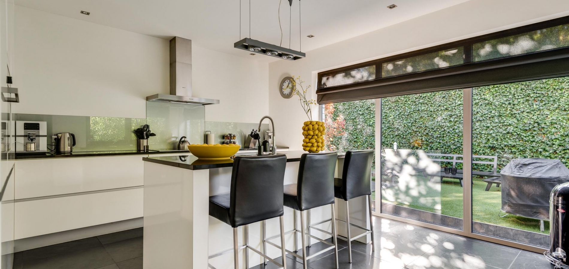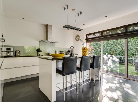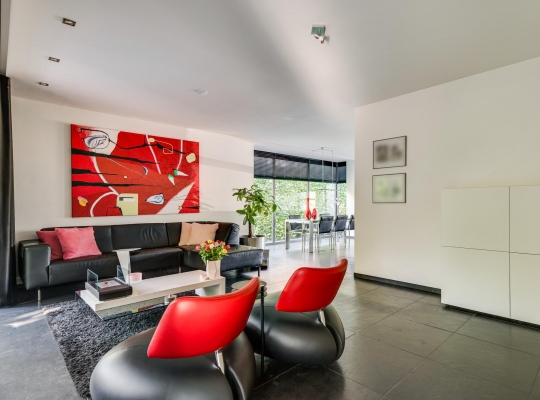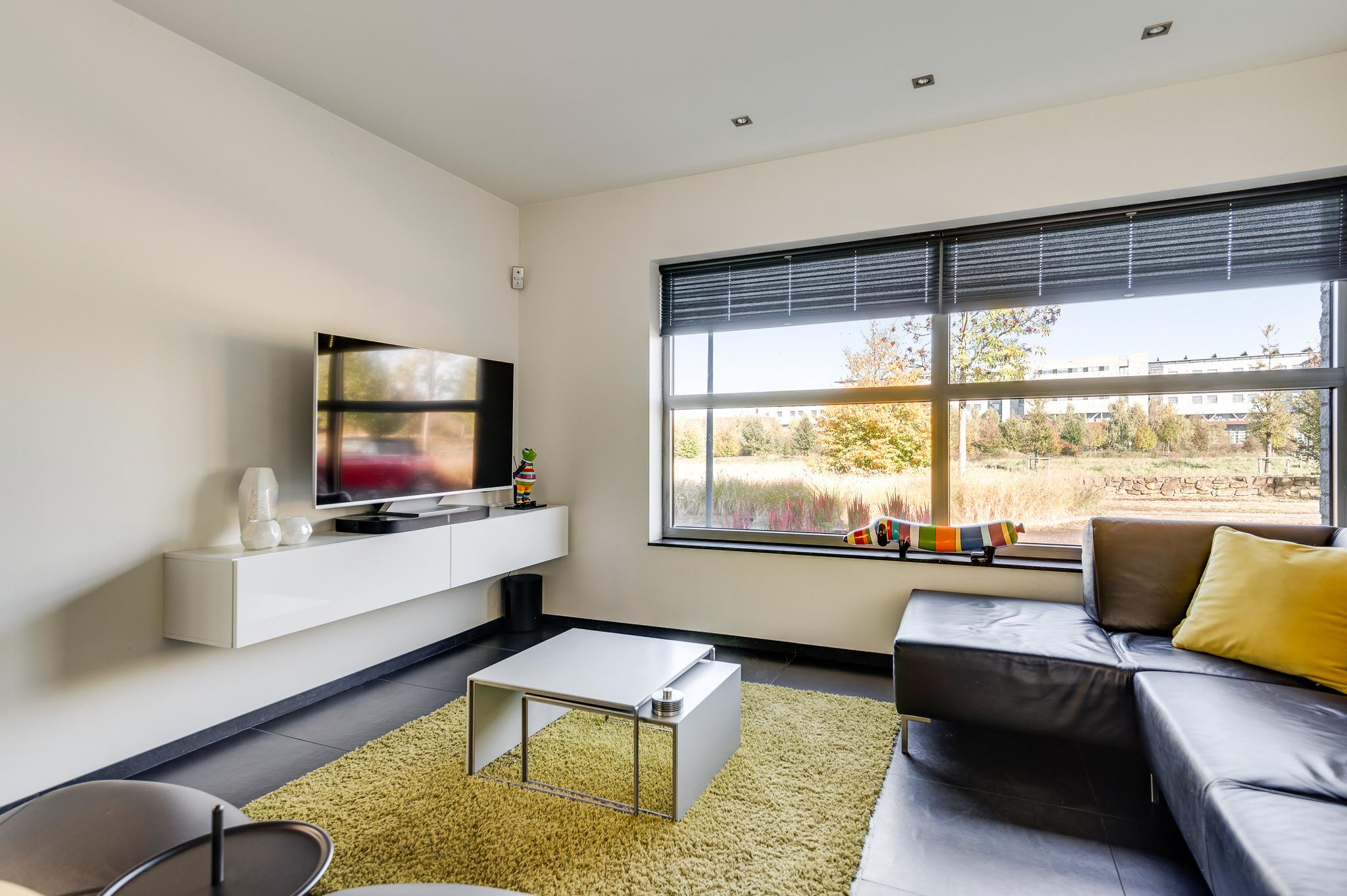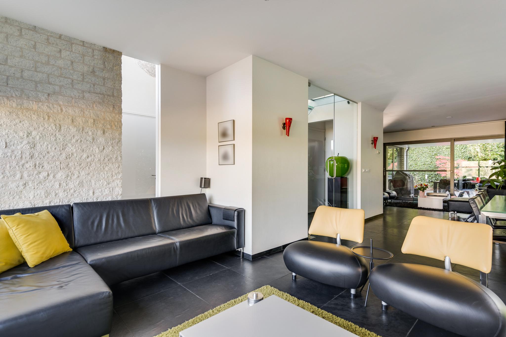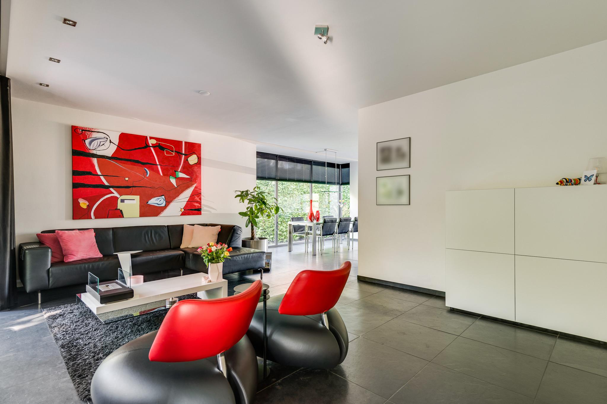 Aan de andere kant van de hal loopt u de woonkamer in, met een erker aan de westkant en een schuifpui naar het overdekte terras aan de achterzijde. Met een oppervlakte van circa 54 m2 is dit een woonkamer van formaat, met een dubbel zitgedeelte en een royaal eetgedeelte. Aan drie kanten zorgen grote ramen voor een uitstekende verbinding met de tuin.