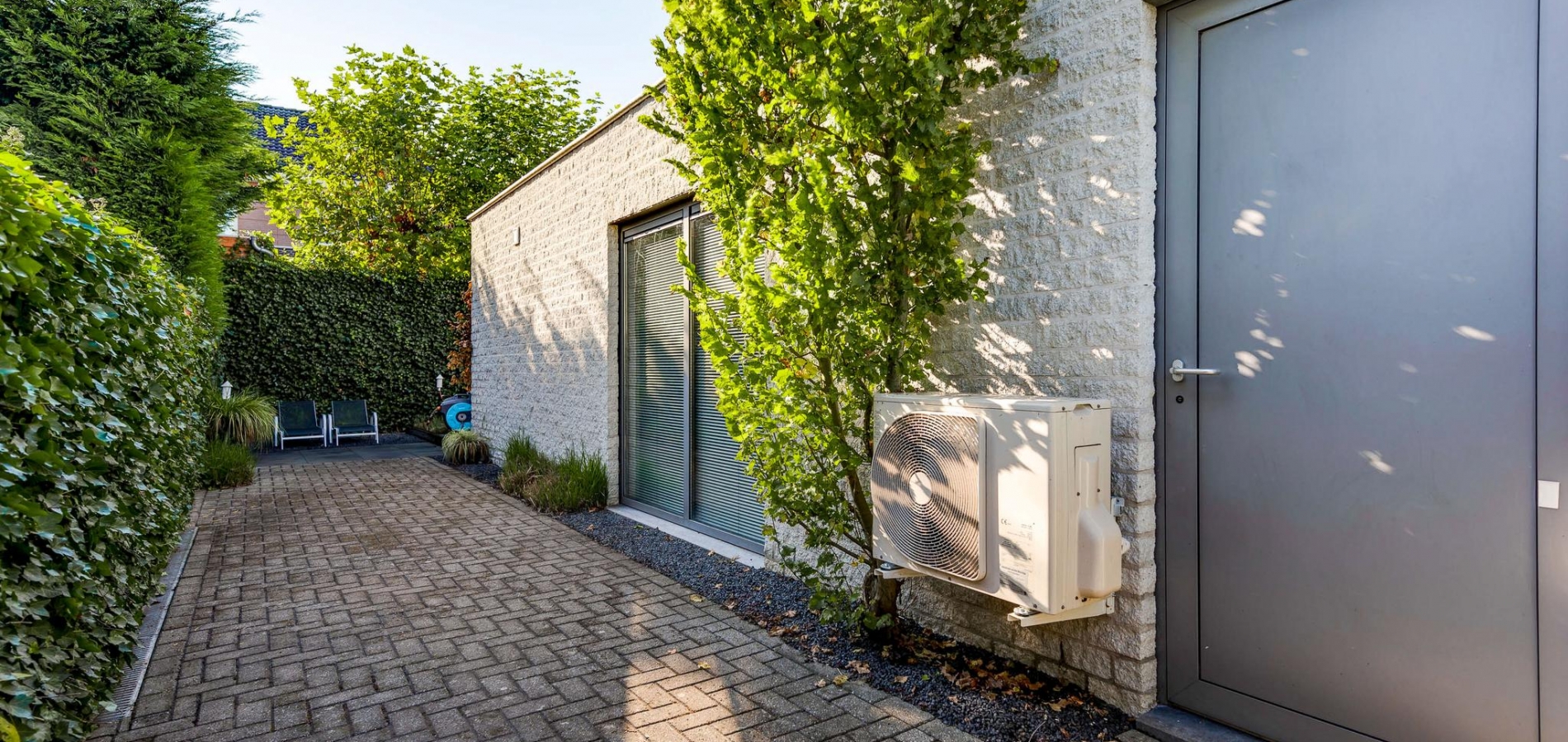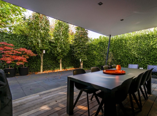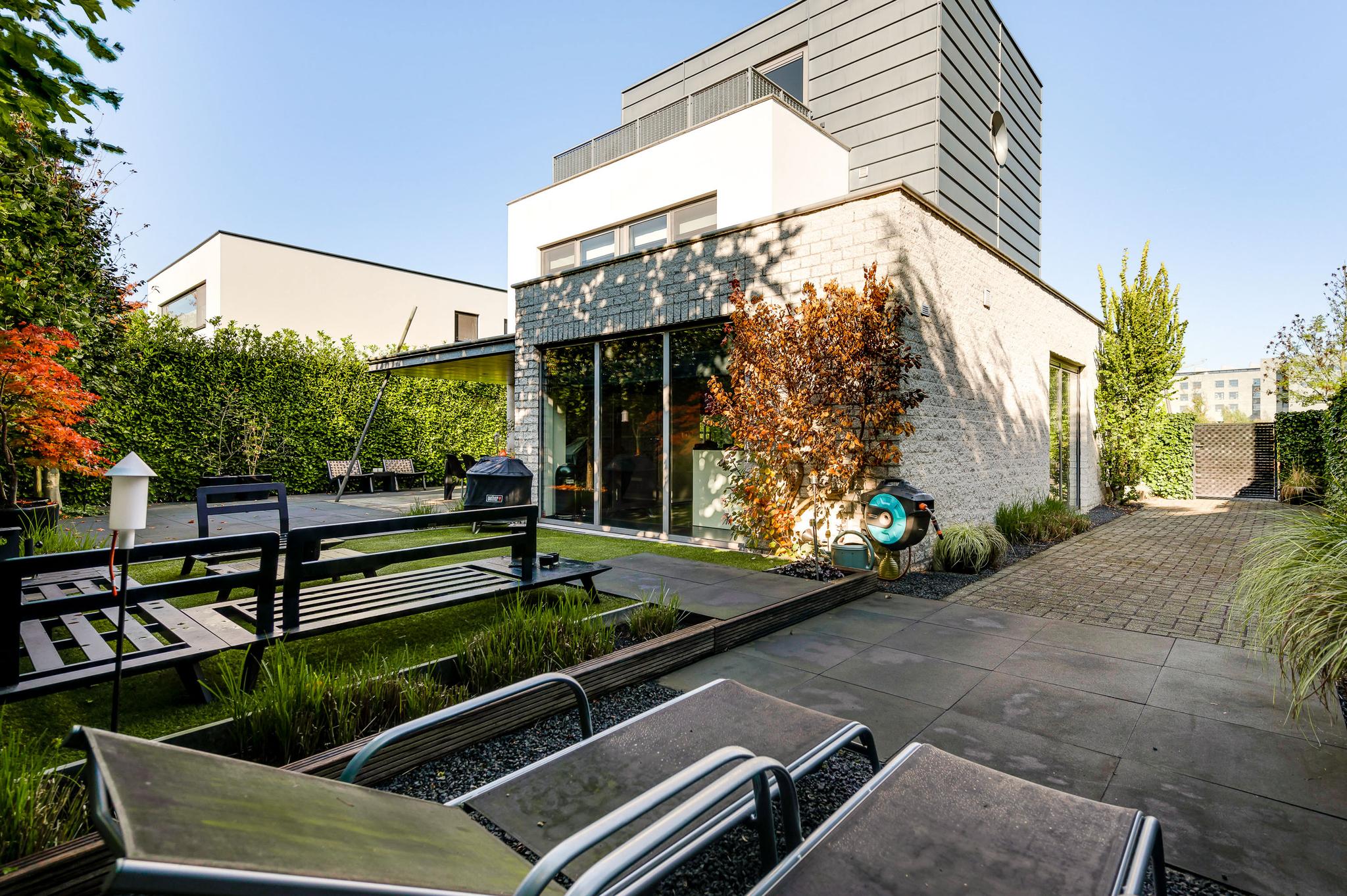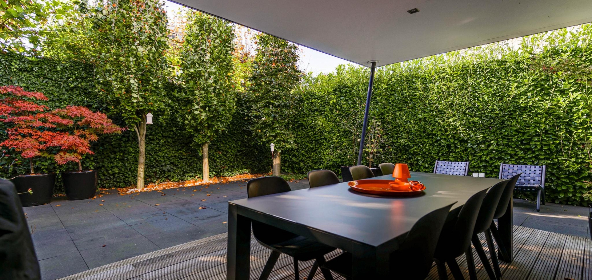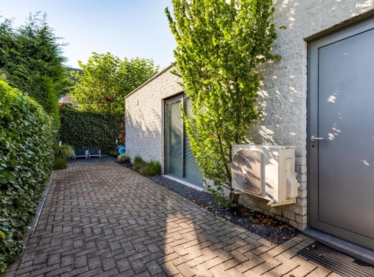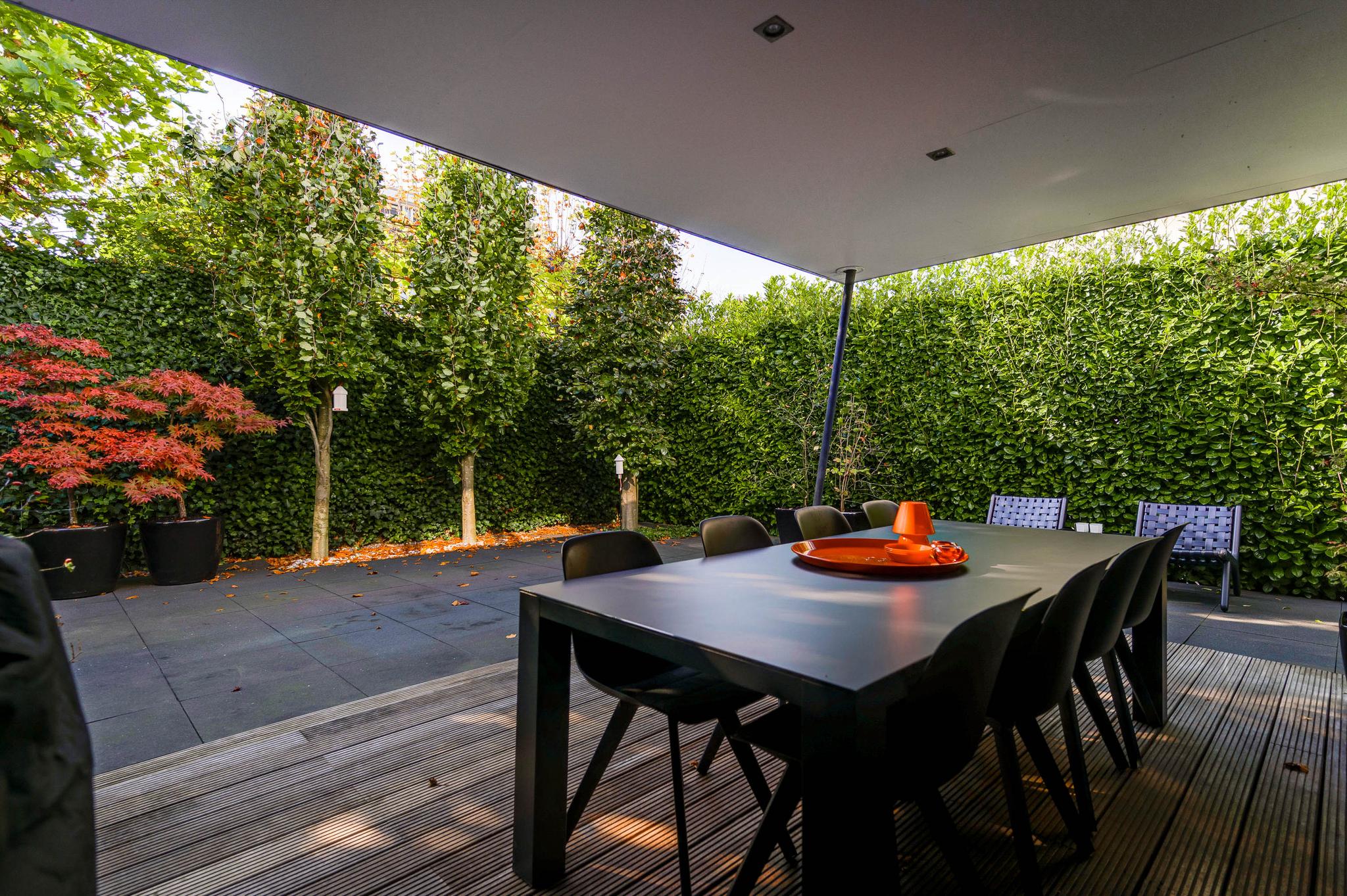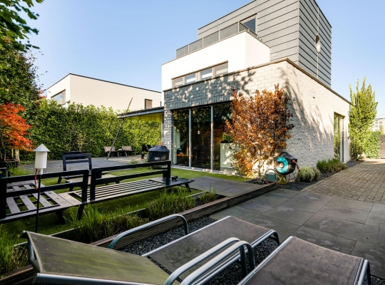 Rondom de villa ligt een fraai aangelegde tuin in een moderne stijl. De achtertuin is gesitueerd op het zuidwesten en aan de voorzijde is parkeergelegenheid voor meerdere auto’s. Aan drie kanten heeft u de beschikking over een terras en het overdekte terras aan de achterzijde is de perfecte plek voor een hapje, drankje en te barbecueën met familie of vrienden. De erfafscheiding met klimop en diverse bomen zorgen voor optimale privacy.
