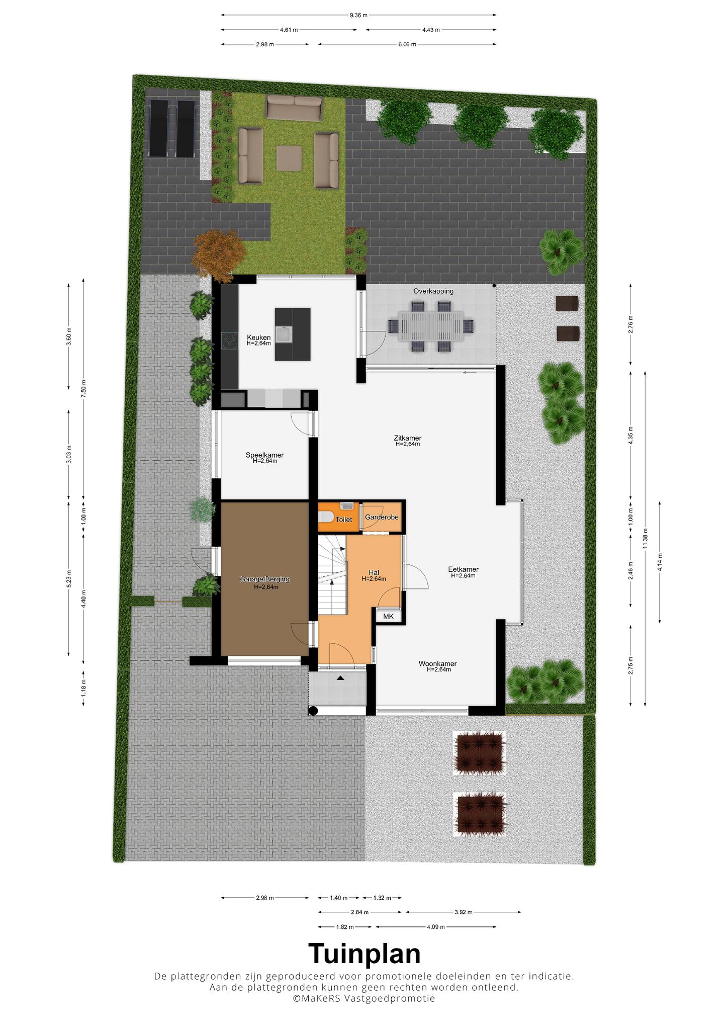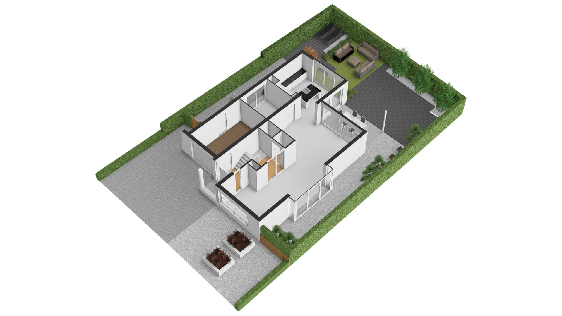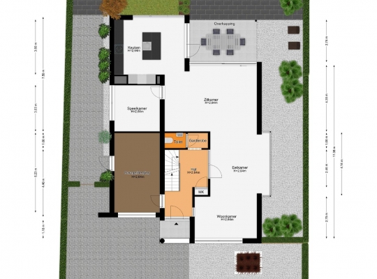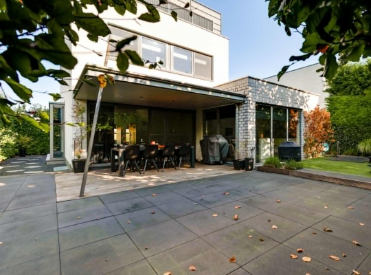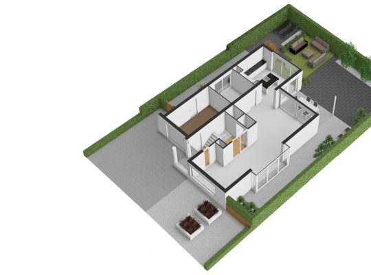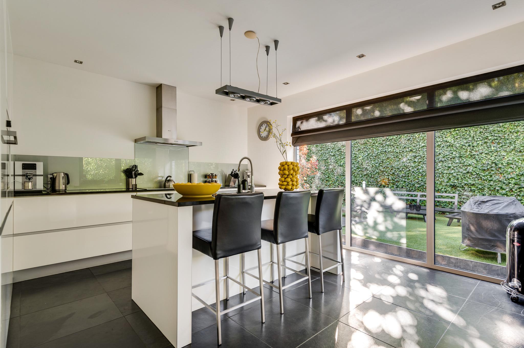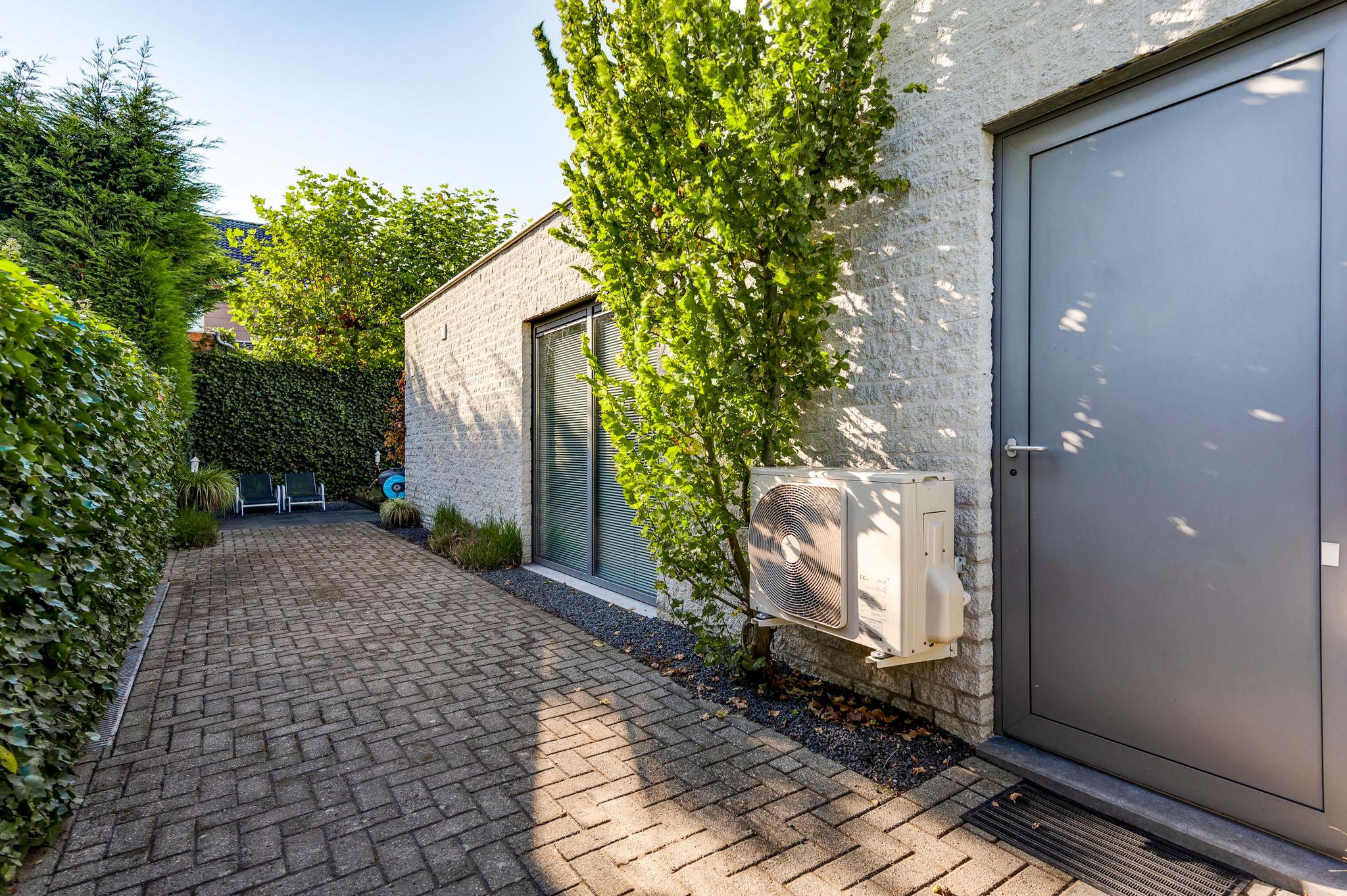 Rondom de villa ligt een fraai aangelegde tuin in een moderne stijl. De achtertuin is gesitueerd op het zuidwesten en aan de voorzijde is parkeergelegenheid voor meerdere auto’s. Aan drie kanten heeft u de beschikking over een terras en het overdekte terras aan de achterzijde is de perfecte plek voor een hapje, drankje en te barbecueën met familie of vrienden. De erfafscheiding met klimop en diverse bomen zorgen voor optimale privacy.