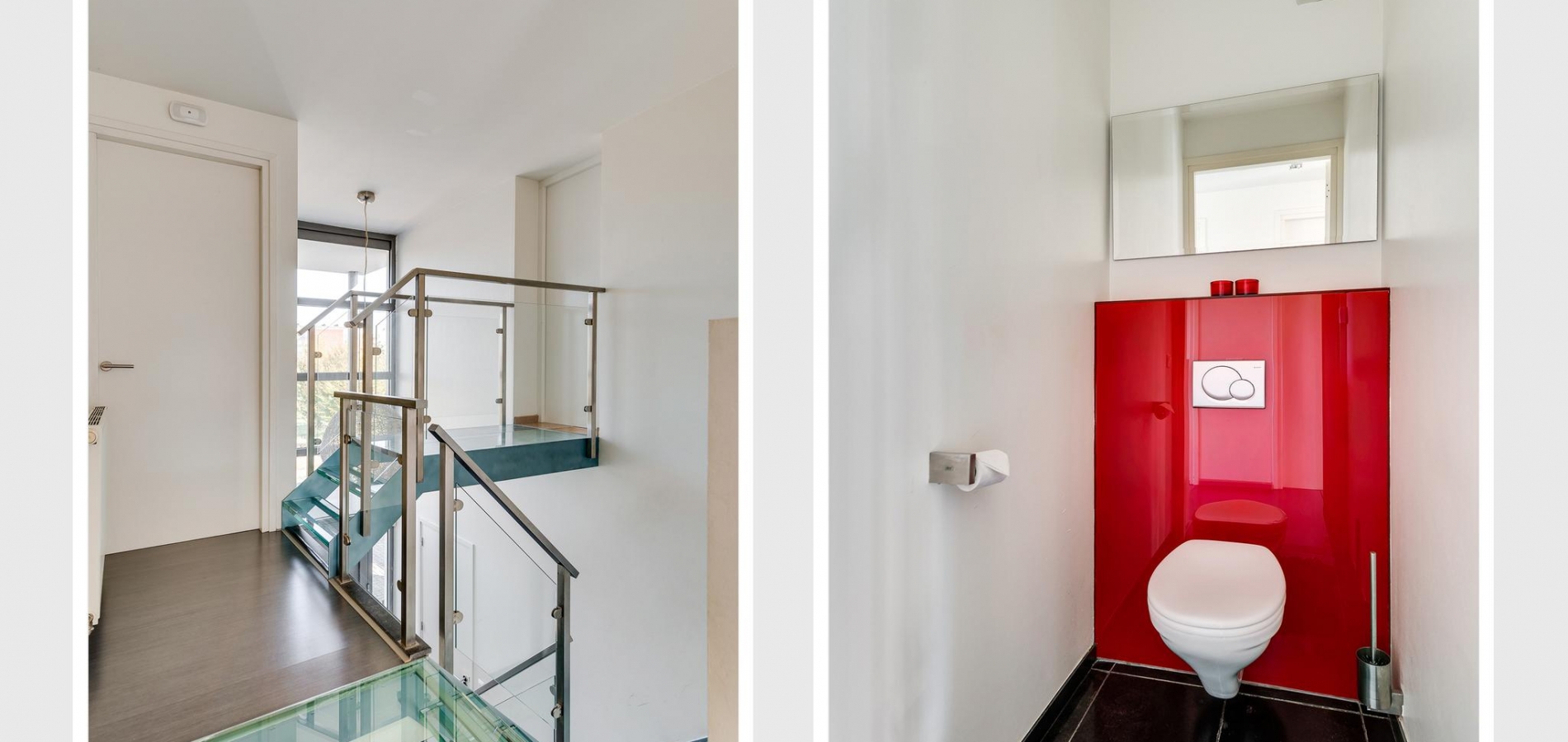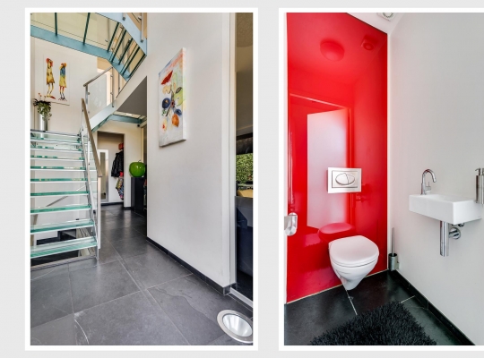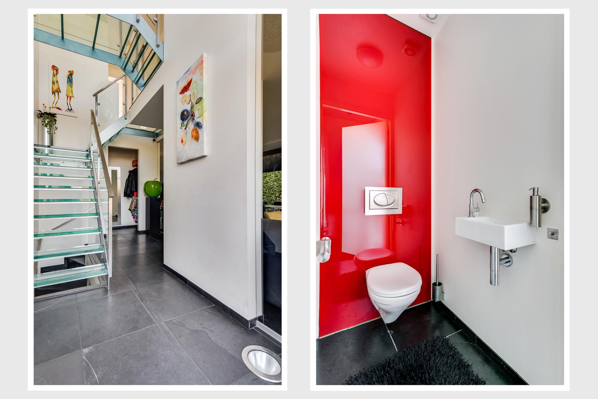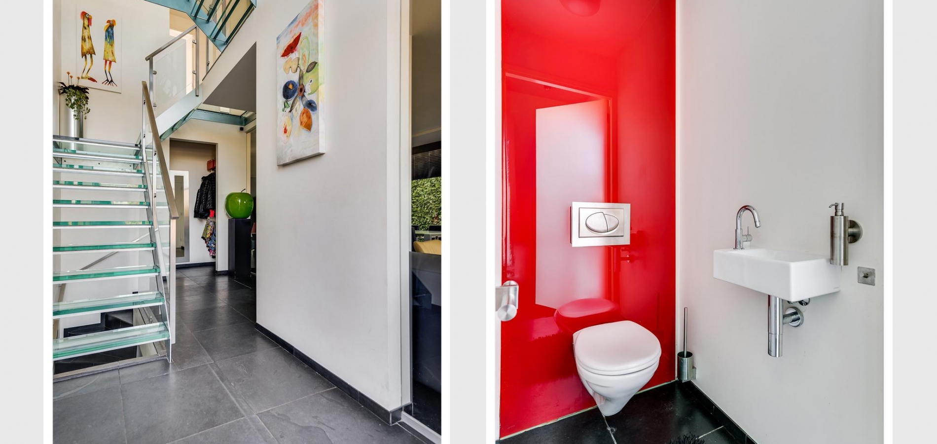 De hal met vide is een spectaculaire ontvangstruimte met een donkere tegelvloer van natuursteen, een glazen bordestrap en de trap naar het souterrain. Bij de garderobe is het gastentoilet met fonteintje waar de kleuren, wit, zwart en rood de sfeer bepalen.