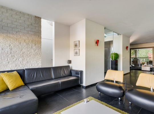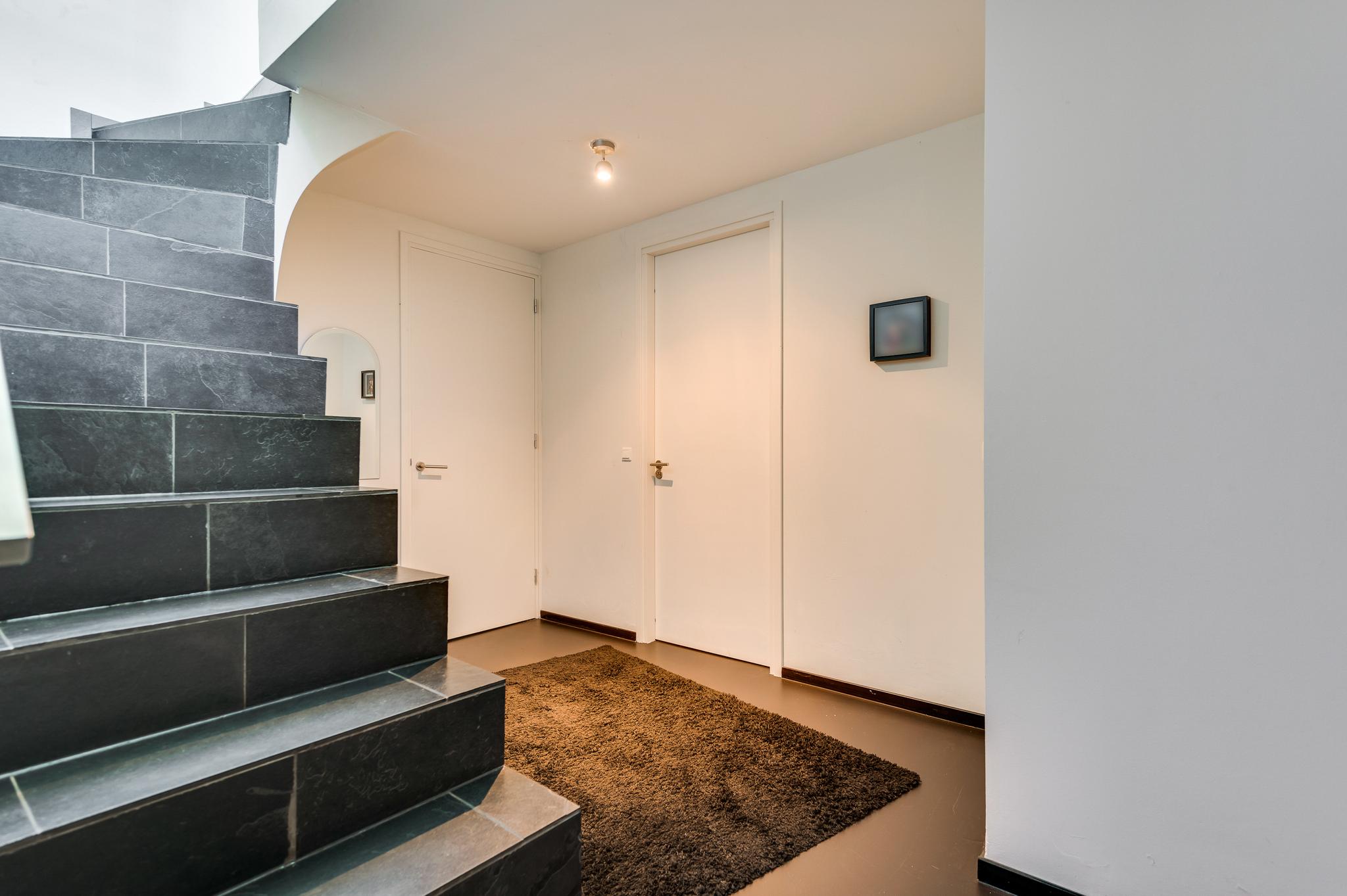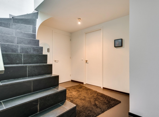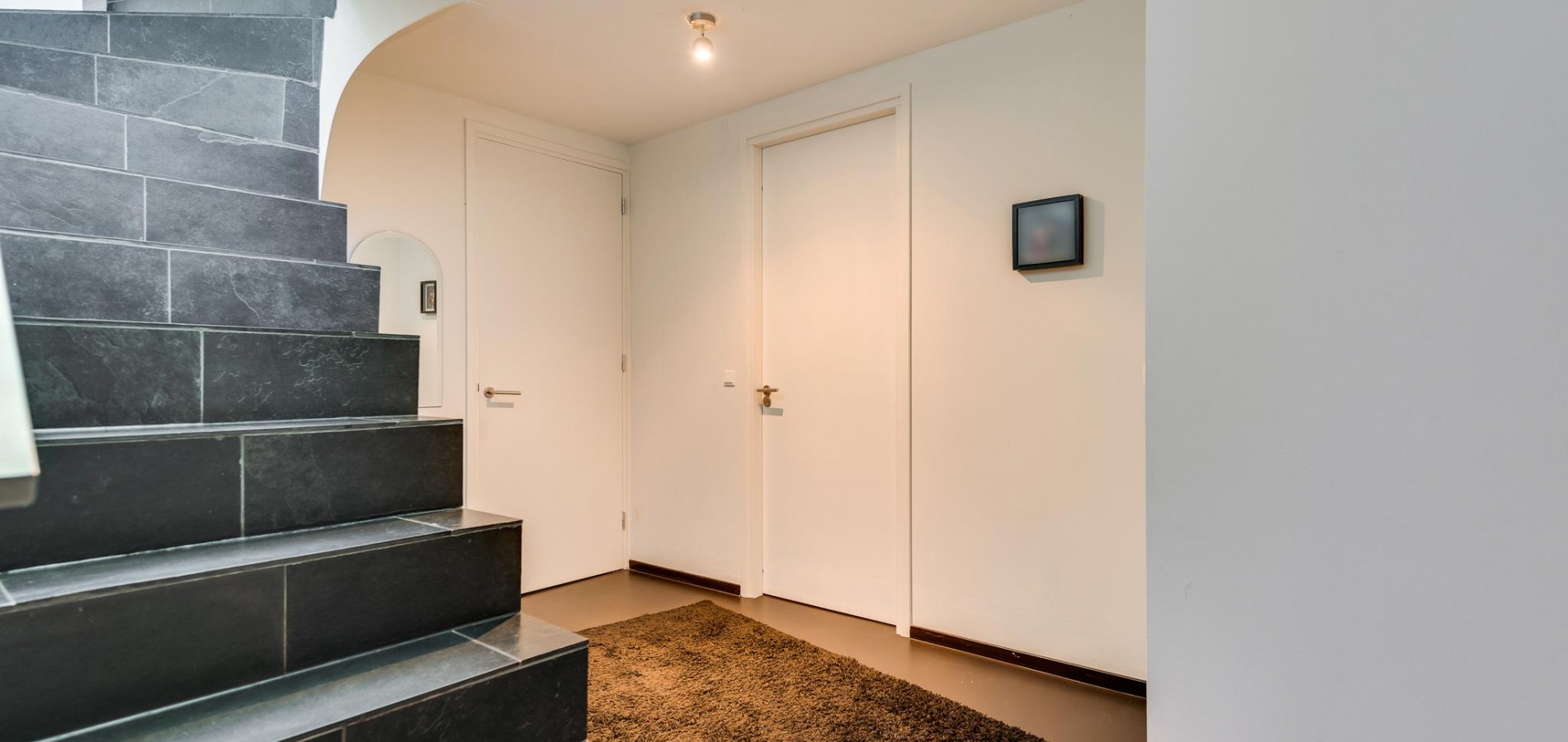 De hal met vide is een spectaculaire ontvangstruimte met een donkere tegelvloer van natuursteen, een glazen bordestrap en de trap naar het souterrain. Bij de garderobe is het gastentoilet met fonteintje waar de kleuren, wit, zwart en rood de sfeer bepalen.