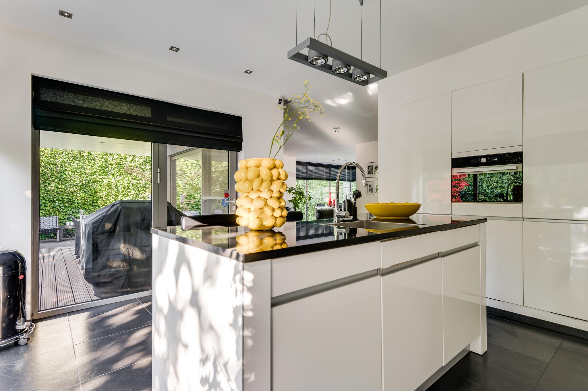 In de keuken van circa 17 m2 staat een hoogwaardige, moderne opstelling met een spoel-/ziteiland, een lange wandopstelling en een ingebouwde kastenwand. De aanrechtbladen zijn van natuursteen en alle benodigde apparatuur van Miele en Bauknecht zijn ingebouwd: een keramische kookplaat, afzuigkap, vriezer, koelkast, vaatwasser en een combi-oven. Dit is een droomkeuken voor de kook- en bakliefhebber, met genoeg ruimte om te koken voor familie en vrienden.