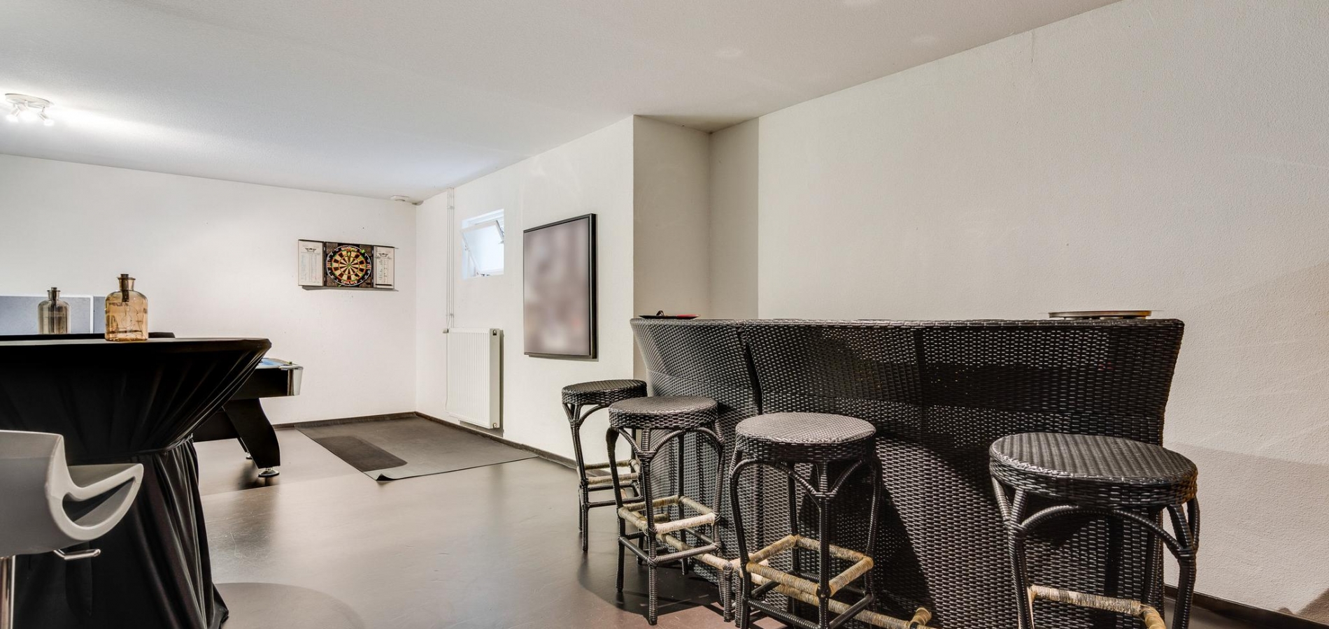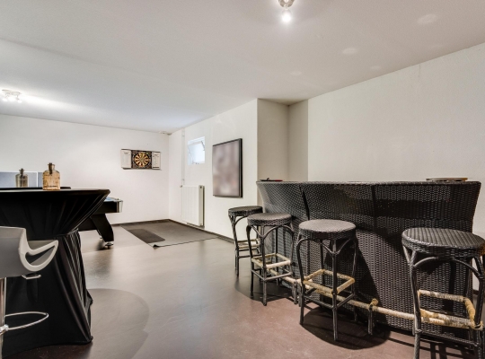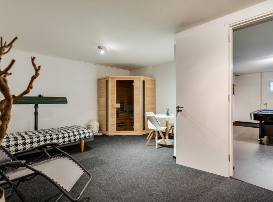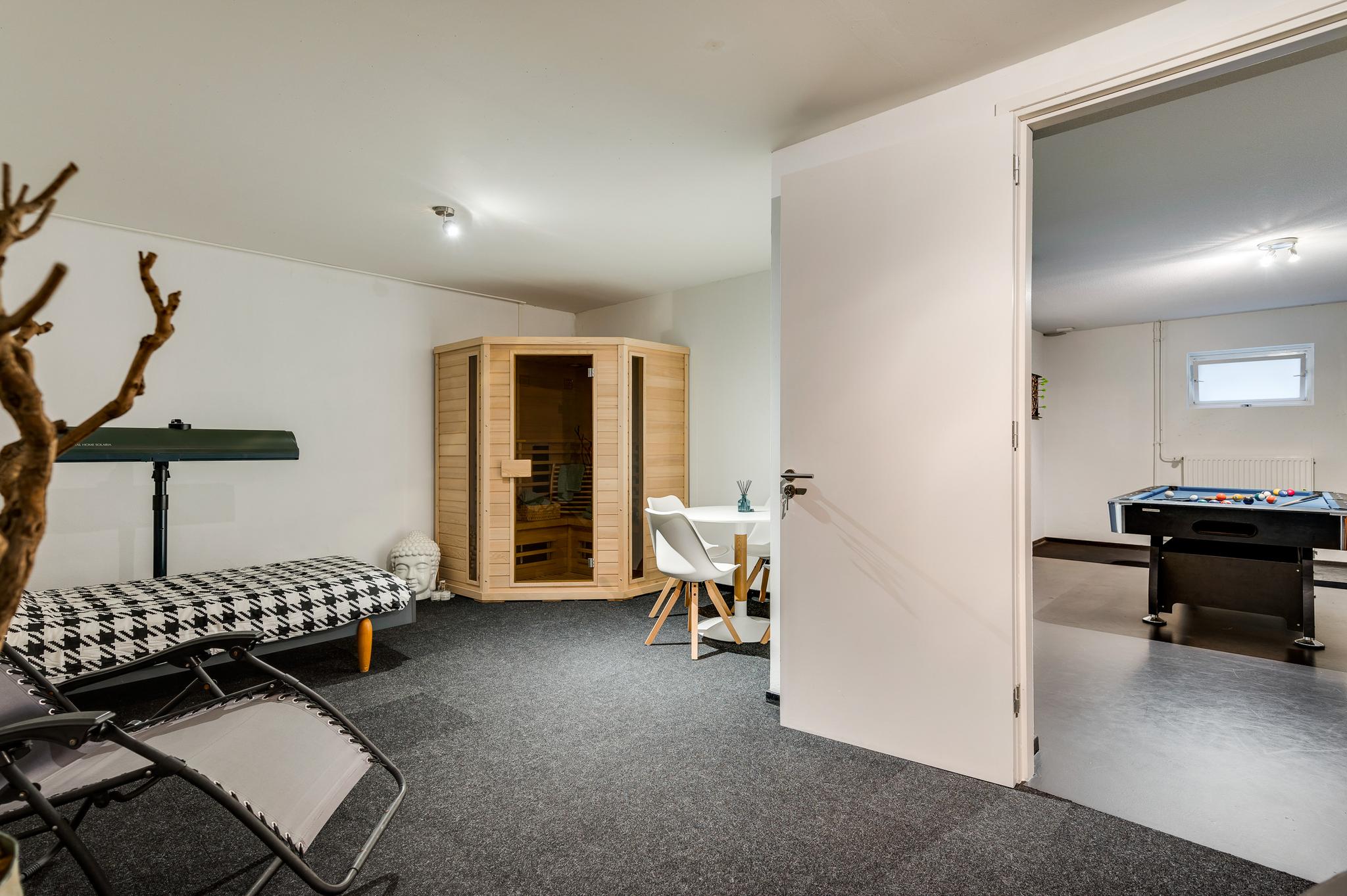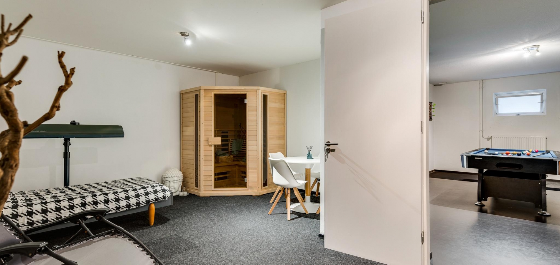 Aan de andere kant van het portaal is een deur naar een fantastische ruimte die thans is ingedeeld met een zithoek, bar en een pooltafel. Aansluitend is de wellness met een sauna en fraai behang die u het hele jaar in vakantiesferen brengt. Welke invulling geeft u aan het souterrain?