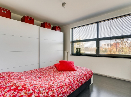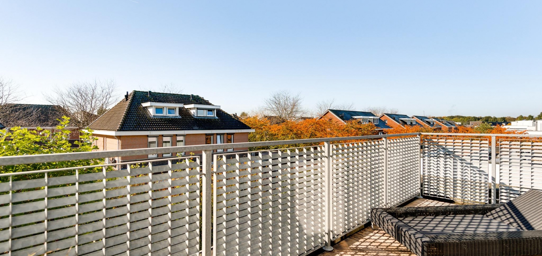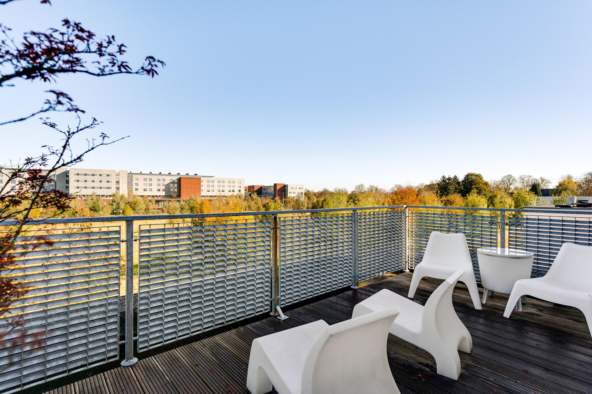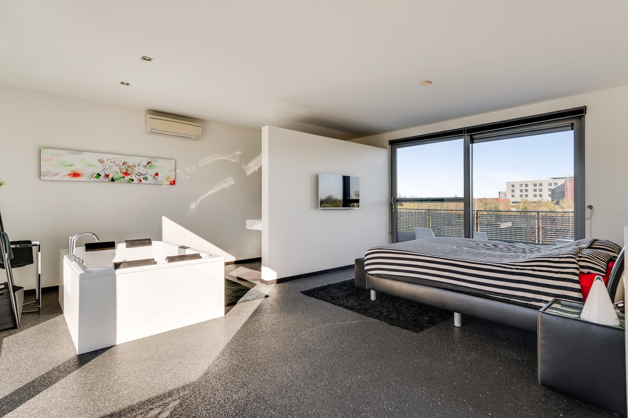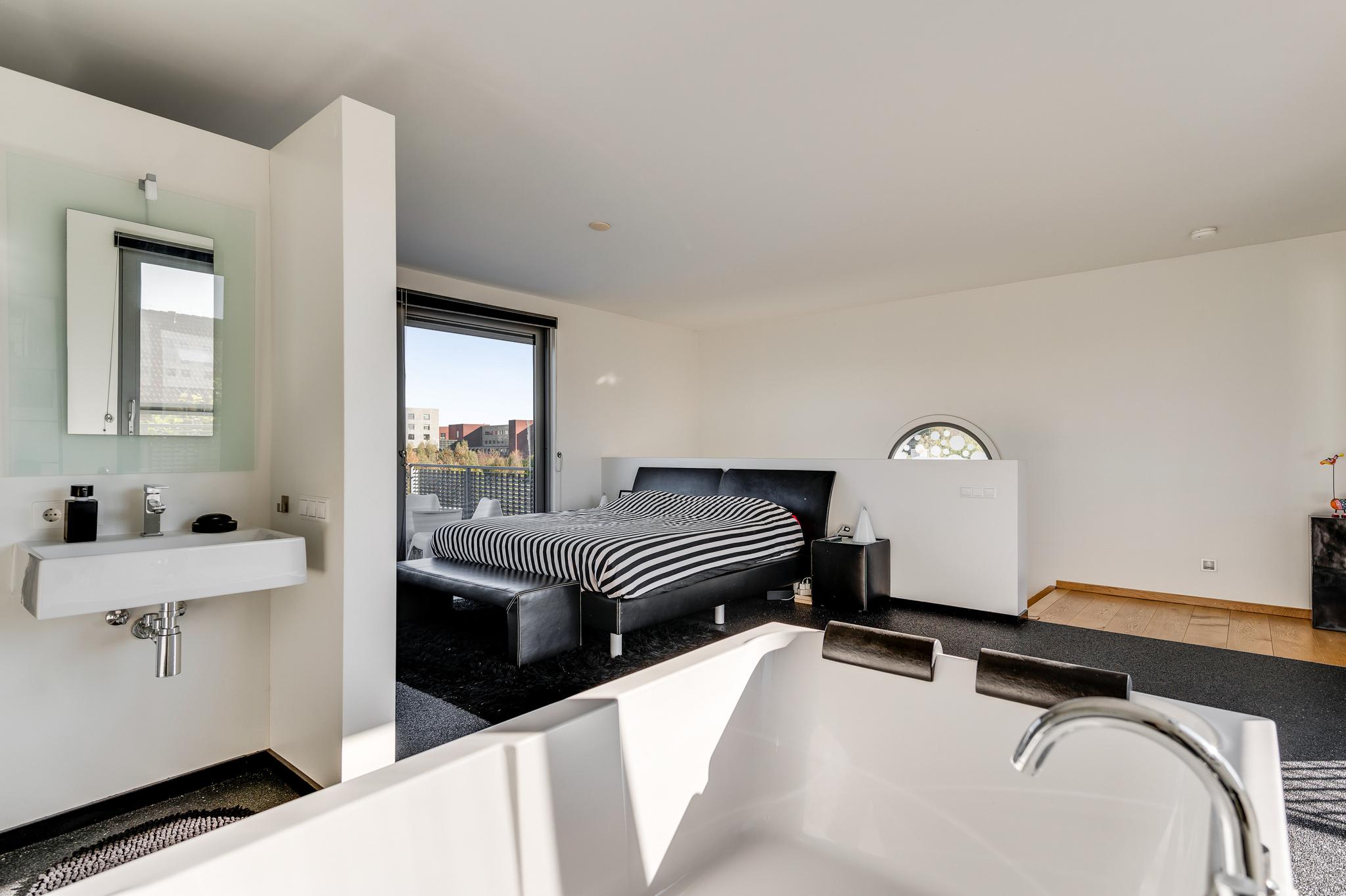 Op deze verdieping is slaapkamer IV van circa 5,18 x 5,60 meter met inloopkast, die met recht de naam master bedroom draagt. In deze kamer ligt een stijlvolle grindvloer en een van de blikvangers is het grote, vrijstaande bad. Verder ziet u een groot rond raam bij de trap, een wastafel met spiegel en een airco-unit. Twee grote schuifpuien geven toegang tot de dakterrassen van circa 5,00 x 1,80 en 5,00 x 2,50 meter. Hier geniet u volop van het prachtige uitzicht naar het park, met het Zuyderland ziekenhuis op de achtergrond.