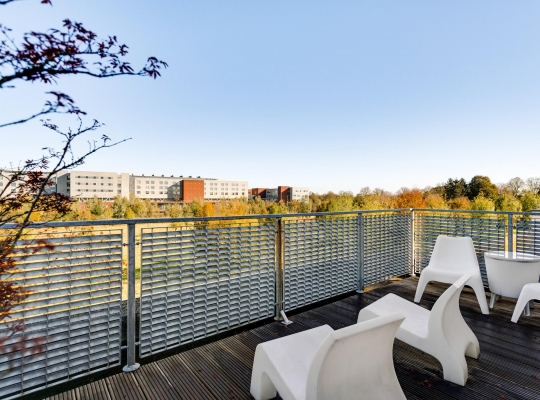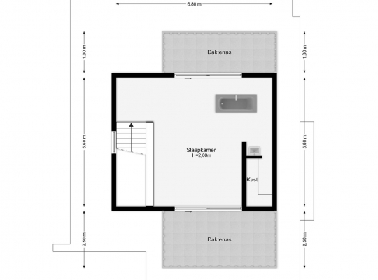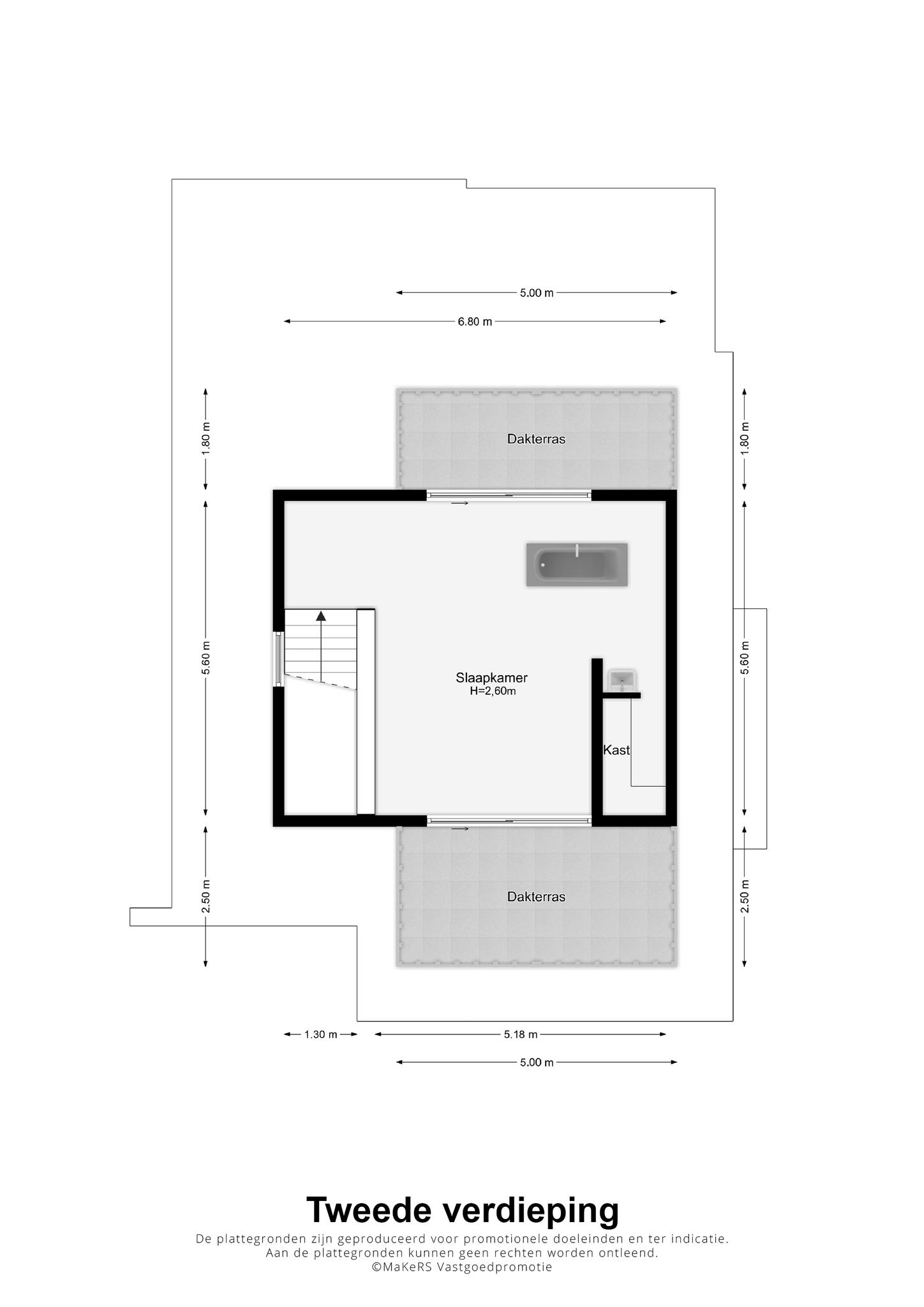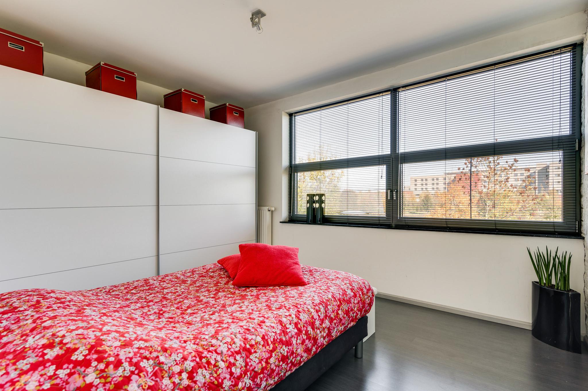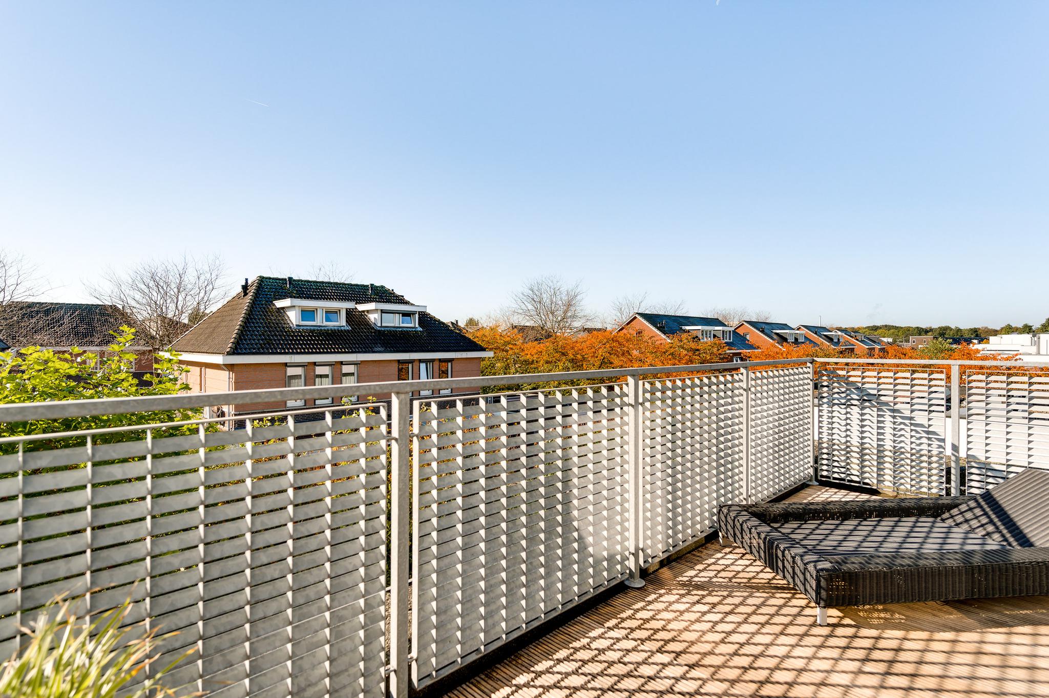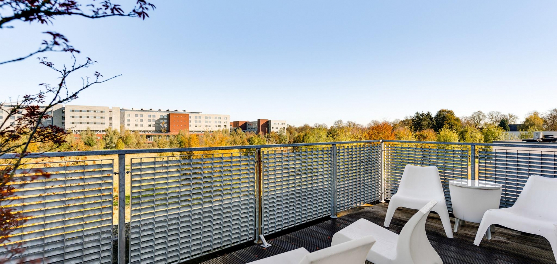 Op deze verdieping is slaapkamer IV van circa 5,18 x 5,60 meter met inloopkast, die met recht de naam master bedroom draagt. In deze kamer ligt een stijlvolle grindvloer en een van de blikvangers is het grote, vrijstaande bad. Verder ziet u een groot rond raam bij de trap, een wastafel met spiegel en een airco-unit. Twee grote schuifpuien geven toegang tot de dakterrassen van circa 5,00 x 1,80 en 5,00 x 2,50 meter. Hier geniet u volop van het prachtige uitzicht naar het park, met het Zuyderland ziekenhuis op de achtergrond.