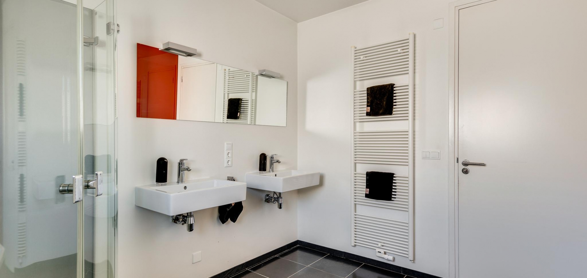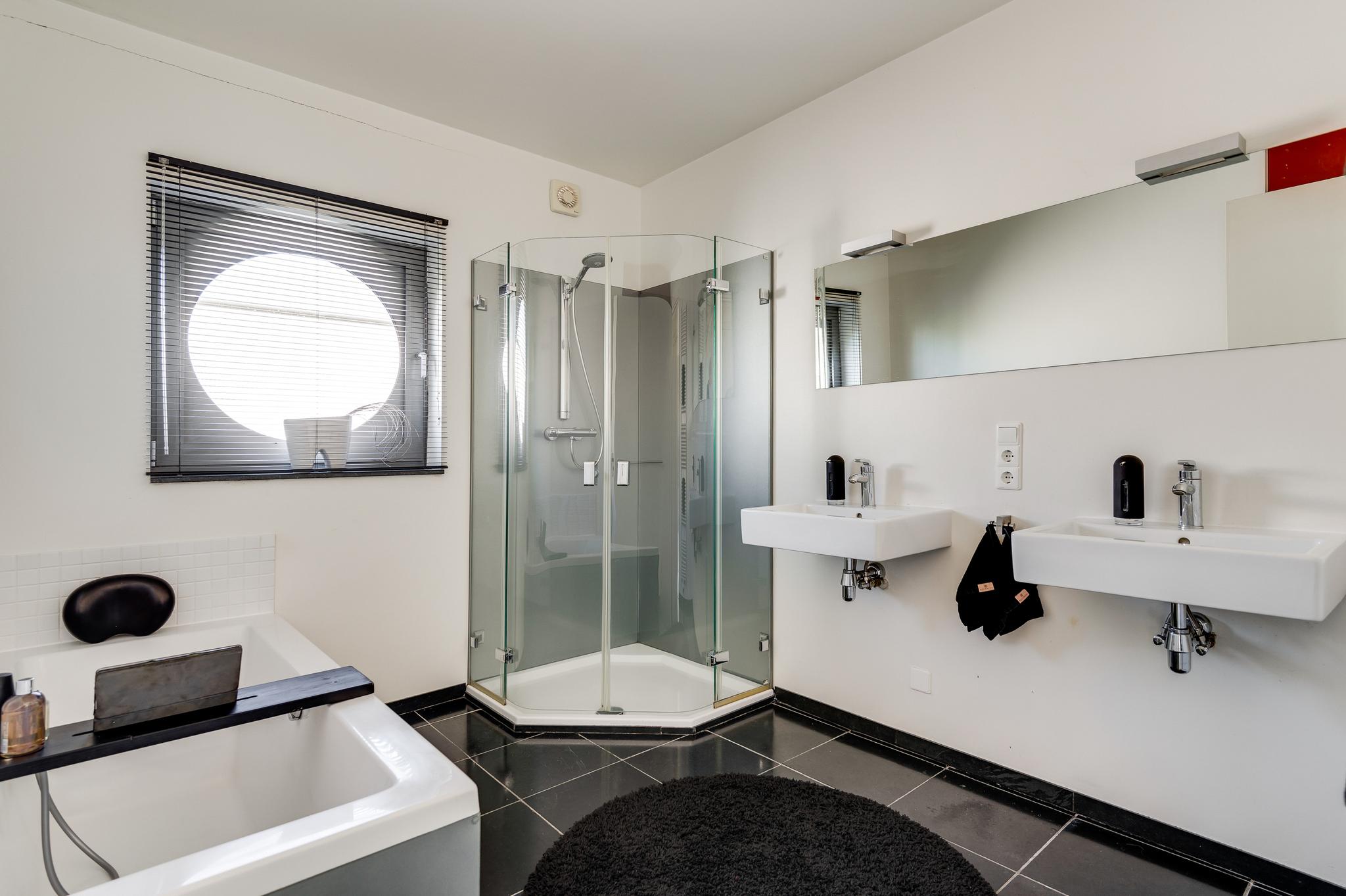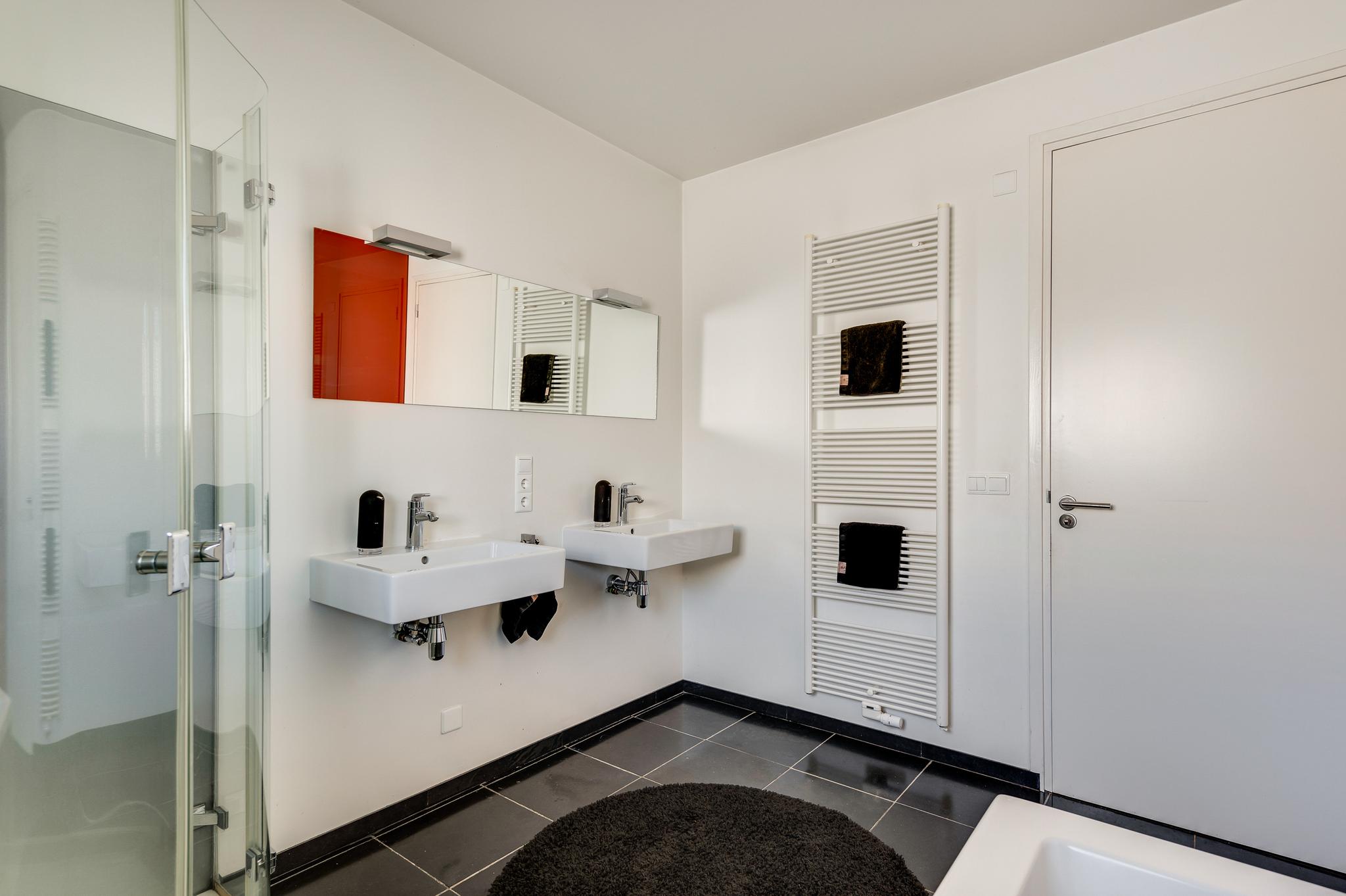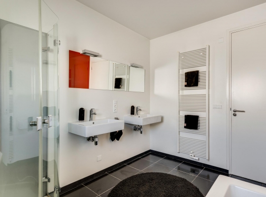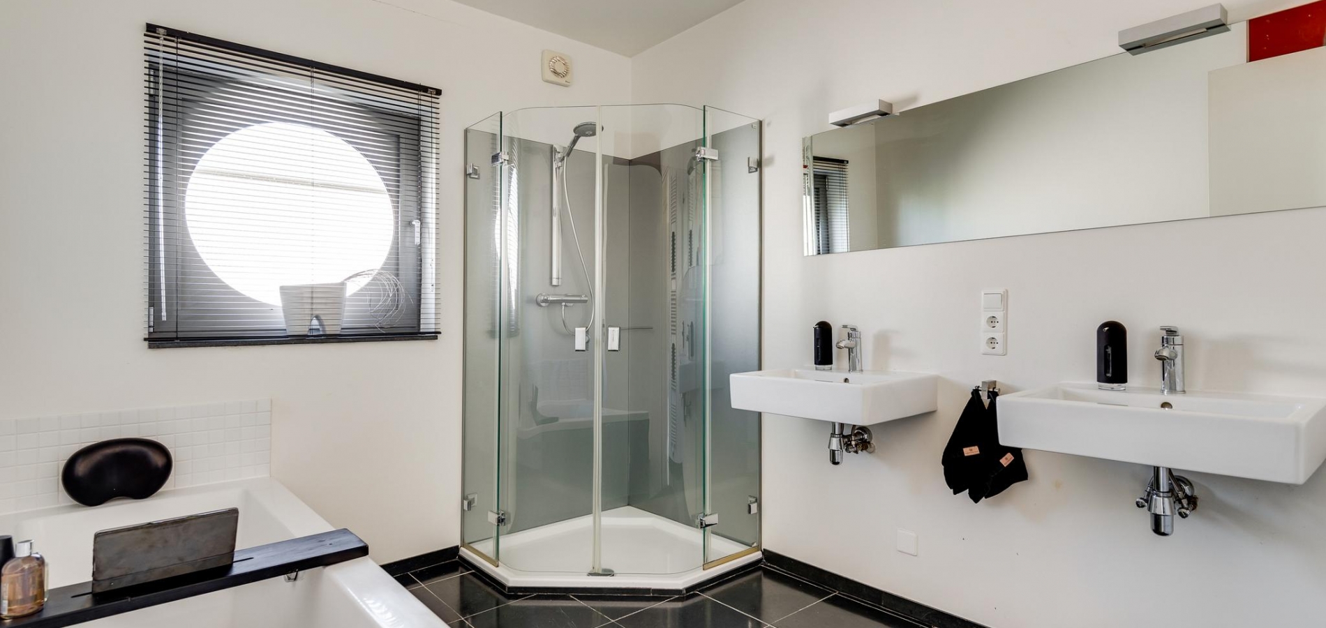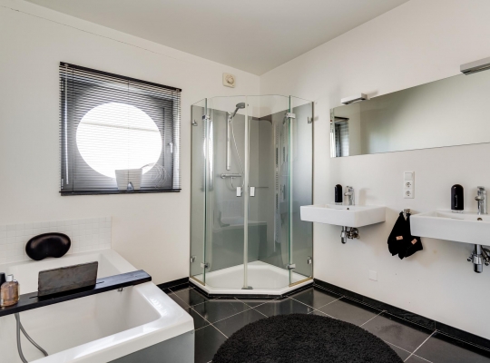 De badkamer (circa 3,00 x 2,60) met rond raam biedt een mooie combinatie van stucwerk, hoogglans zwarte vloertegels en modern sanitair. U heeft de beschikking over een ligbad, separate douche en twee wastafels. Boven de wastafels hangt een brede spiegel met verlichting en achter de rode glazen deur is een ruime bergkast. Het separate toilet met wandcloset is uitgevoerd in dezelfde stijl.