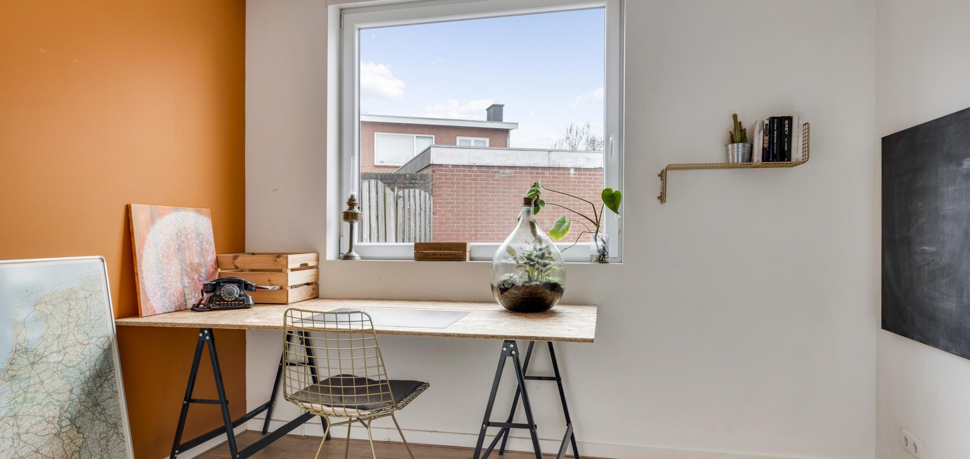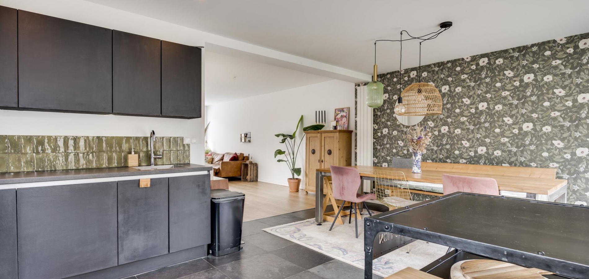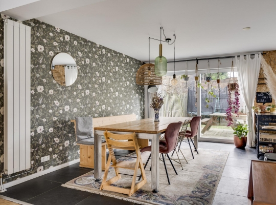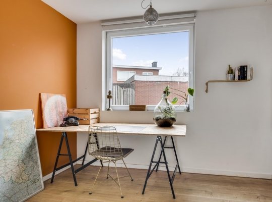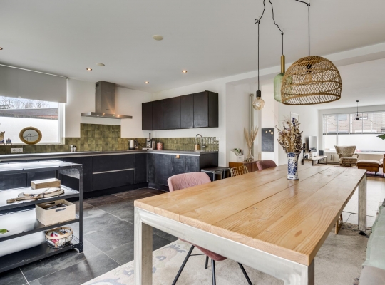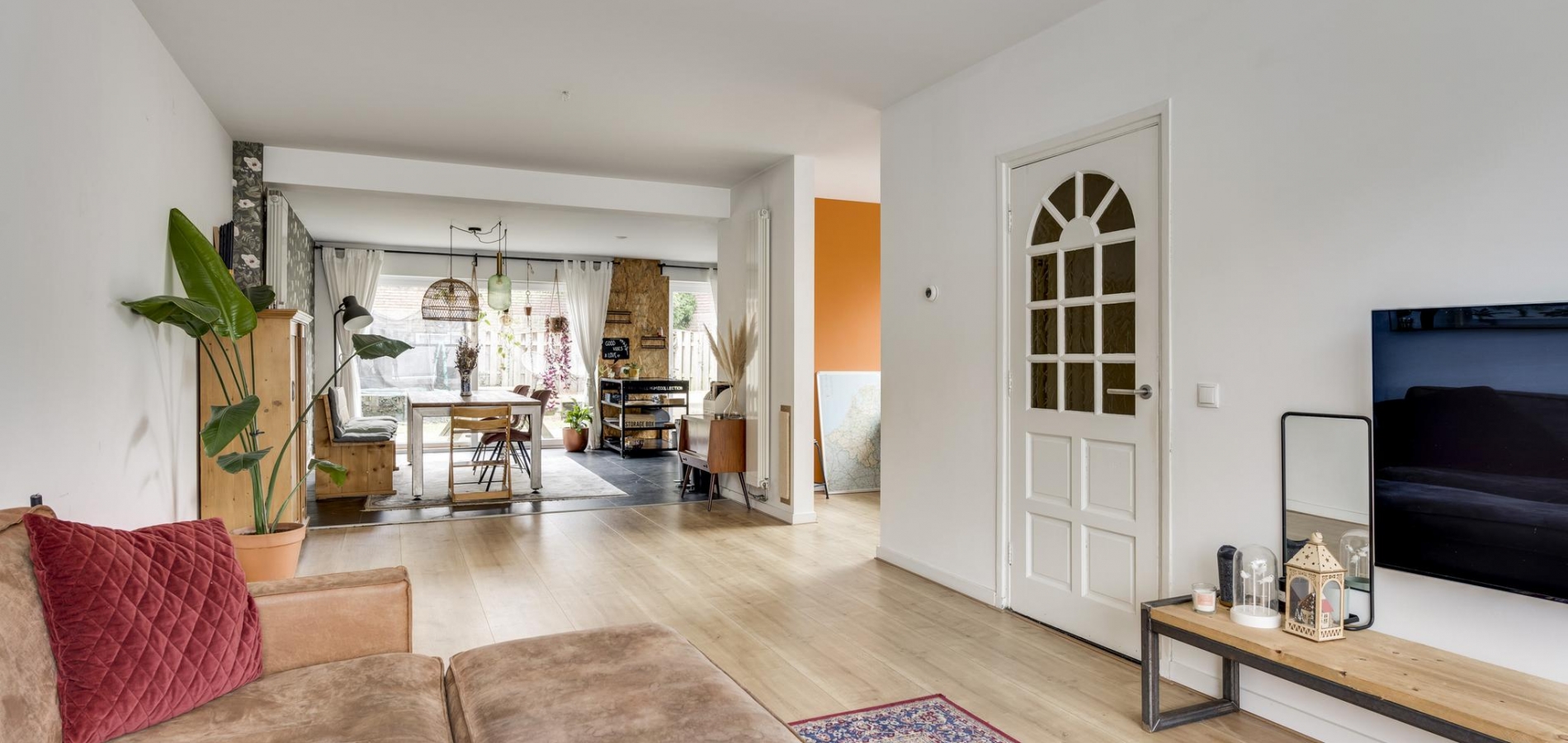 De woonkamer (7,27 x 3,50) staat in verbinding met de eetkamer (3,96 x 3,36) en een werk-/studeerplek (3,26 x 2,32). Het resultaat is een leefruimte van circa 46 m2 met een mooie wand-, plafond- en vloerafwerking. Door de grote ramen valt veel licht naar binnen en een grote schuifpui verbindt de eetkamer met de tuin.