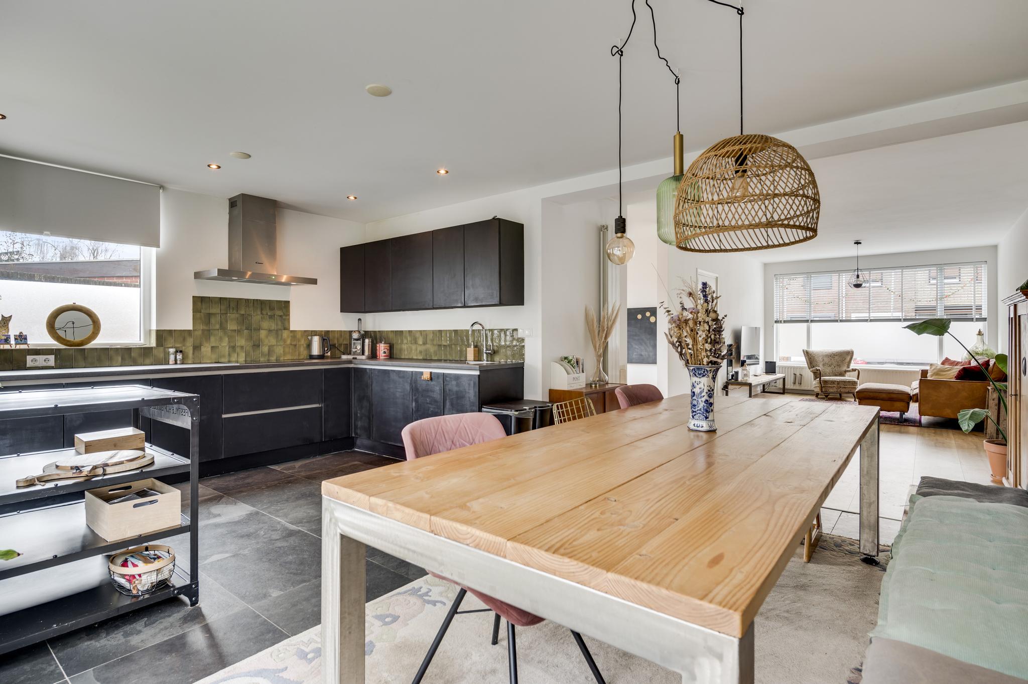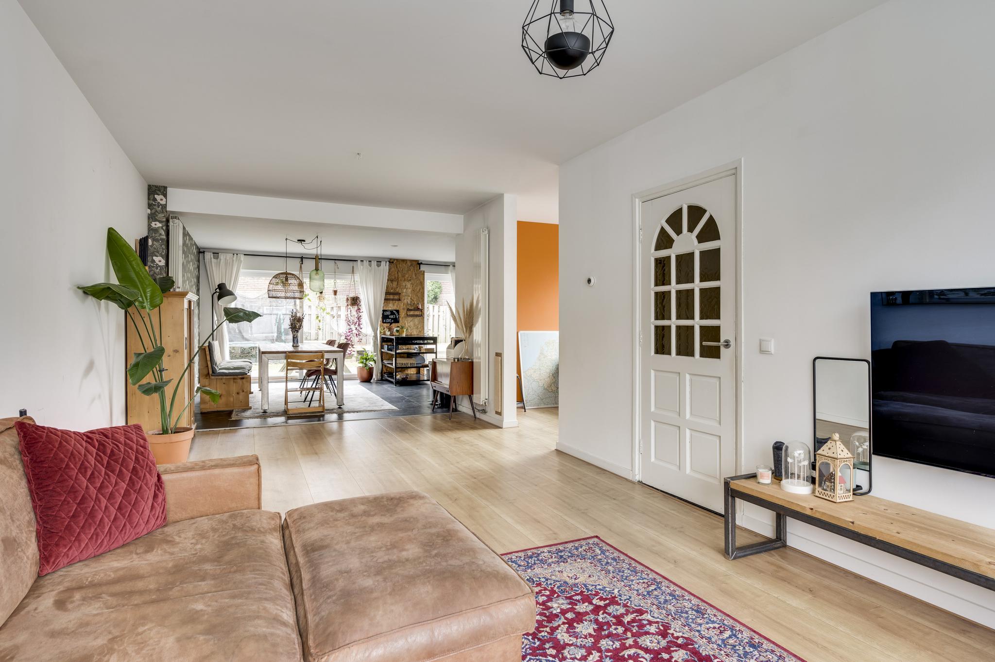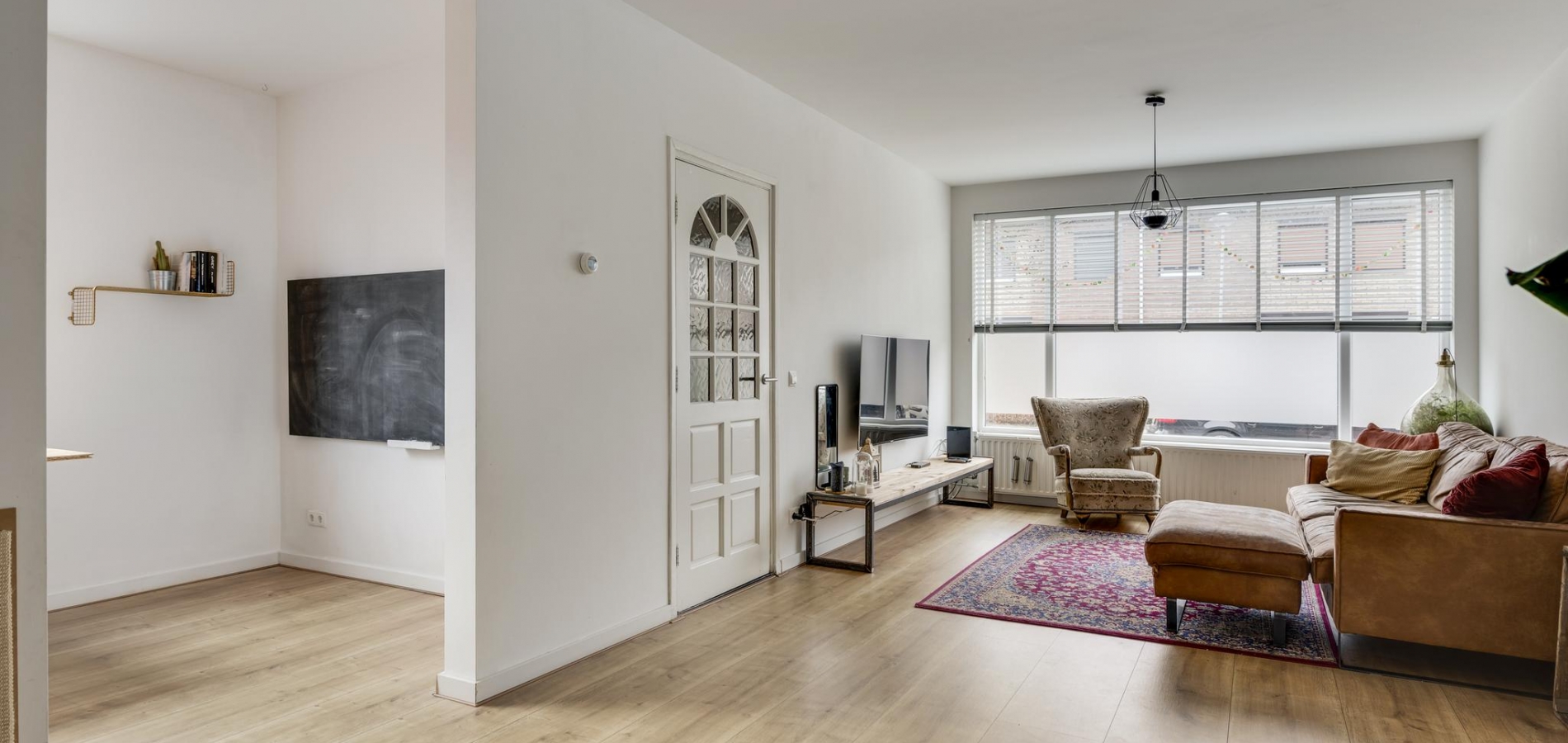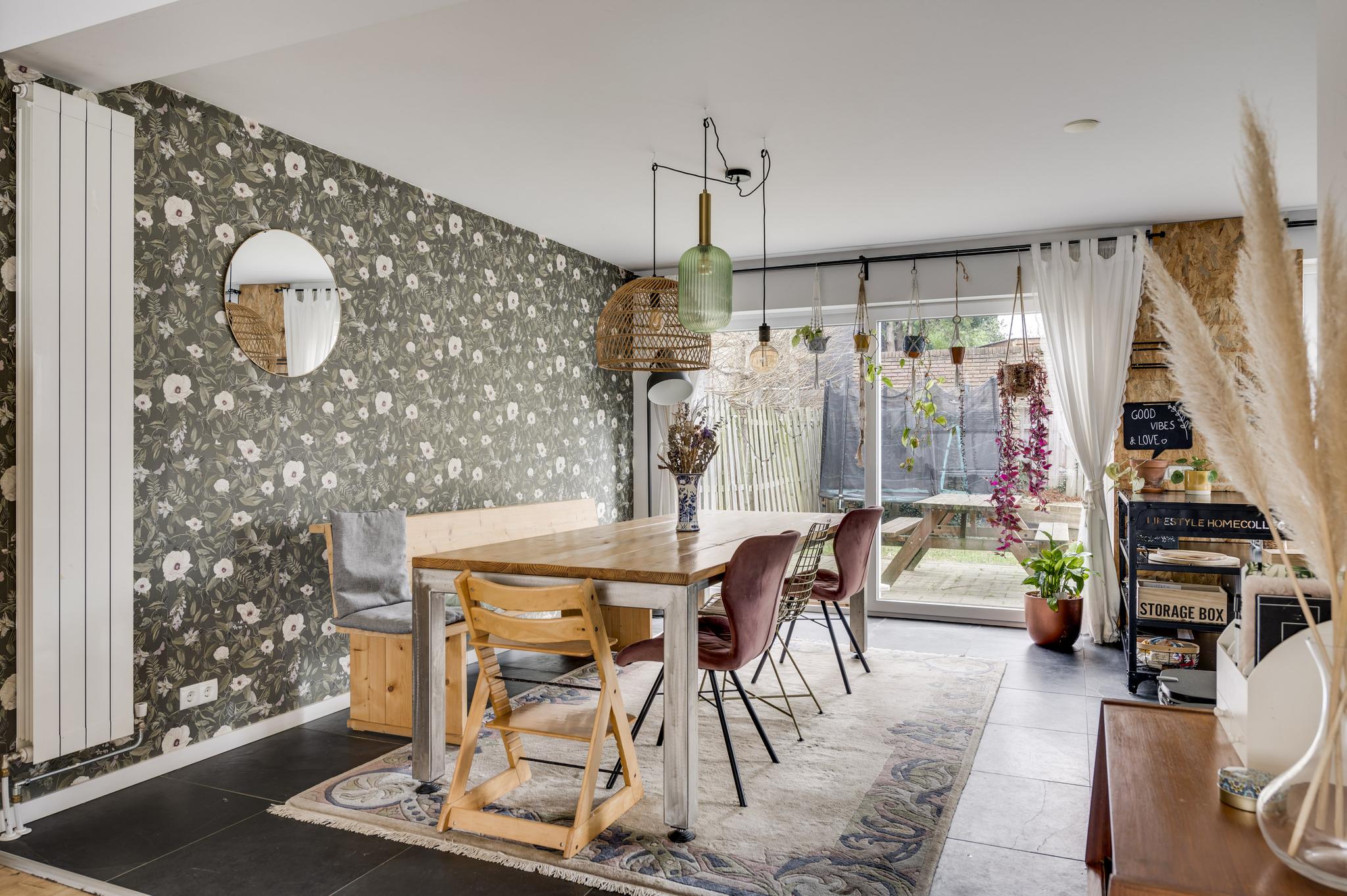 De woonkamer (7,27 x 3,50) staat in verbinding met de eetkamer (3,96 x 3,36) en een werk-/studeerplek (3,26 x 2,32). Het resultaat is een leefruimte van circa 46 m2 met een mooie wand-, plafond- en vloerafwerking. Door de grote ramen valt veel licht naar binnen en een grote schuifpui verbindt de eetkamer met de tuin.