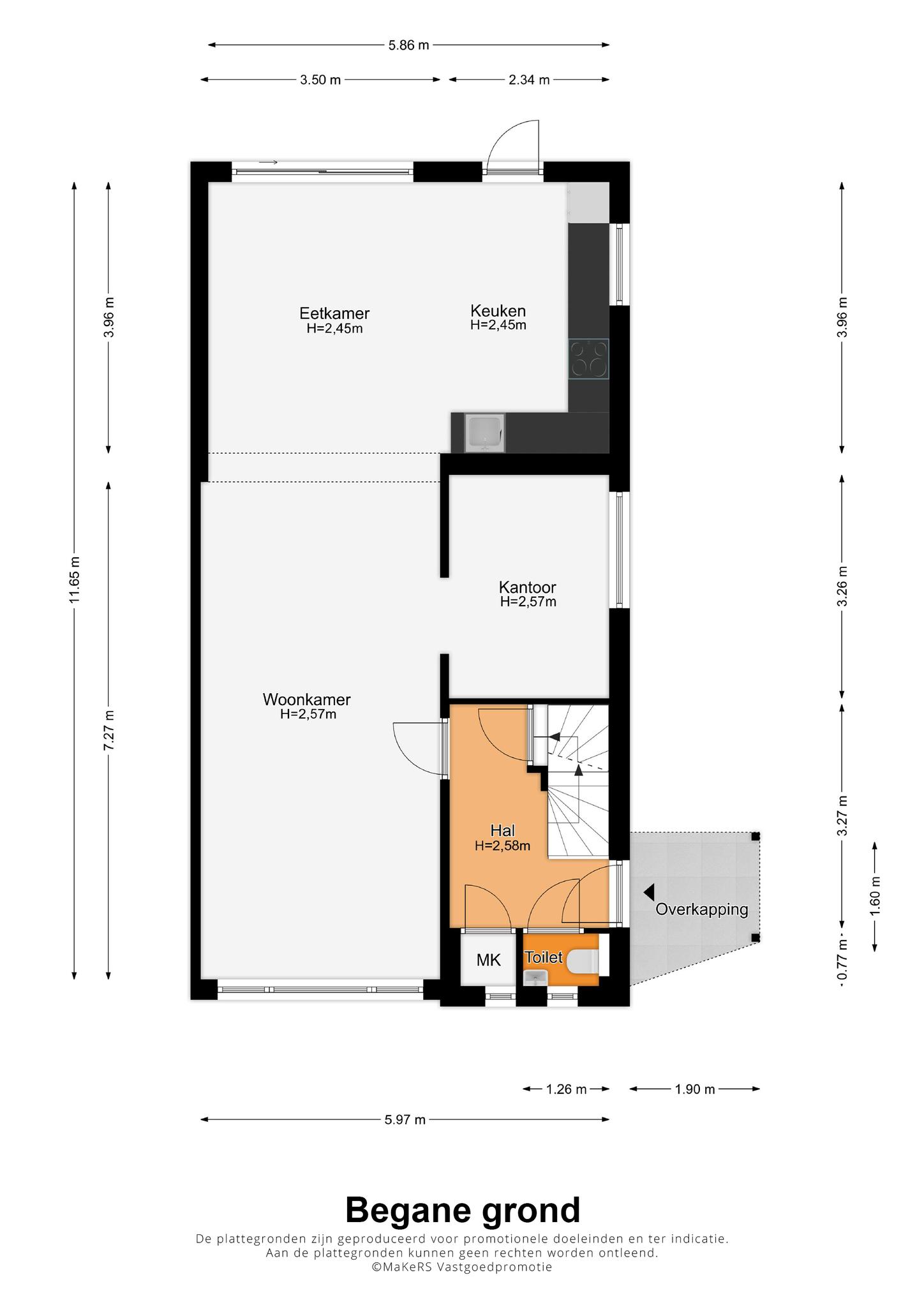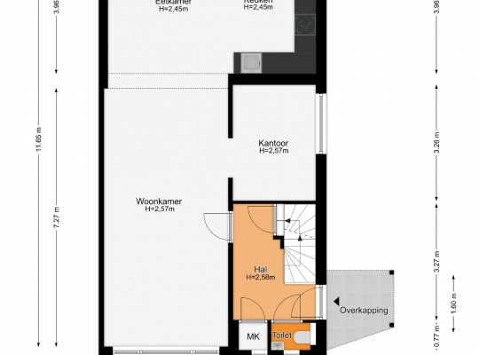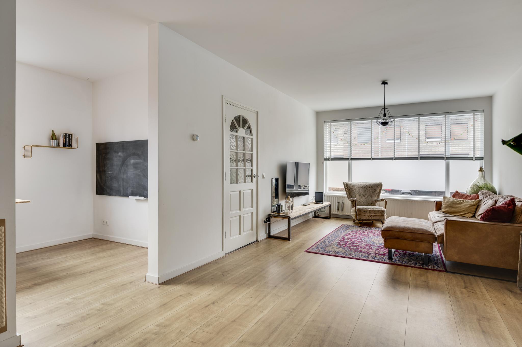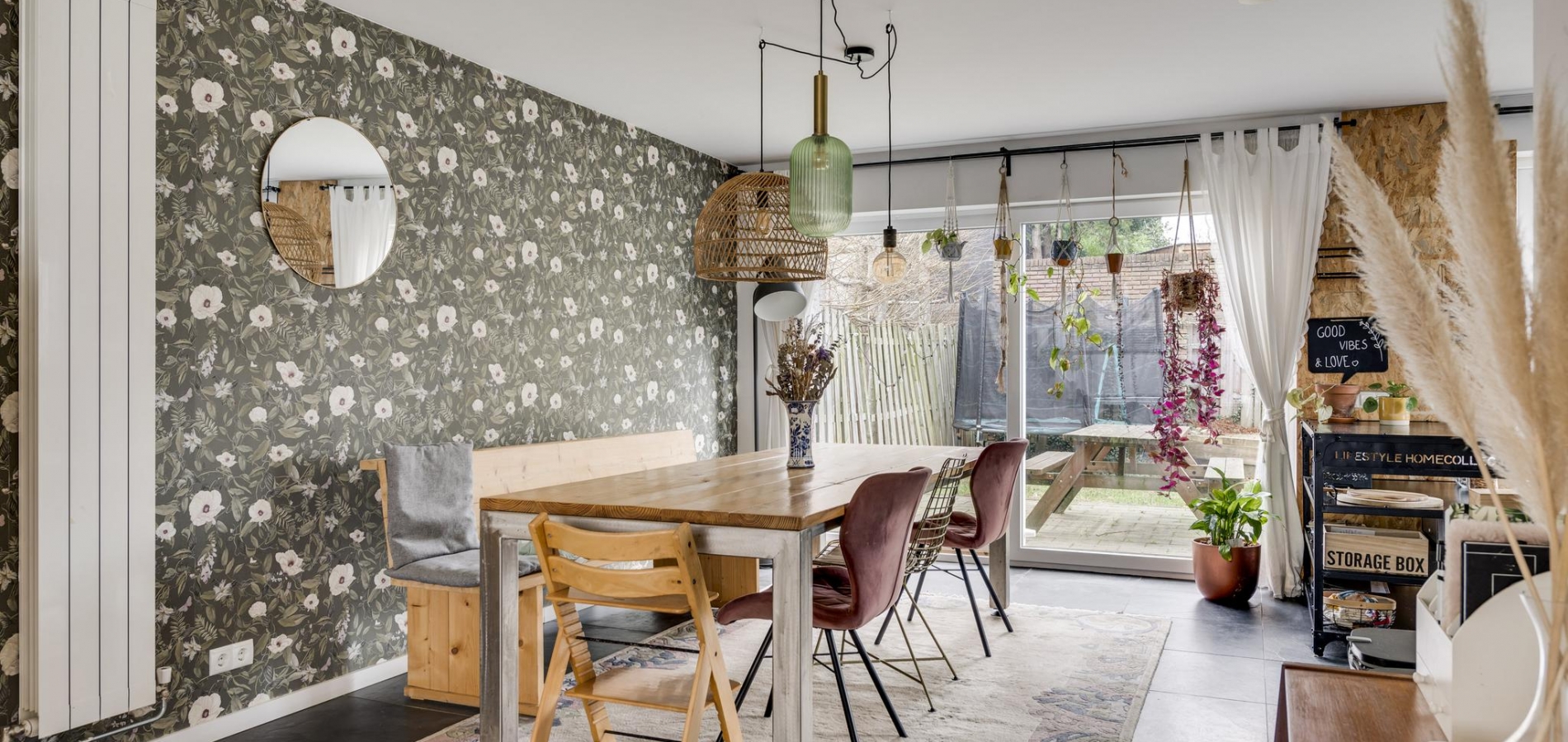 De woonkamer (7,27 x 3,50) staat in verbinding met de eetkamer (3,96 x 3,36) en een werk-/studeerplek (3,26 x 2,32). Het resultaat is een leefruimte van circa 46 m2 met een mooie wand-, plafond- en vloerafwerking. Door de grote ramen valt veel licht naar binnen en een grote schuifpui verbindt de eetkamer met de tuin.