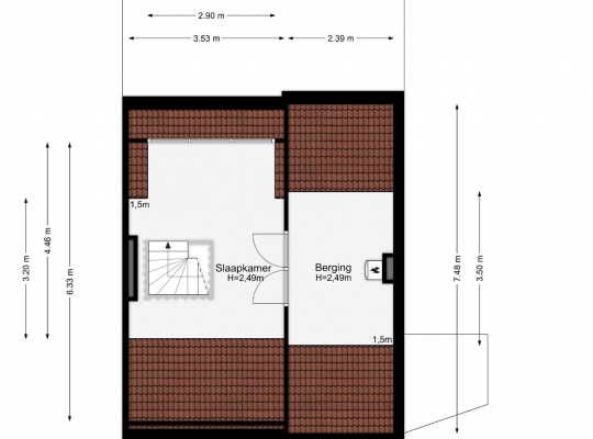 Een vaste trap geeft toegang tot een lichte zolderkamer (4,46 x 3,53) met een grote dakkapel. Aansluitend is een berging (3,50 x 2,39) met de opstelling van de HR-ketel (Remeha, huur).