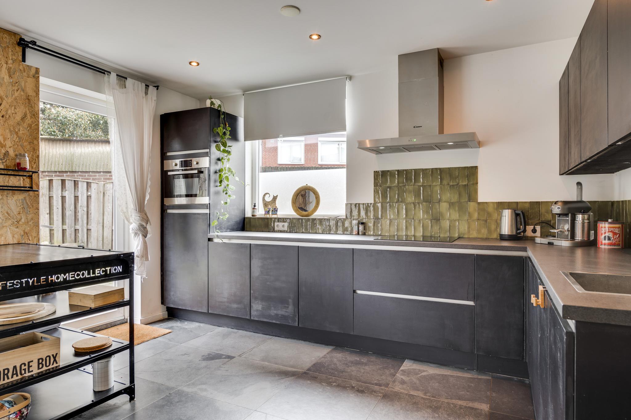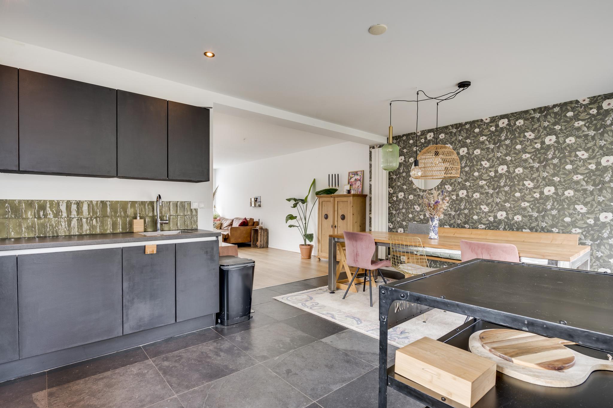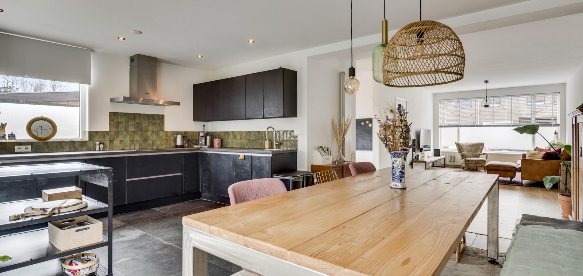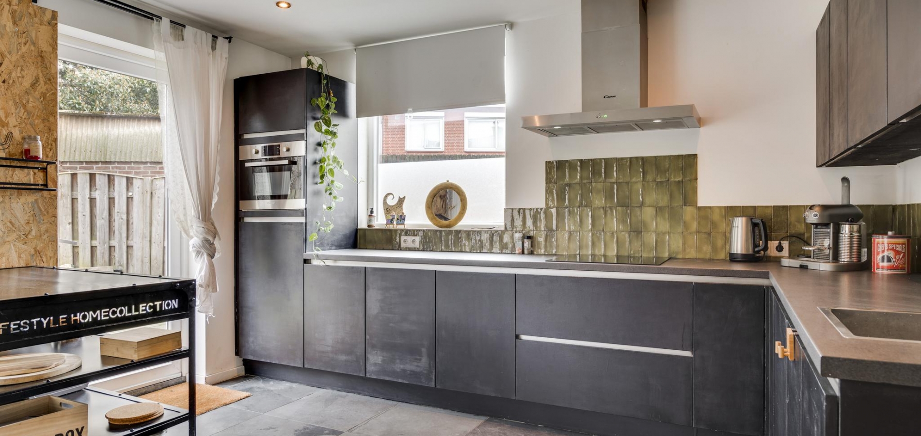 Niet alleen de eetkamer, maar ook de keuken (3,96 x 2,50) bevindt zich in de aanbouw. Er staat een moderne, ruime hoekopstelling (2016) met een keramische kookplaat, afzuigkap, vaatwasser, koelkast en een combimagnetron.