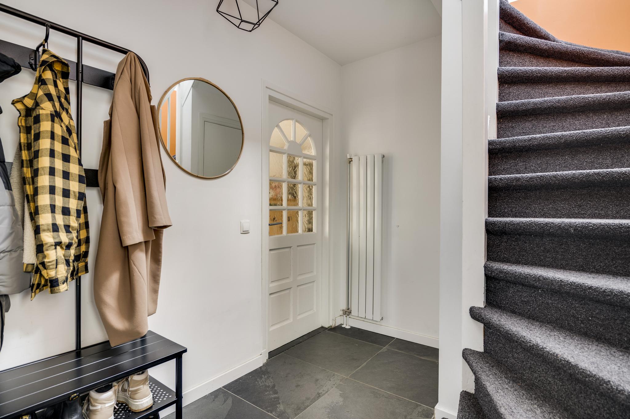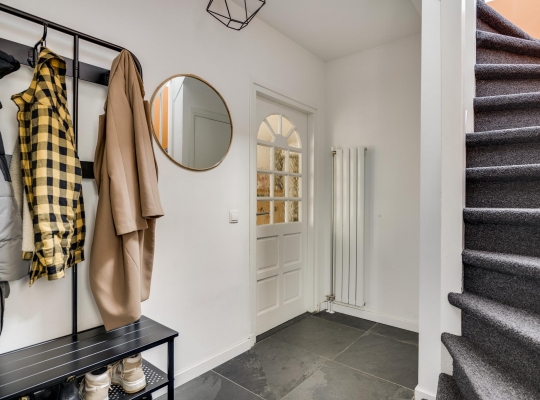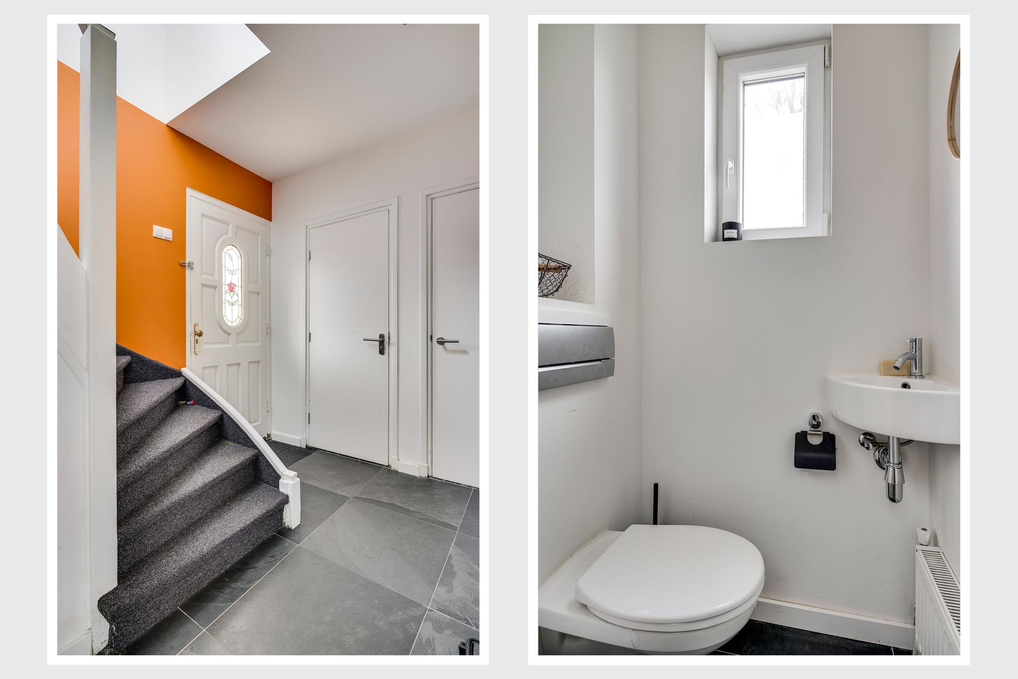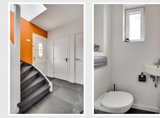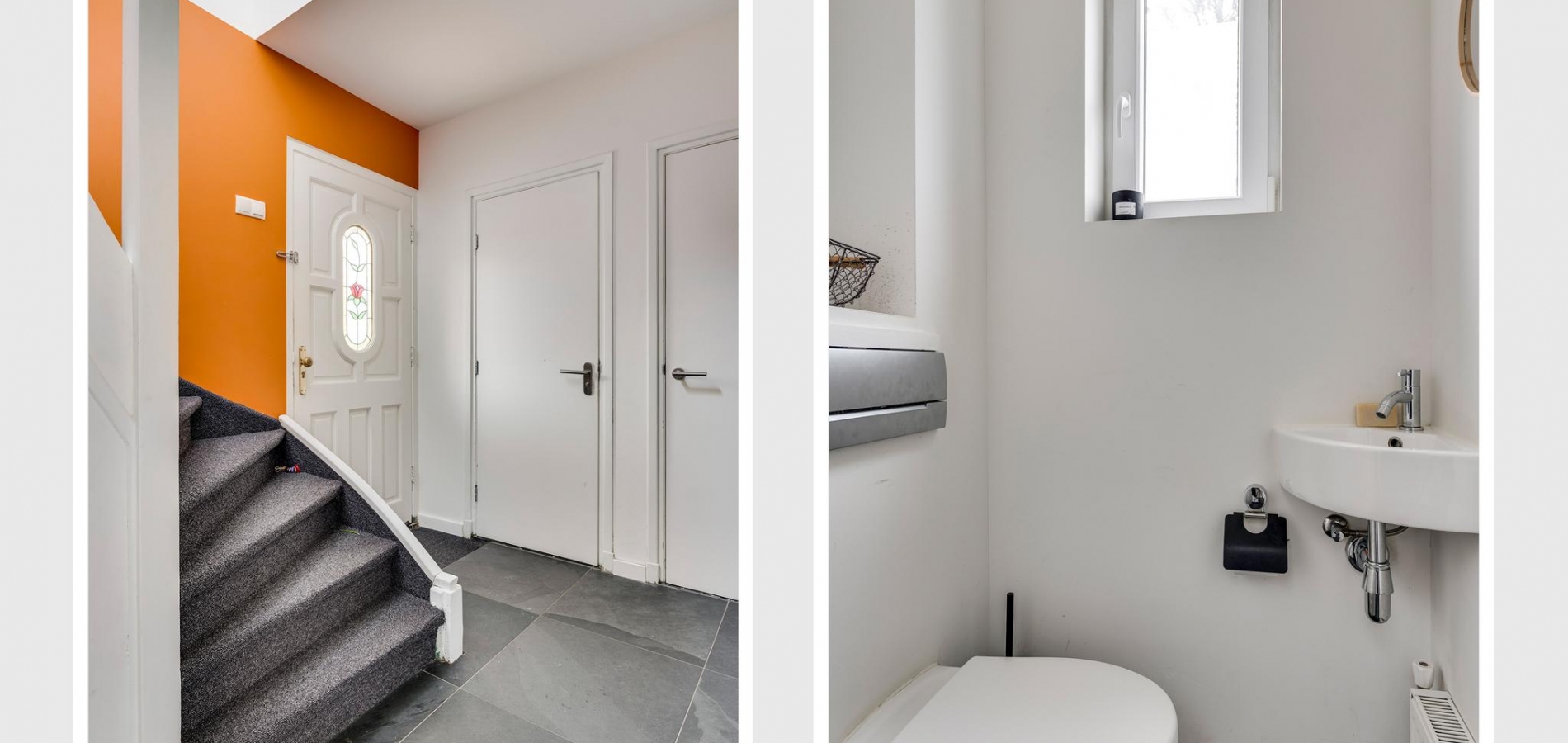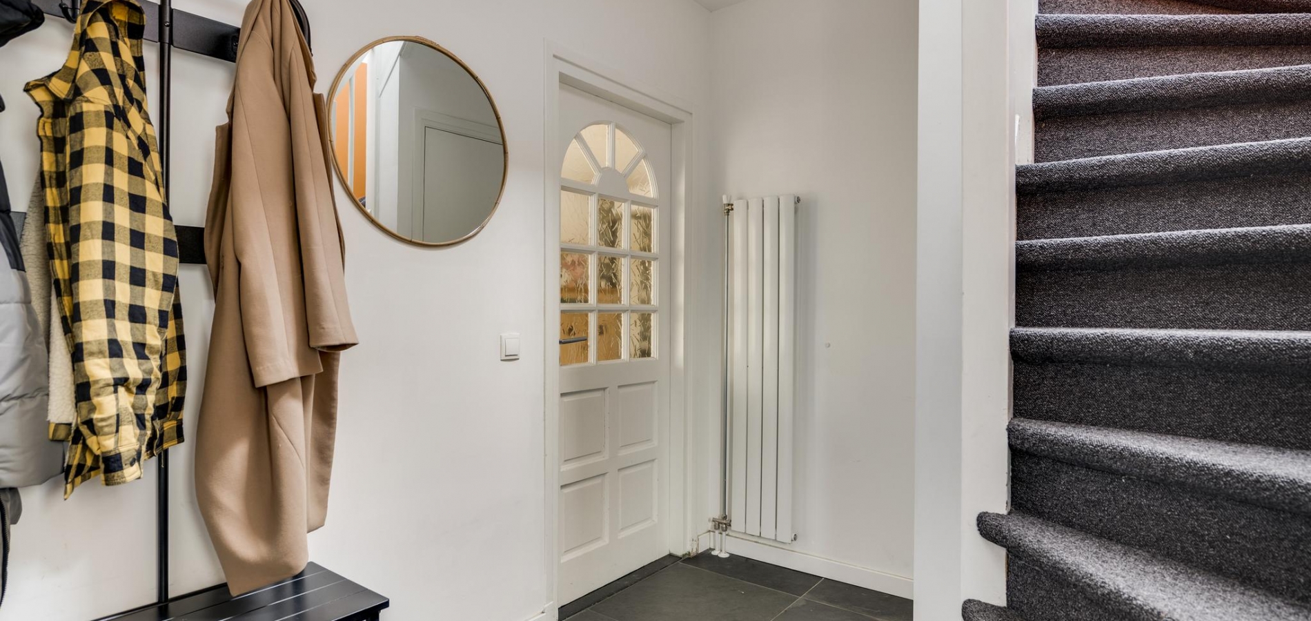 Open de kunststof voordeur naar de hal die, net als de rest van de woning, is verbouwd. Aan de linkerzijde zijn de meterkast en de toiletruimte, ingedeeld met een wandcloset en een fonteintje. In de hal ligt, net als in de eetkamer en keuken, een mooie tegelvloer van groot formaat.