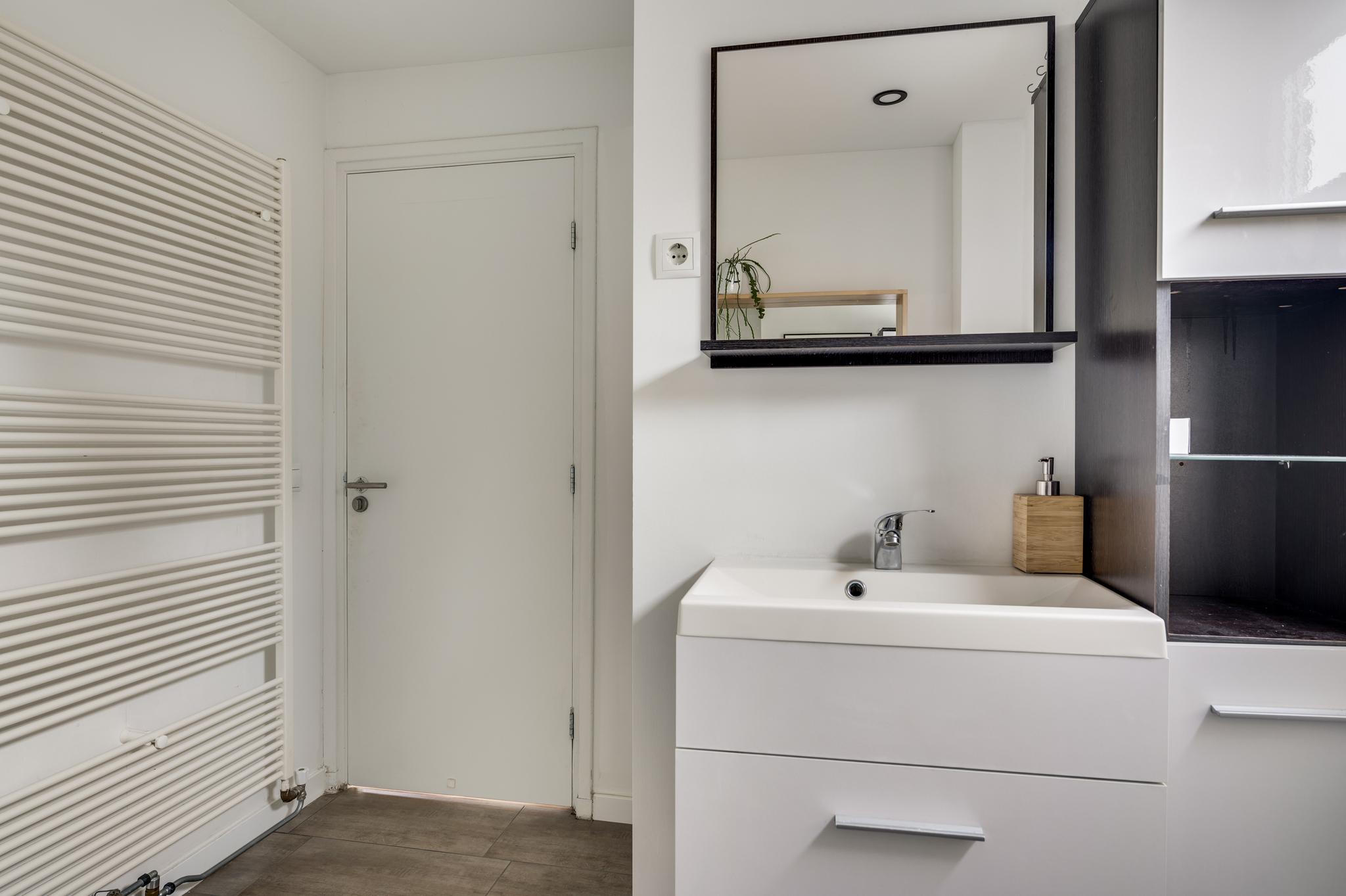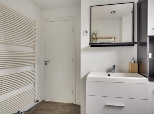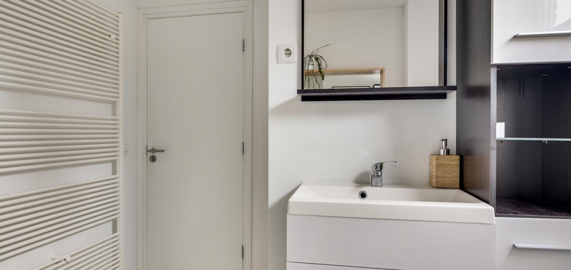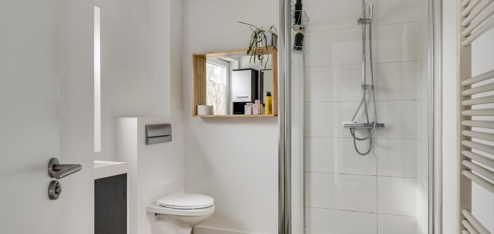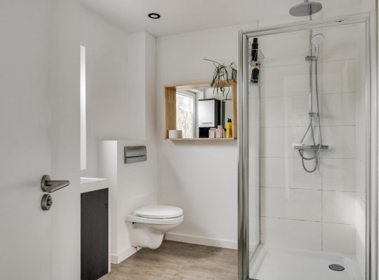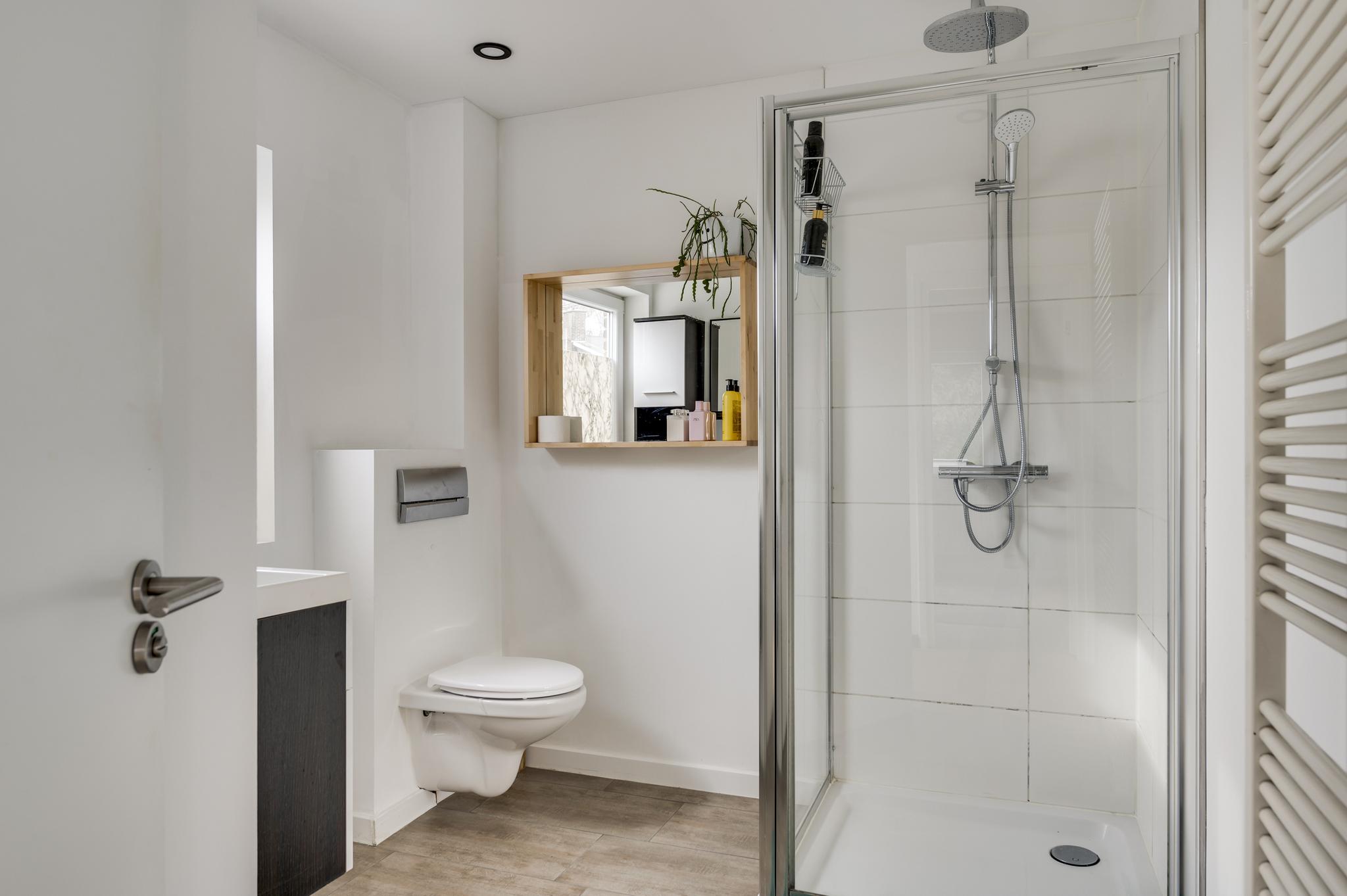 De badkamer (2,71/1,96 x 2,33) met raam in de zijgevel is ingedeeld met een douche, wandcloset en een wastafelmeubel. Lichte wandtegels in de douche zijn gecombineerd met stucwerk en keramische vloertegels met een houtmotief.