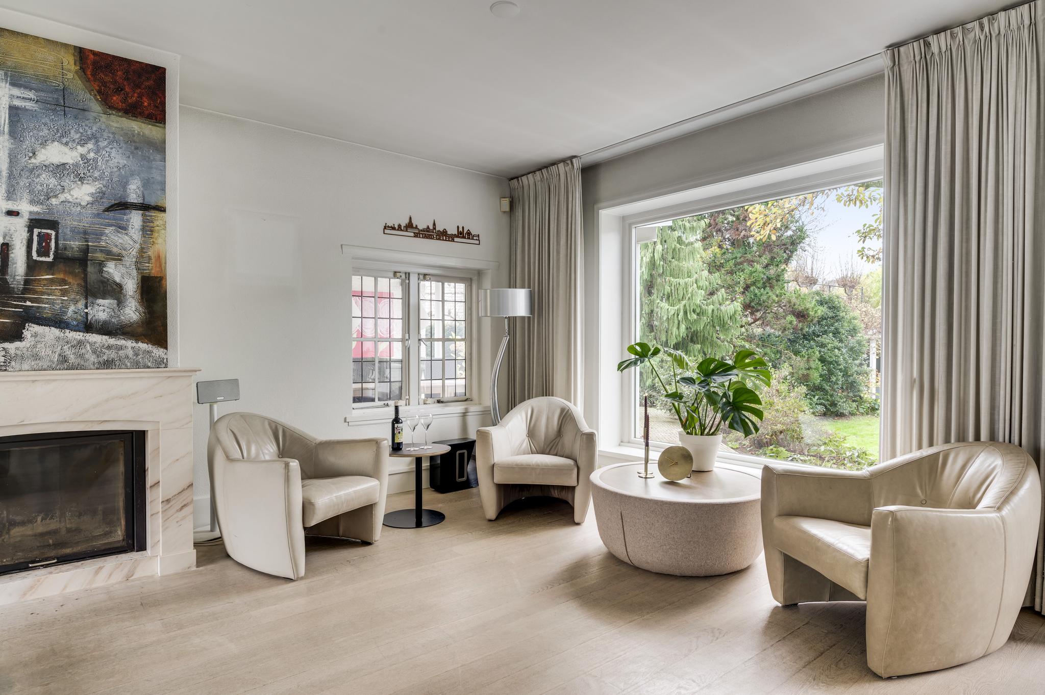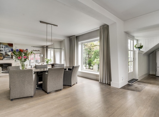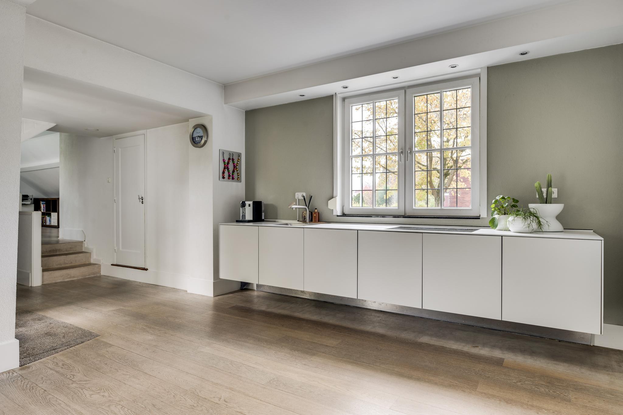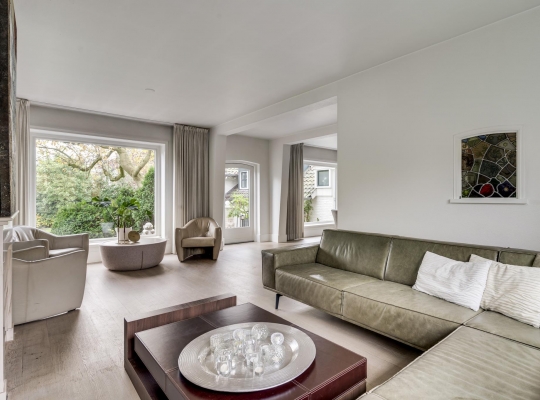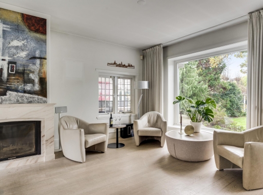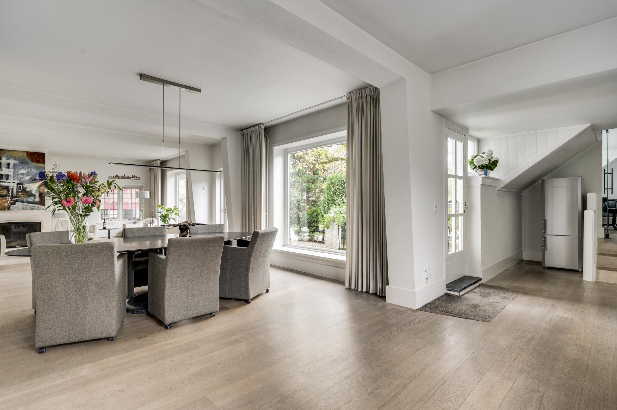 De entree verwelkomt u in een statige hal met authentieke tegelvloer, een meterkast en een indrukwekkende trappartij die leidt naar de eerste verdieping. Vanuit de hal betreedt u de ruime, lichte woonkamer met parketvloer en een klassieke marmeren haard met open haard, een gezellige plek voor avonden met familie of vrienden. De woonkamer loopt door naar de keuken, die is voorzien van een moderne, witte (Bulthaup) designinrichting en inductiekookplaat. Extra keukenapparatuur zoals oven, koelkast en vaatwasser zijn netjes geplaatst in de bijkeuken met aanbouwkeuken. Het toilet is modern en stijlvol met een zwevend closet en fonteintje. De keuken leidt naar een lichte tussenkamer met parketvloer en dakkapel, ideaal als werkruimte. Verderop vindt u nog een ruime 2e woonkamer, eveneens met parketvloer, twee dakkapellen en een knusse houtkachel, ideaal als speel/gamekamer voor de kinderen.