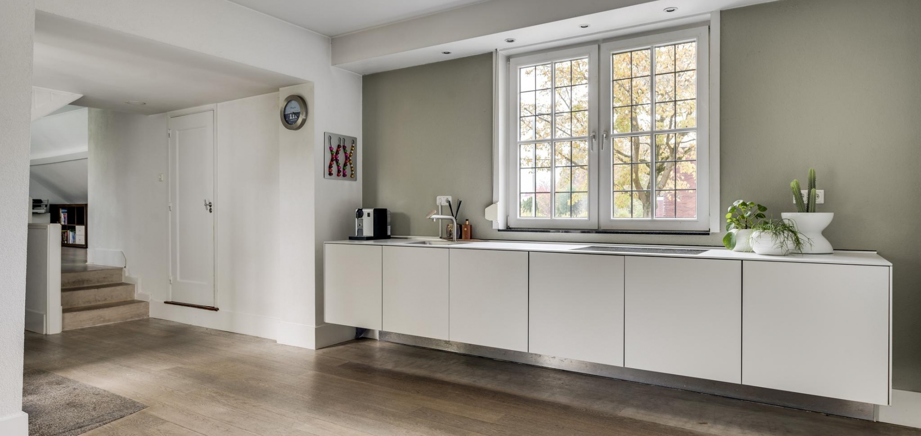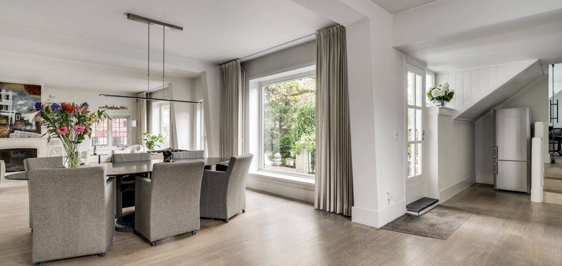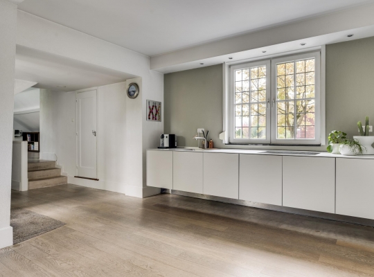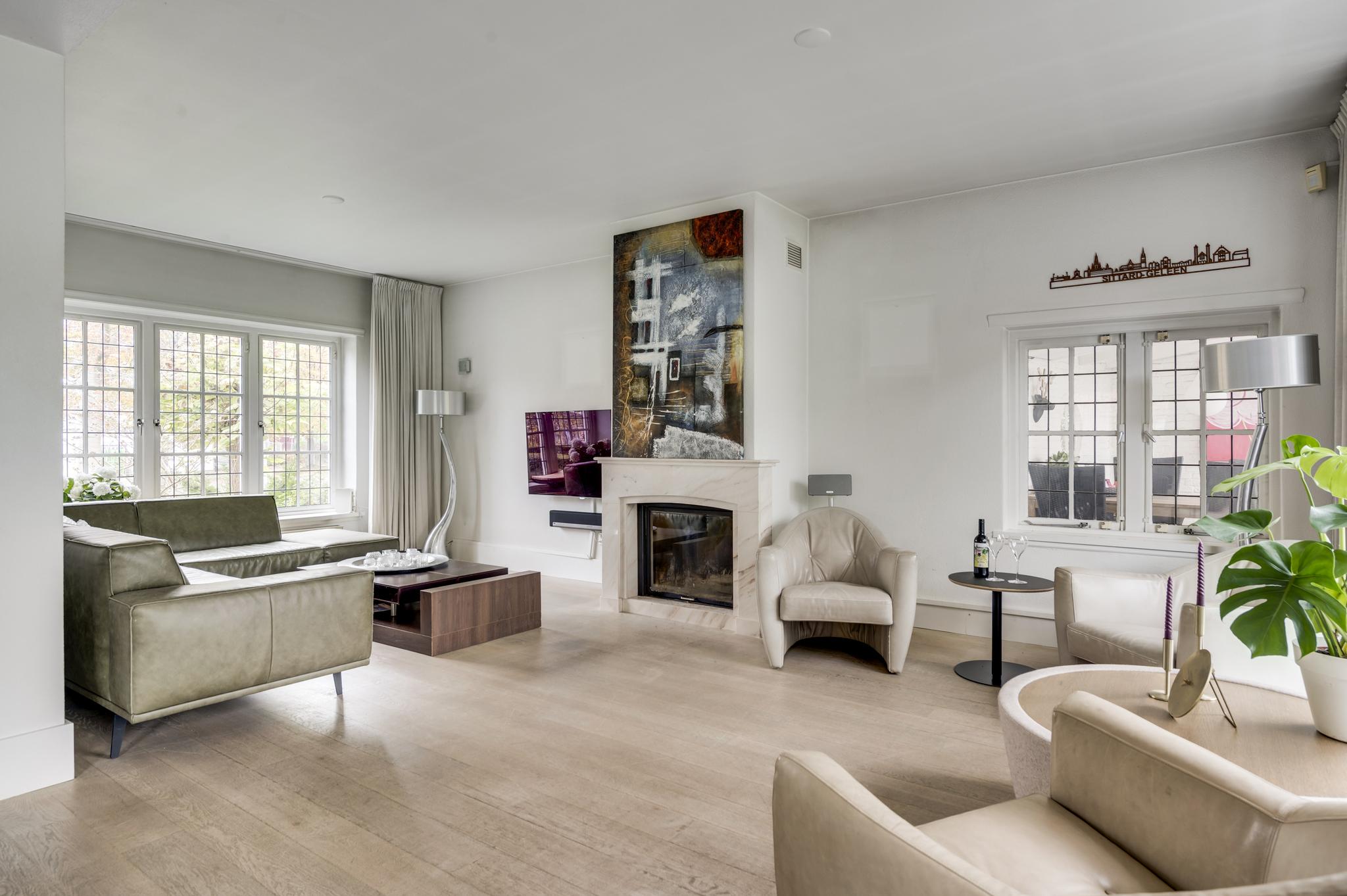 De entree verwelkomt u in een statige hal met authentieke tegelvloer, een meterkast en een indrukwekkende trappartij die leidt naar de eerste verdieping. Vanuit de hal betreedt u de ruime, lichte woonkamer met parketvloer en een klassieke marmeren haard met open haard, een gezellige plek voor avonden met familie of vrienden. De woonkamer loopt door naar de keuken, die is voorzien van een moderne, witte (Bulthaup) designinrichting en inductiekookplaat. Extra keukenapparatuur zoals oven, koelkast en vaatwasser zijn netjes geplaatst in de bijkeuken met aanbouwkeuken. Het toilet is modern en stijlvol met een zwevend closet en fonteintje. De keuken leidt naar een lichte tussenkamer met parketvloer en dakkapel, ideaal als werkruimte. Verderop vindt u nog een ruime 2e woonkamer, eveneens met parketvloer, twee dakkapellen en een knusse houtkachel, ideaal als speel/gamekamer voor de kinderen.