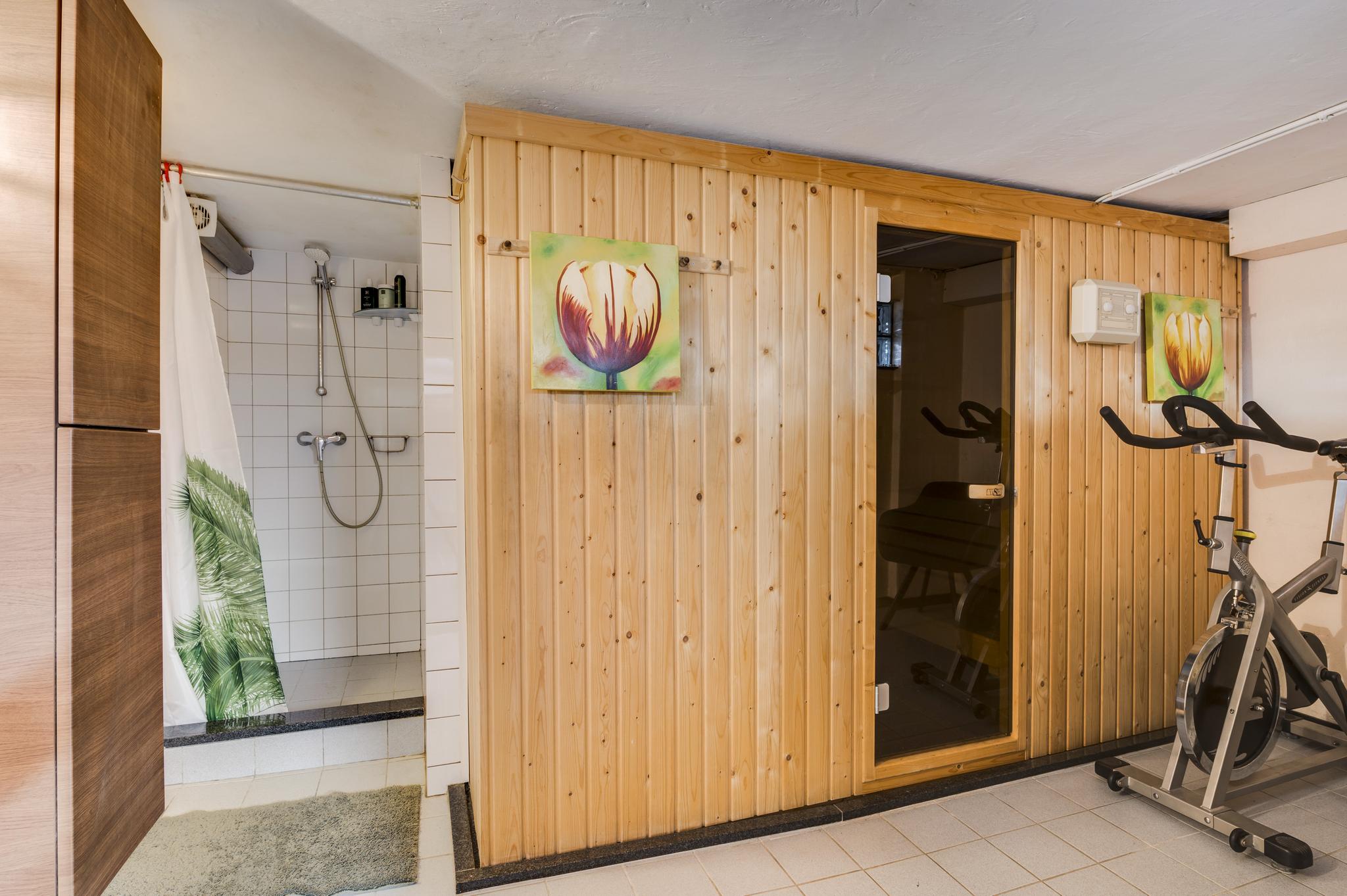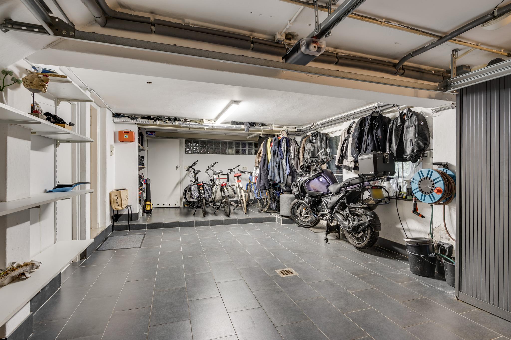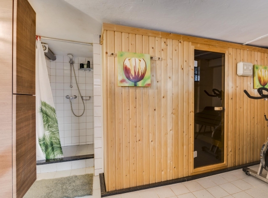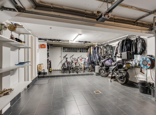 Aan de zijkant van de woning is er een eigen ingang naar het souterrain, waar u binnenkomt in een hal die toegang geeft tot drie multifunctionele ruimtes. Deze kamers, met laminaatvloer, zijn ideaal als praktijkruimte, hobbyruimte of voor andere doeleinden. Hier vindt u ook een volledig betegeld toilet en toegang tot de tuin en de inpandige garage. De garage heeft een tegelvloer en sectionaalpoort en geeft toegang tot een ontspannende sauna met douche. Daarnaast zijn er op deze verdieping een handige provisiekelder, cv-ruimte en een waskelder aanwezig.