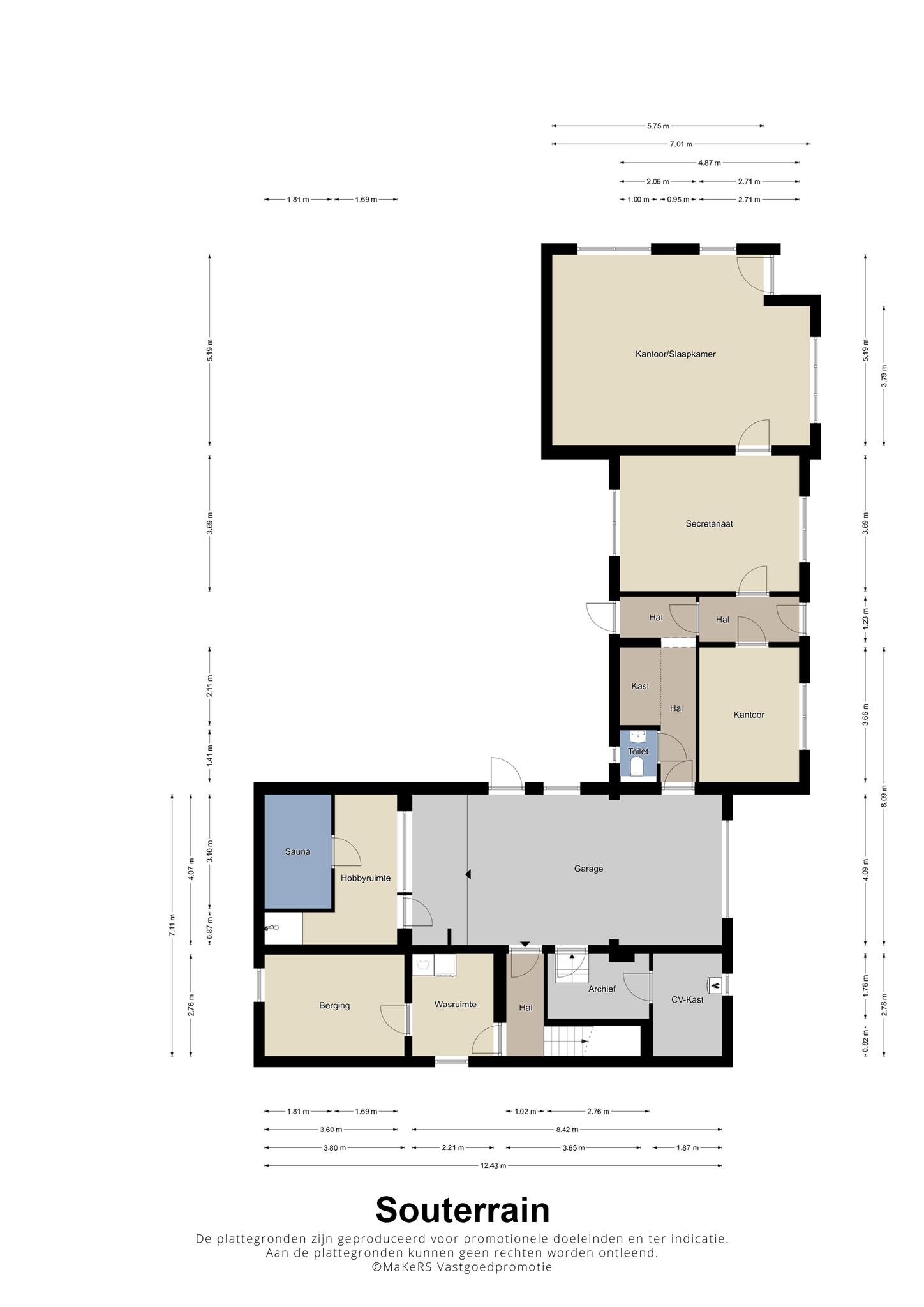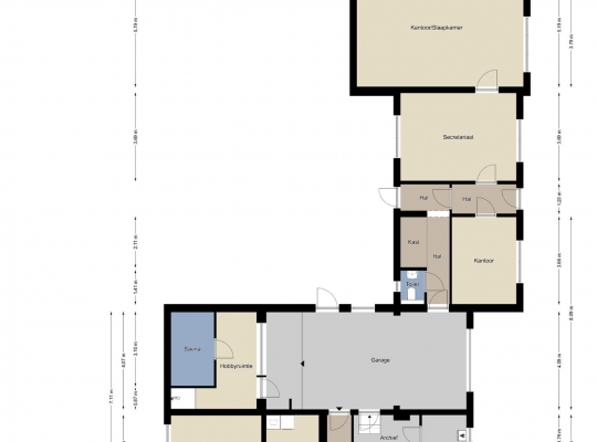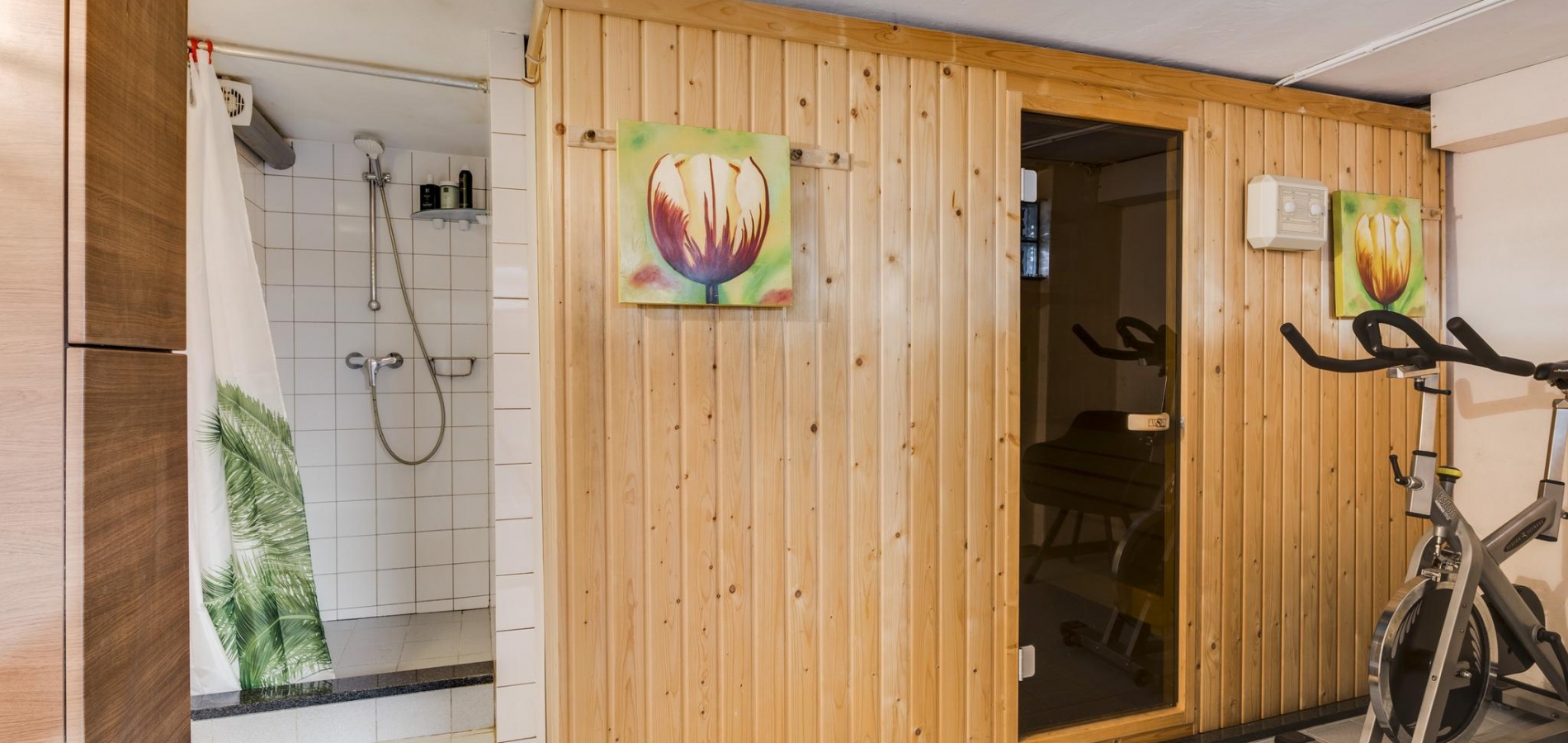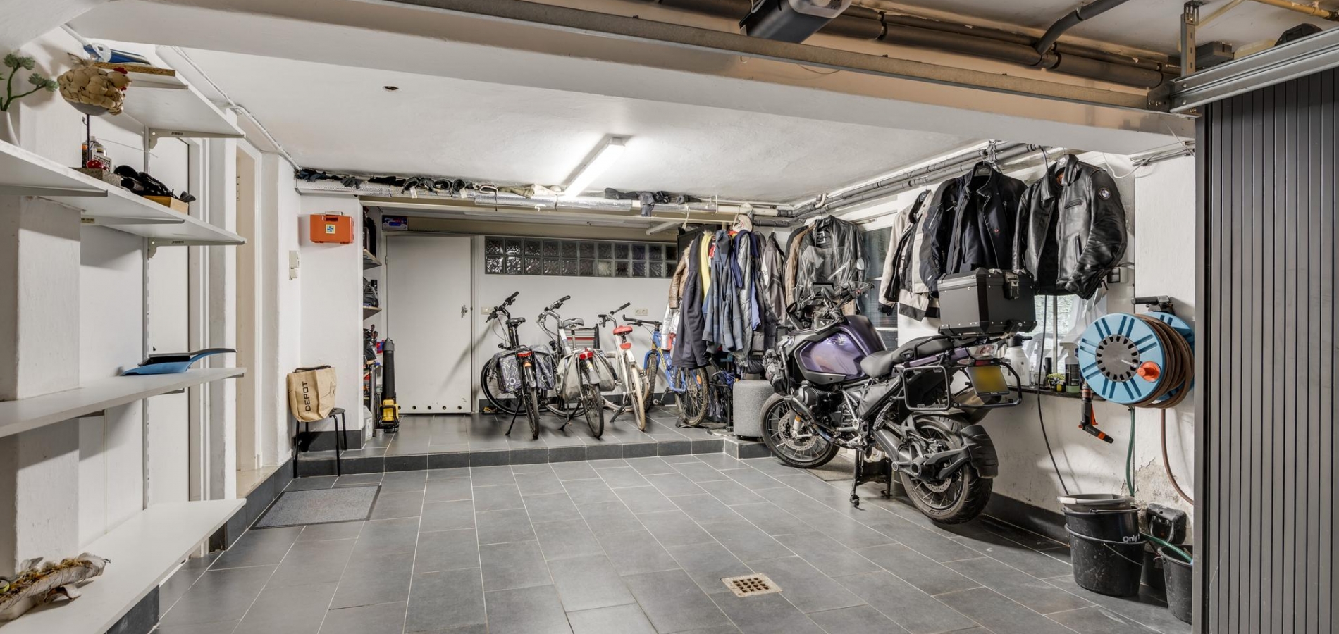 Aan de zijkant van de woning is er een eigen ingang naar het souterrain, waar u binnenkomt in een hal die toegang geeft tot drie multifunctionele ruimtes. Deze kamers, met laminaatvloer, zijn ideaal als praktijkruimte, hobbyruimte of voor andere doeleinden. Hier vindt u ook een volledig betegeld toilet en toegang tot de tuin en de inpandige garage. De garage heeft een tegelvloer en sectionaalpoort en geeft toegang tot een ontspannende sauna met douche. Daarnaast zijn er op deze verdieping een handige provisiekelder, cv-ruimte en een waskelder aanwezig.