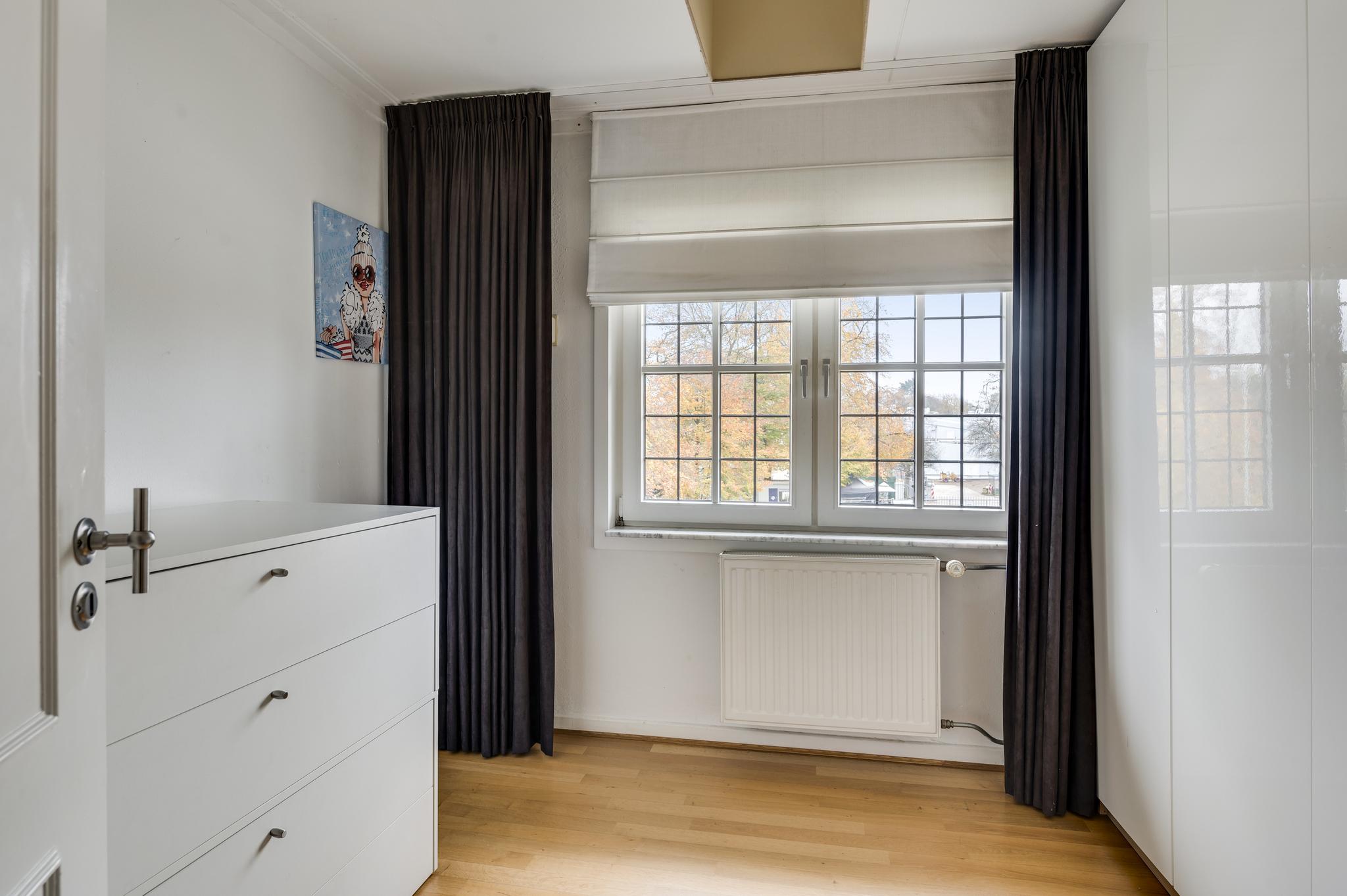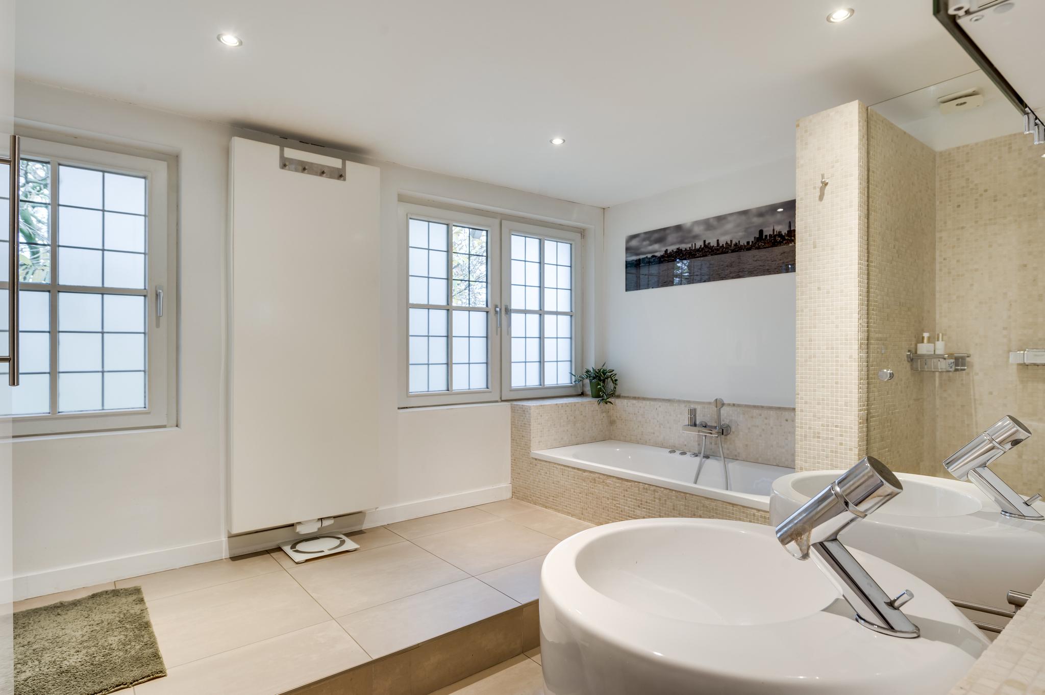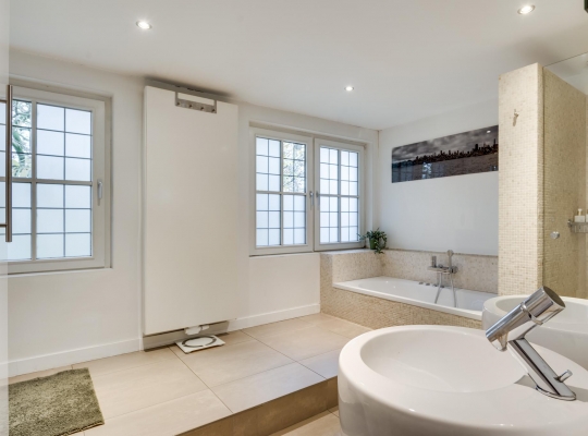 Via de royale overloop bereikt u drie ruime slaapkamers, de badkamer en een tussenruimte met een vaste trap naar de tweede verdieping. De masterbedroom ligt aan de voorzijde en biedt toegang tot een ruim balkon, waar u heerlijk kunt genieten van het uitzicht op de tuin. Deze slaapkamer heeft ook directe toegang tot de badkamer. De tweede slaapkamer ligt ook aan de voorzijde en de derde aan de zijkant van de woning; alle kamers zijn voorzien van een parketvloer. De badkamer is modern en stijlvol met mozaïektegels, een ligbad, douche, dubbele wastafel, zwevend toilet en een designradiator.