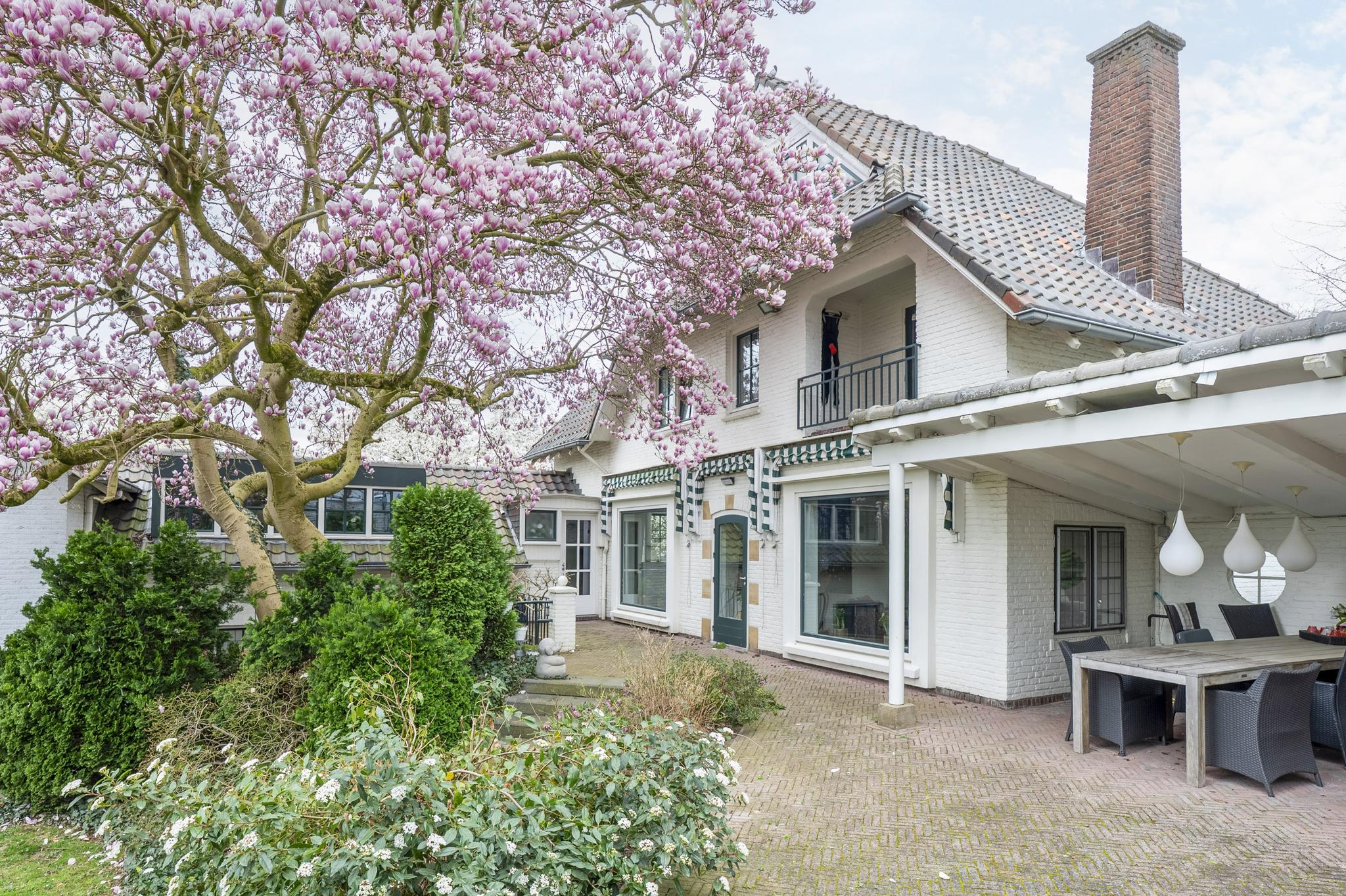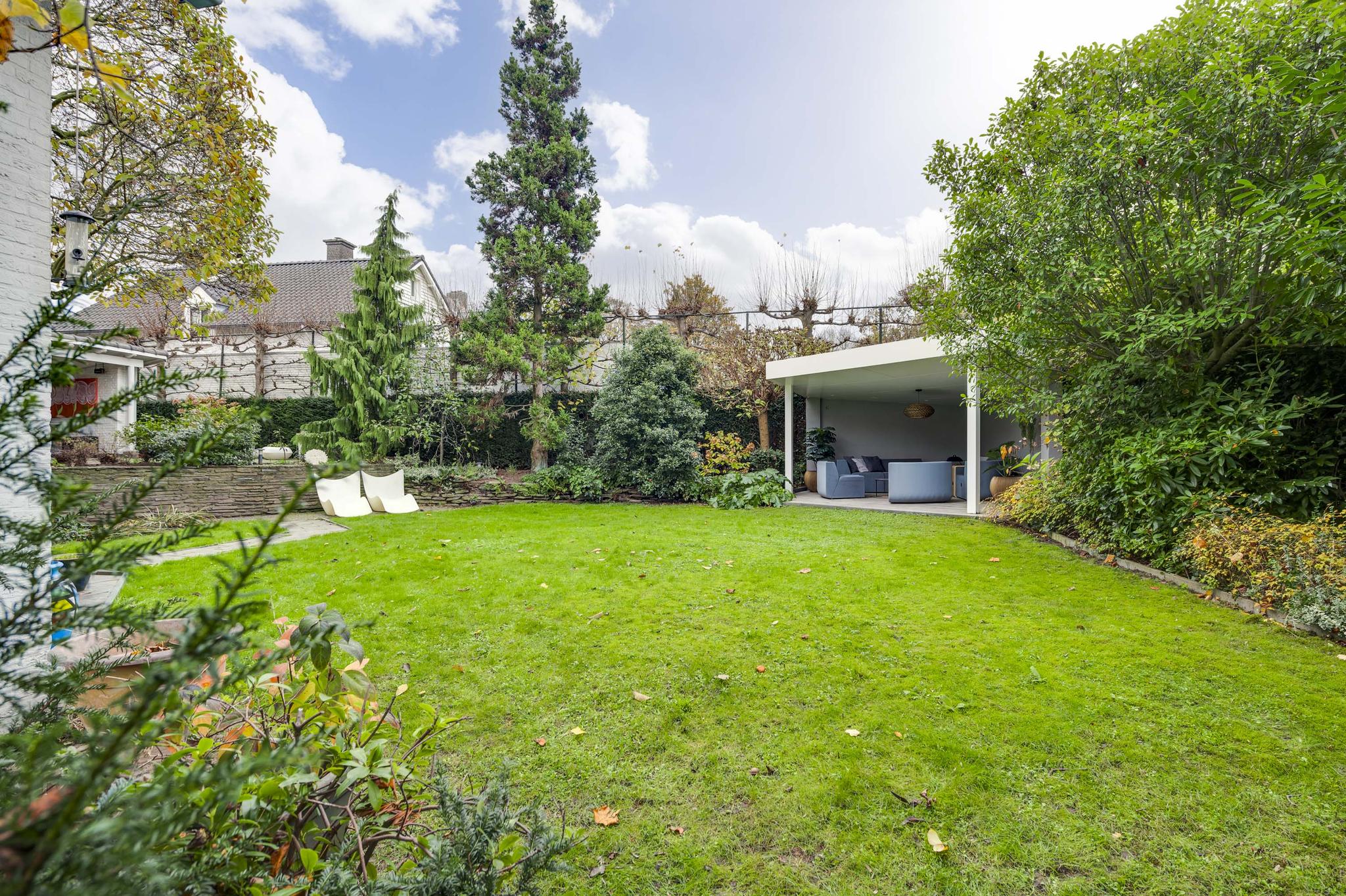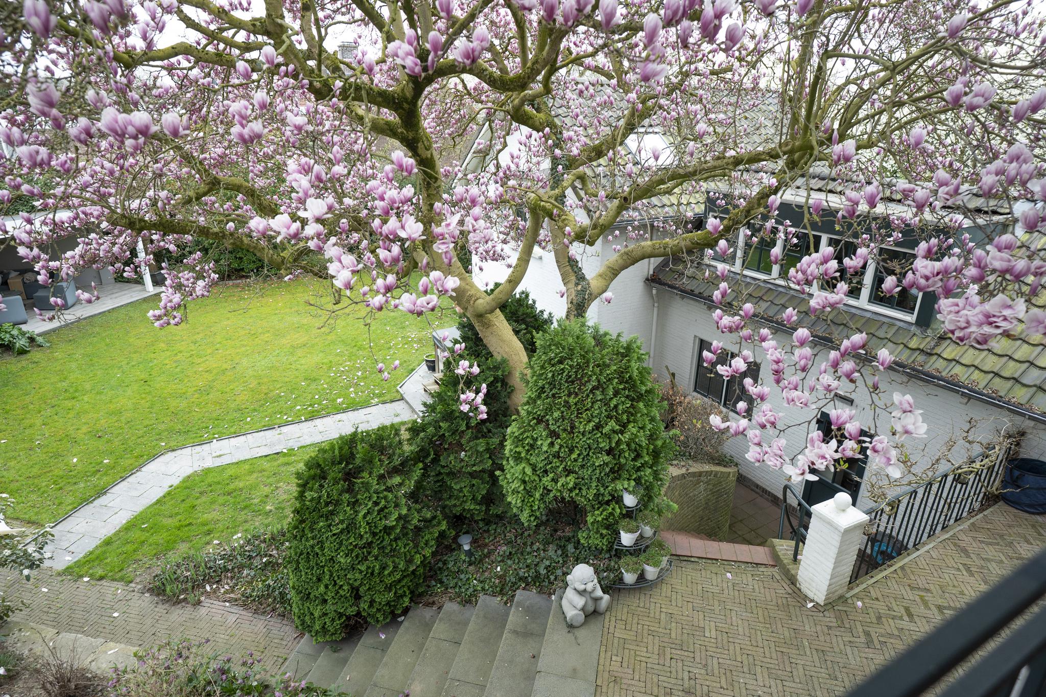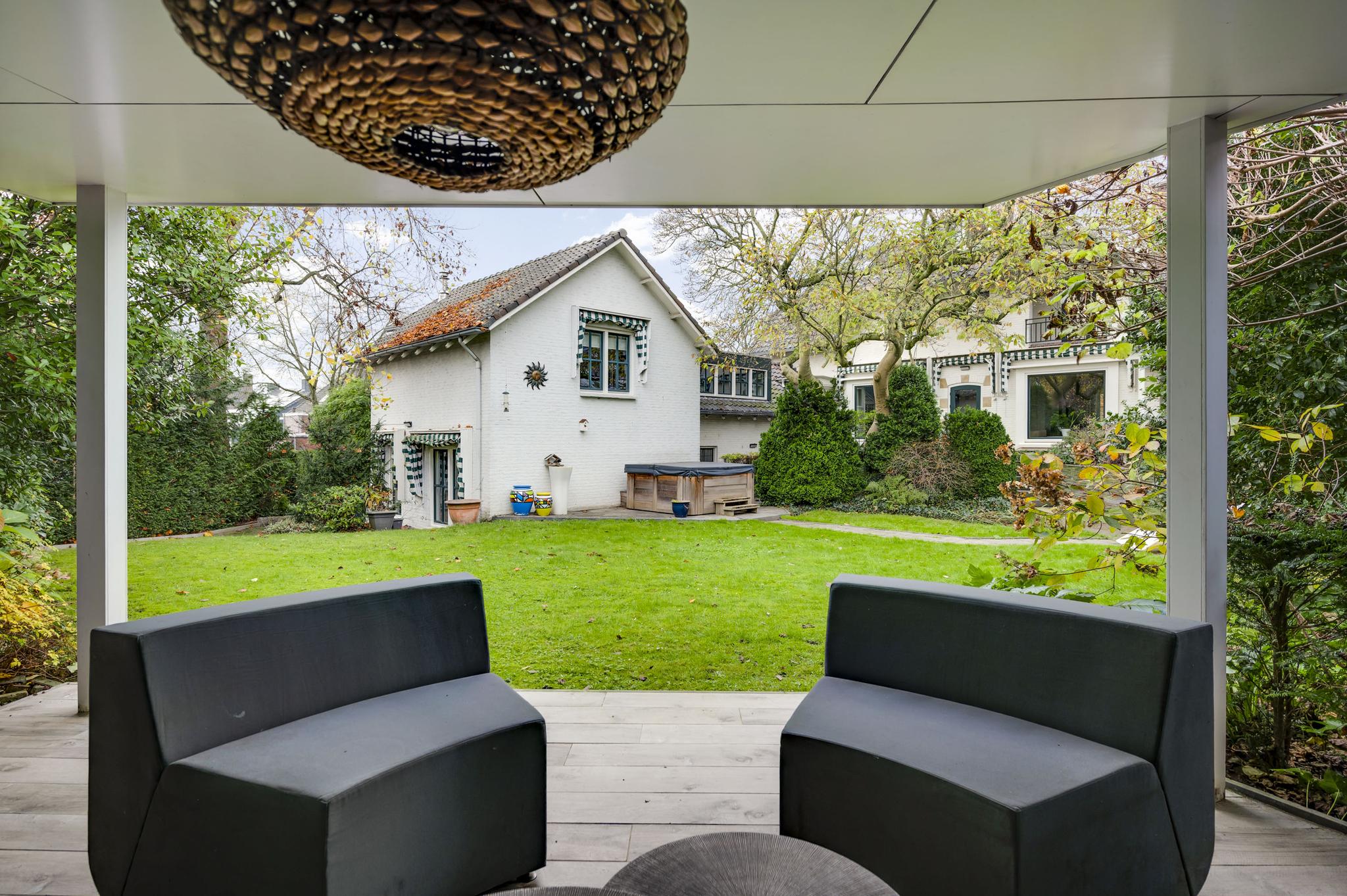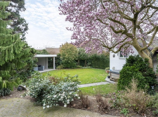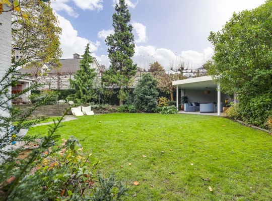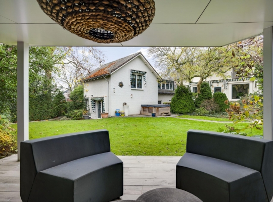 De rondom gelegen tuin is met zorg aangelegd en heeft een speelse indeling met niveauverschillen, wat voor een bijzondere uitstraling zorgt. U geniet hier van optimale privacy en heeft de luxe van twee overdekte terrassen, een gazon en sfeervolle borders. De achtertuin ligt op het zonnige zuiden.