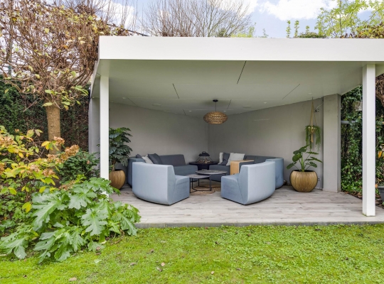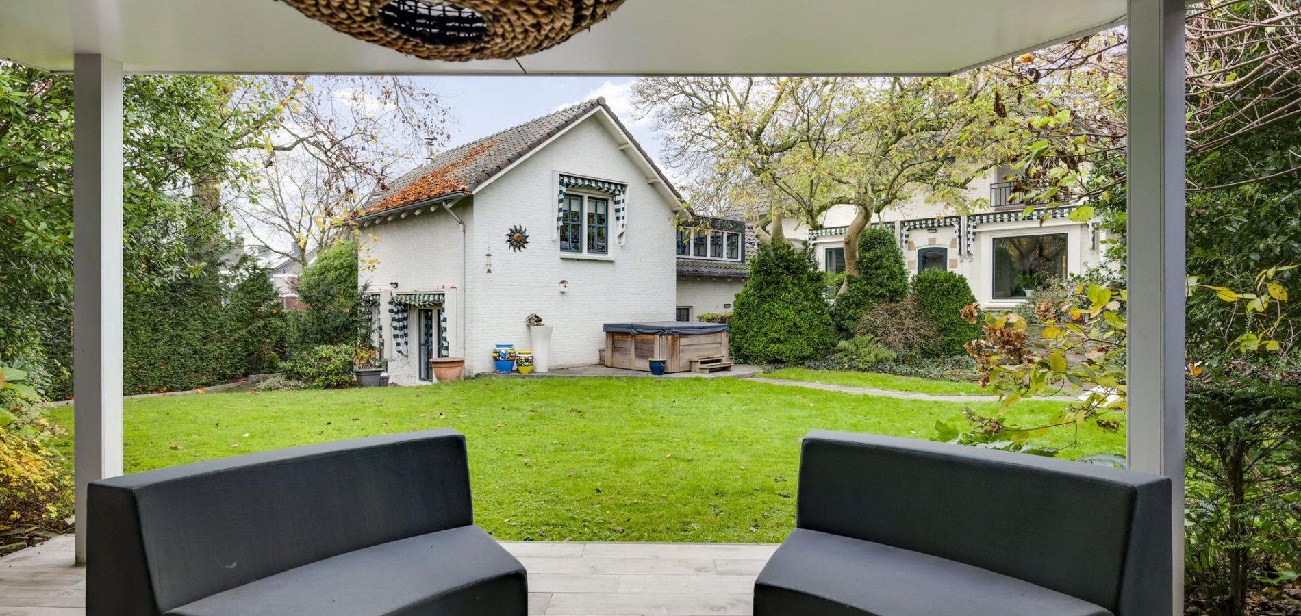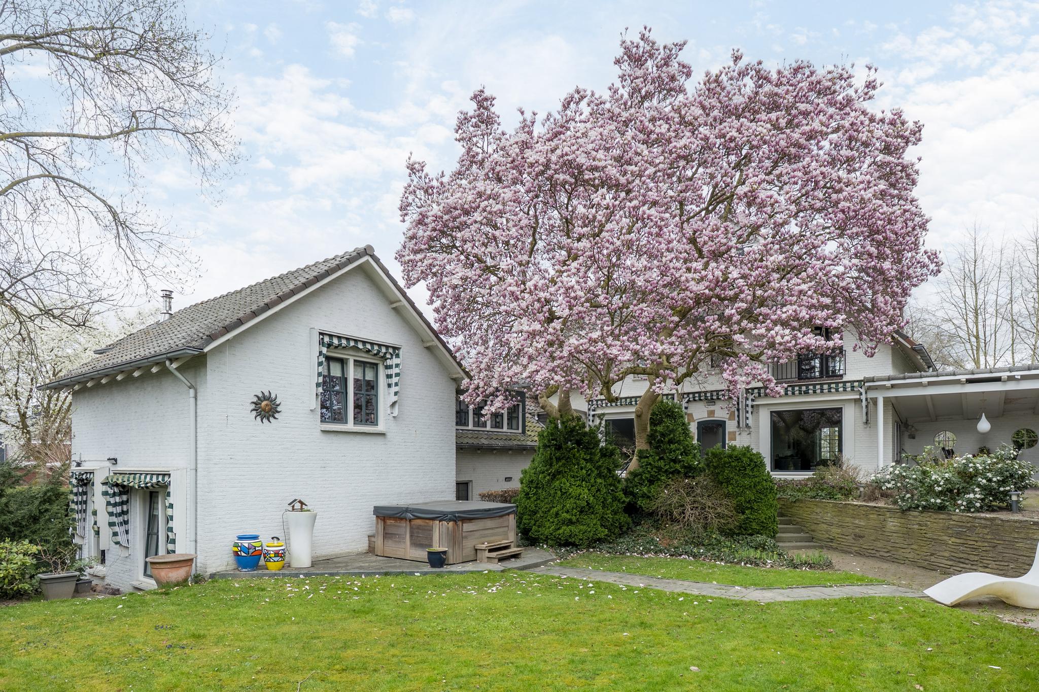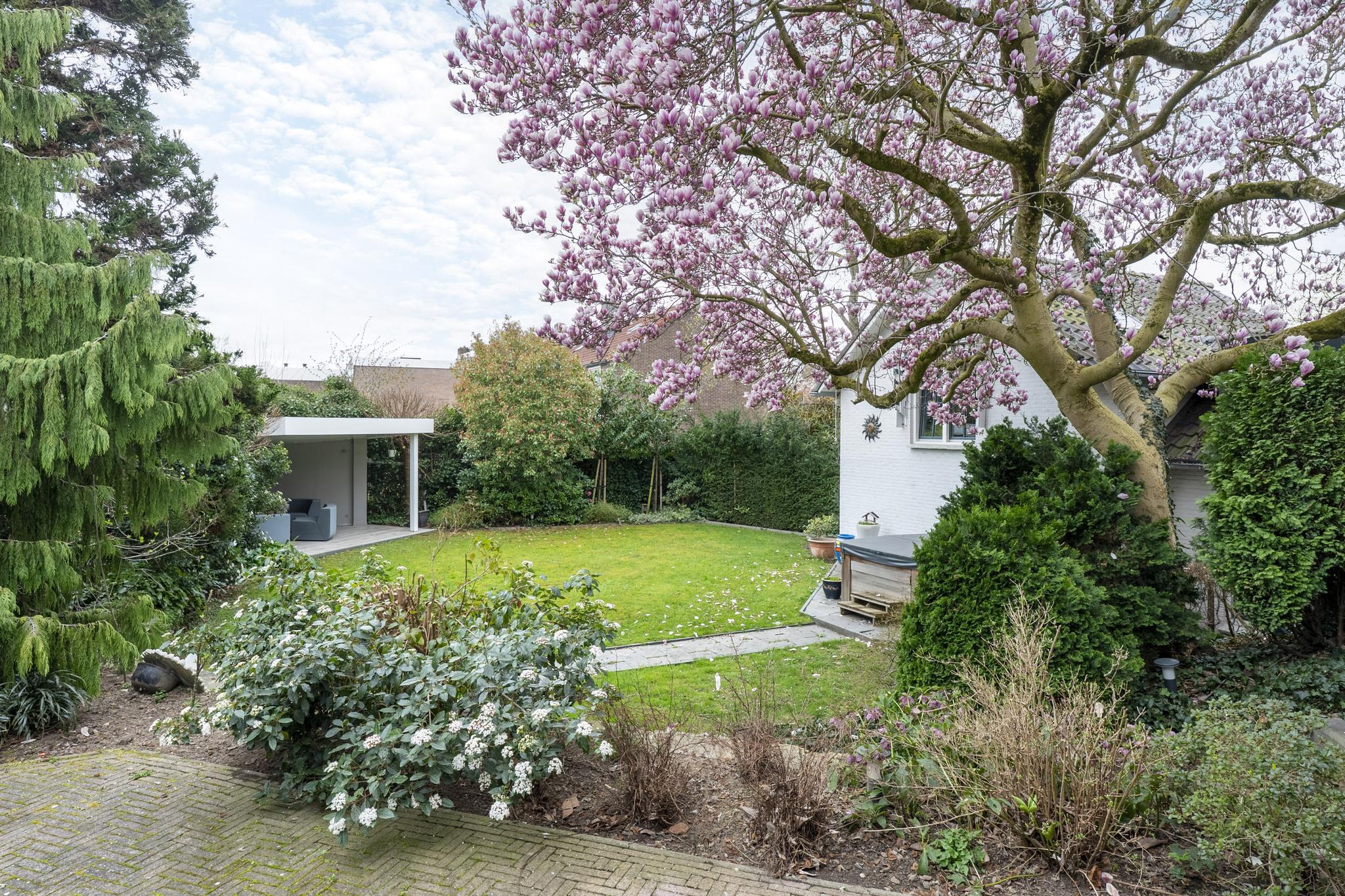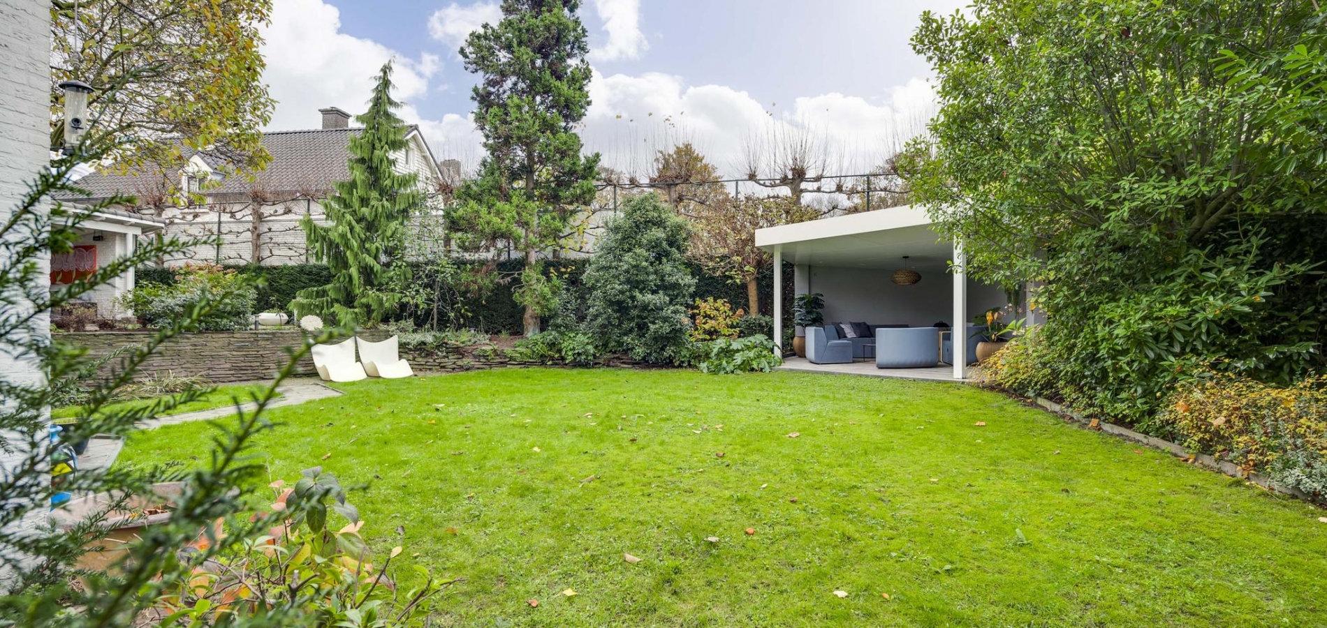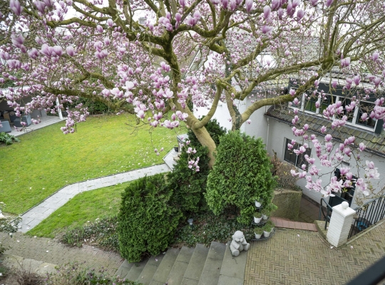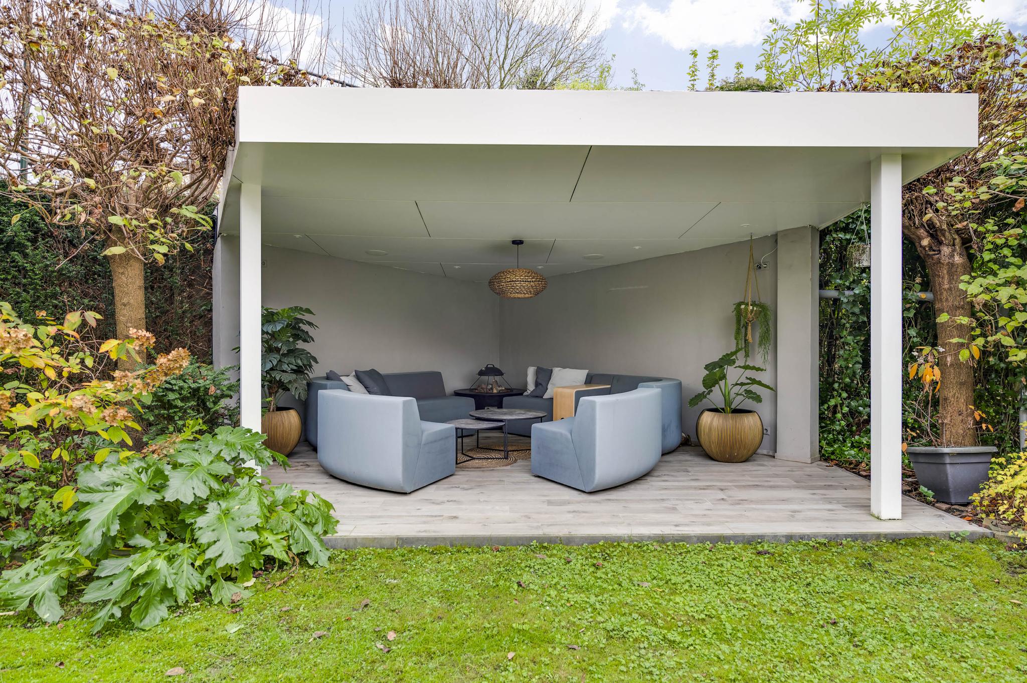 De rondom gelegen tuin is met zorg aangelegd en heeft een speelse indeling met niveauverschillen, wat voor een bijzondere uitstraling zorgt. U geniet hier van optimale privacy en heeft de luxe van twee overdekte terrassen, een gazon en sfeervolle borders. De achtertuin ligt op het zonnige zuiden.