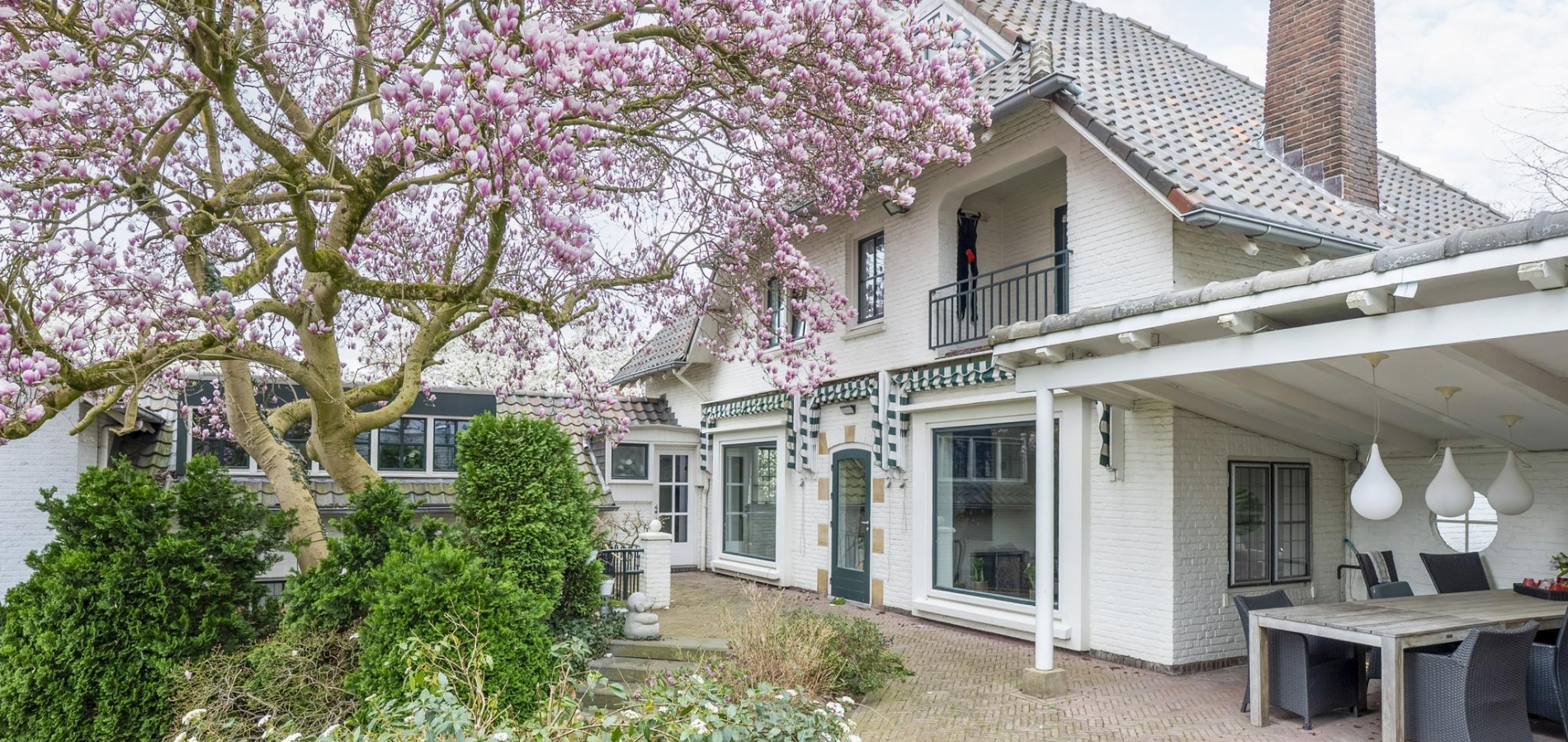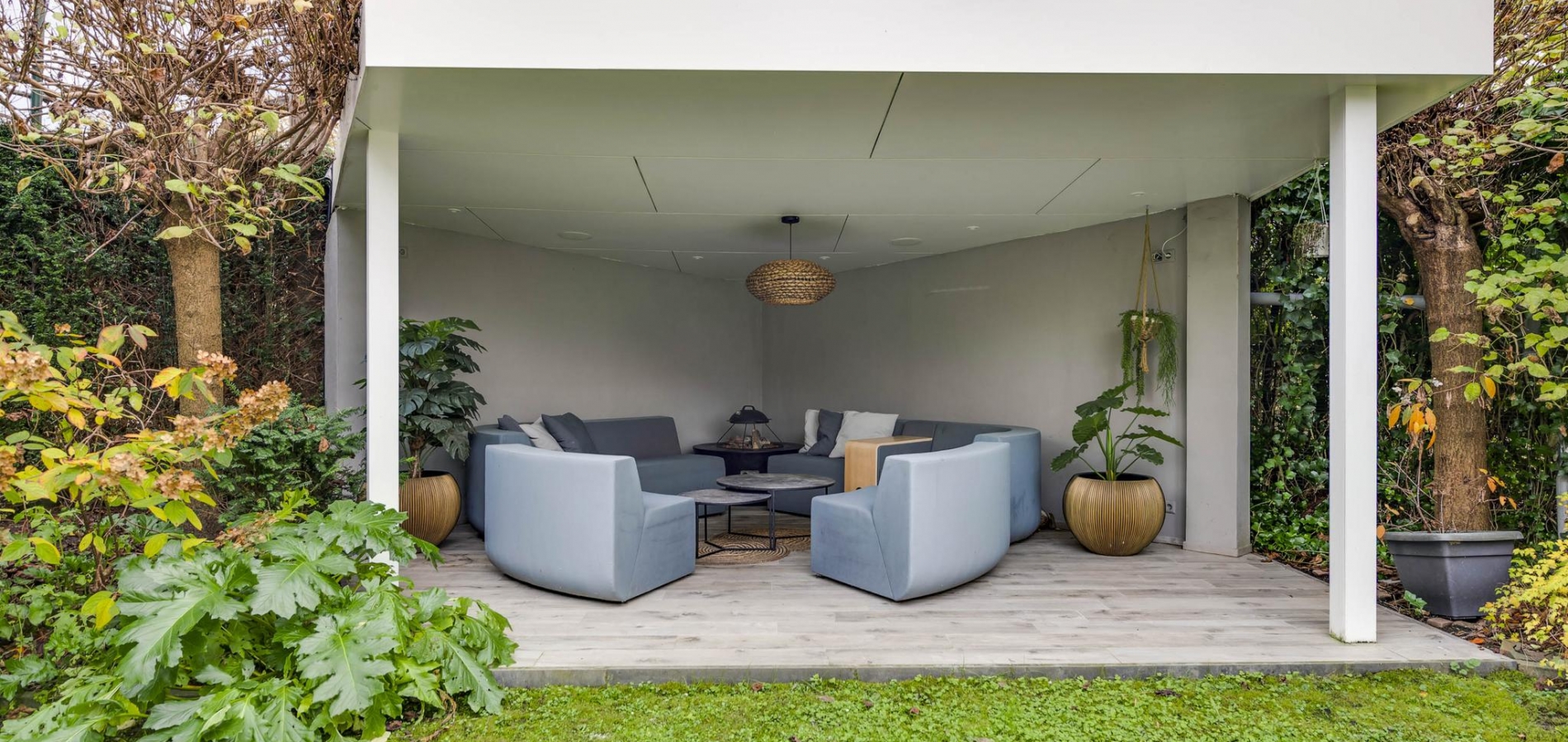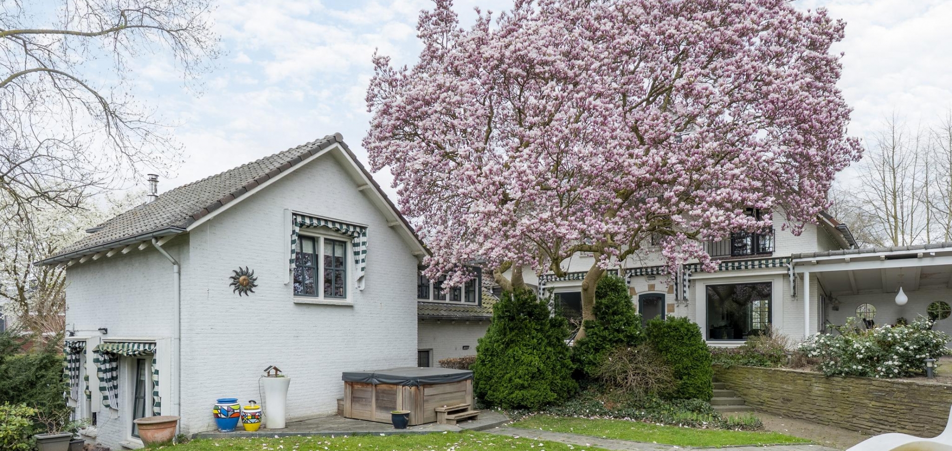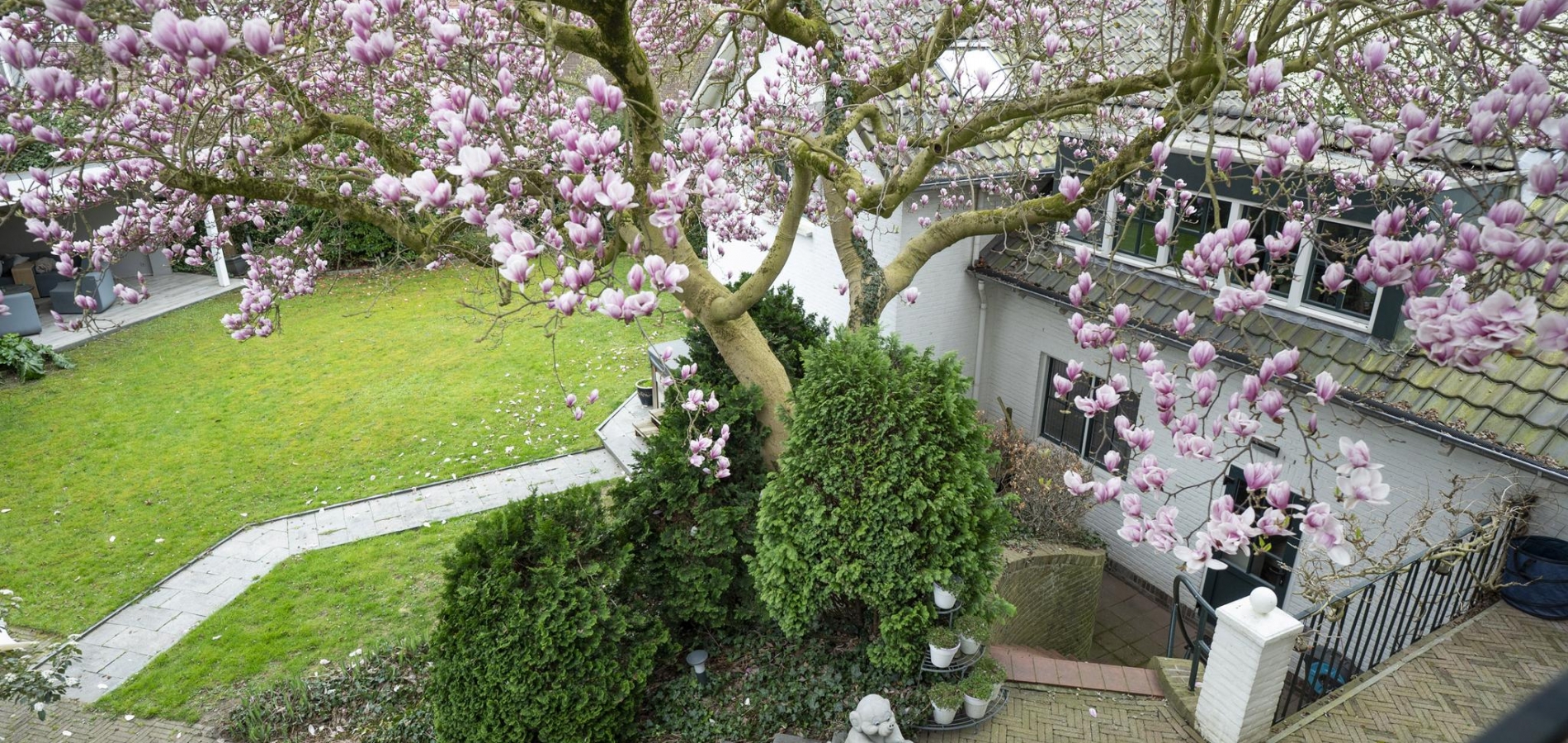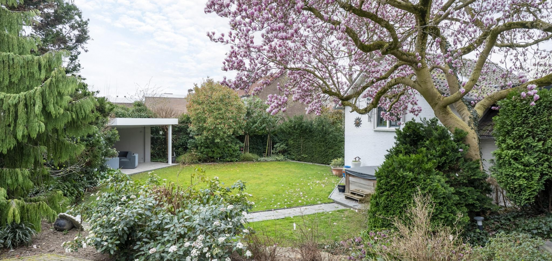 De rondom gelegen tuin is met zorg aangelegd en heeft een speelse indeling met niveauverschillen, wat voor een bijzondere uitstraling zorgt. U geniet hier van optimale privacy en heeft de luxe van twee overdekte terrassen, een gazon en sfeervolle borders. De achtertuin ligt op het zonnige zuiden.