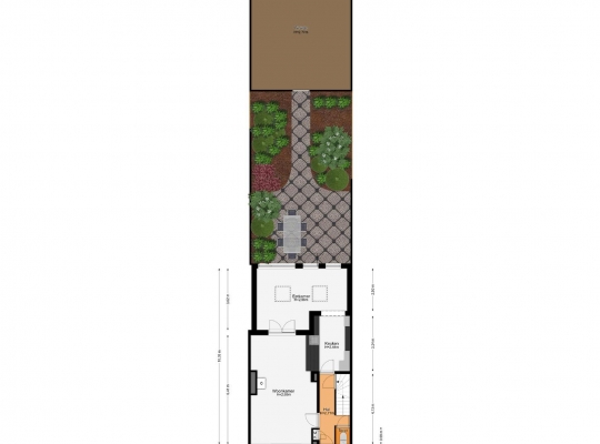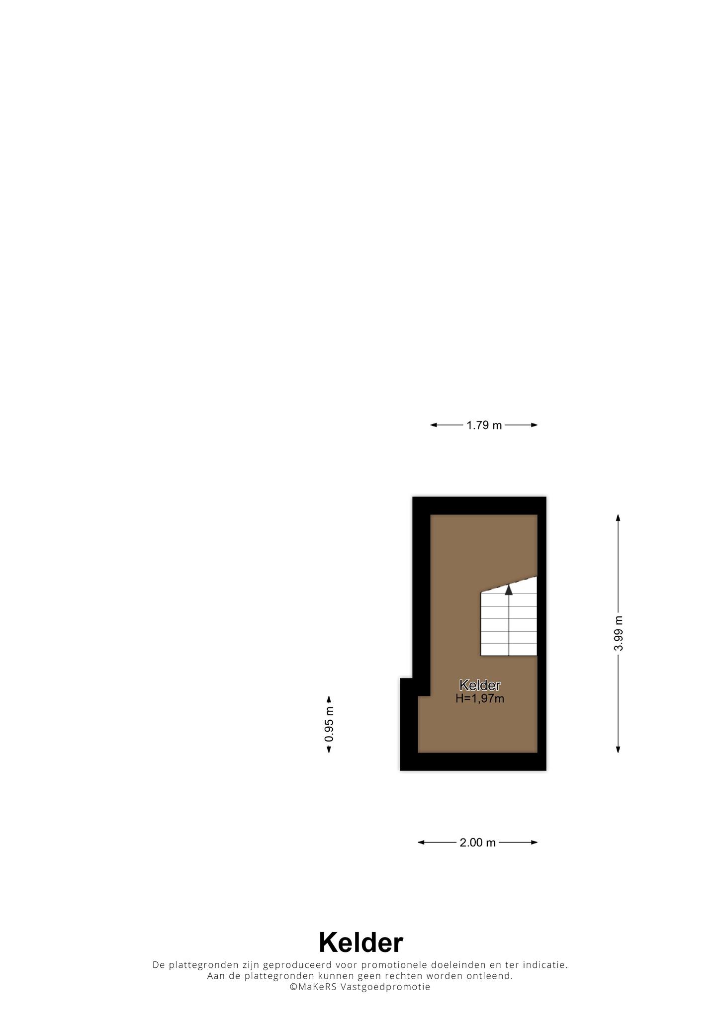 Achter een van de deuren in de hal is een trap naar de wijn-/provisiekelder (3,99 x 2,00/1,79) met een hoogte van 1,97 meter.