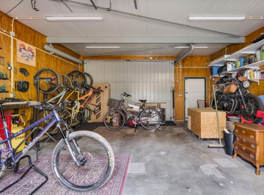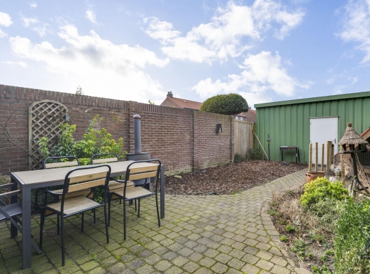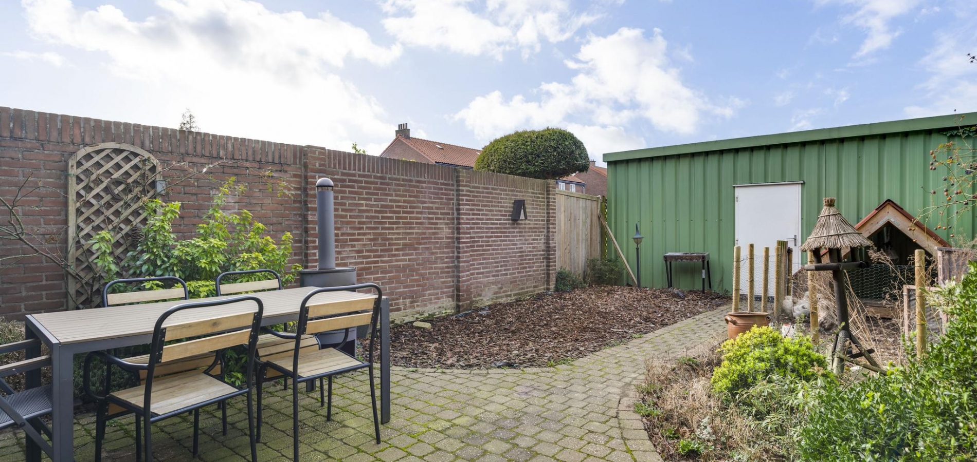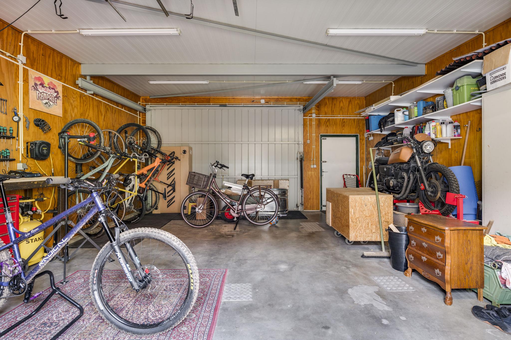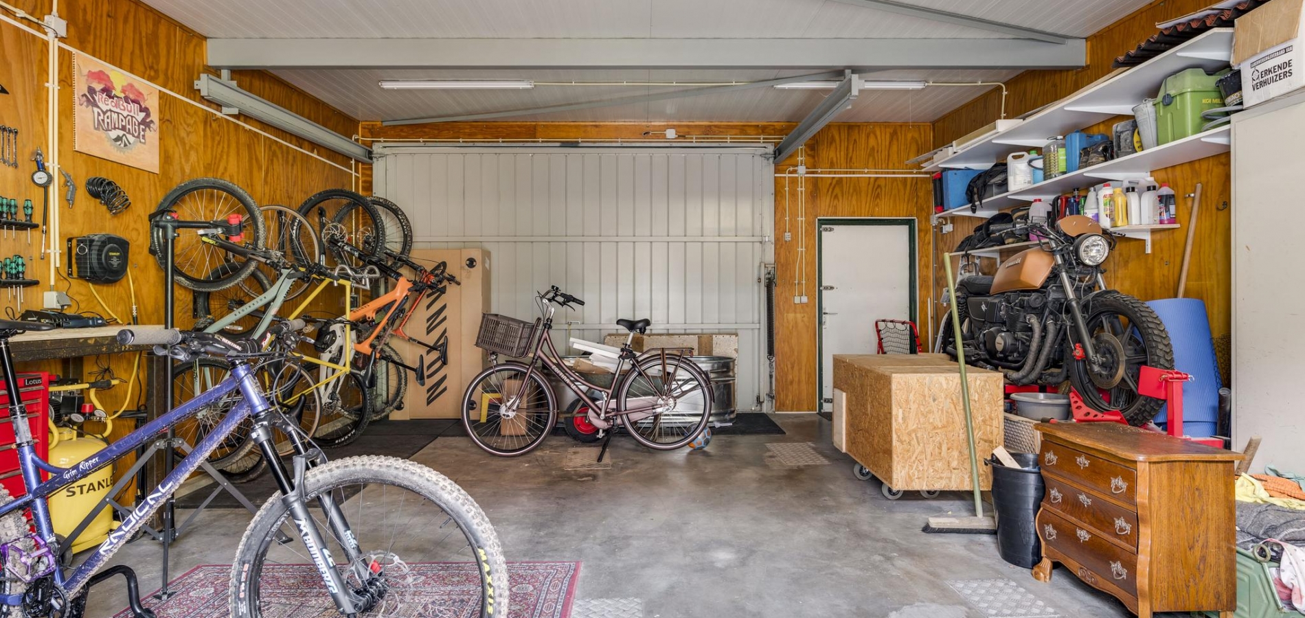 De achtertuin met ruime garage/berging (7,33 x 5,84) is gesitueerd op het westen. In de tuin ziet u een groot terras, diverse beplanting en er is plek voor een dierenverblijf. Voor de fietsen, motor en als hobbyruimte is de garage met elektra een fantastische plek. Via een pad kunt u, ook met een auto, de Bosweg bereiken.