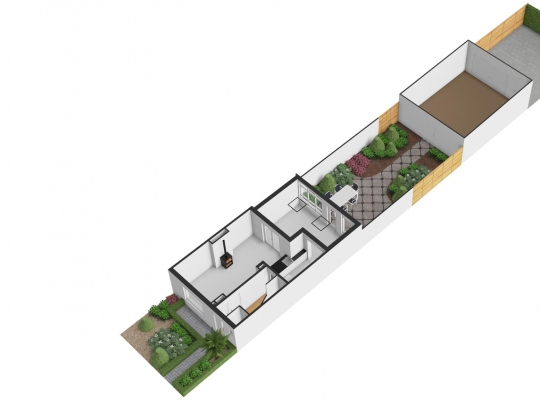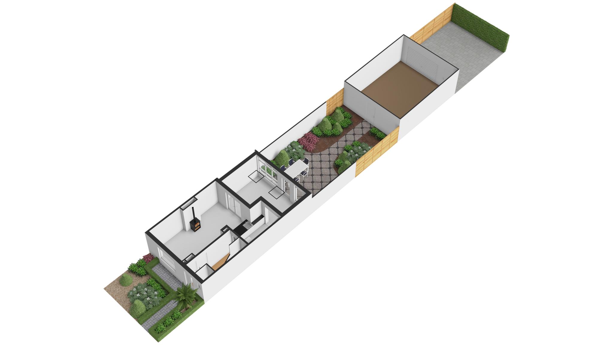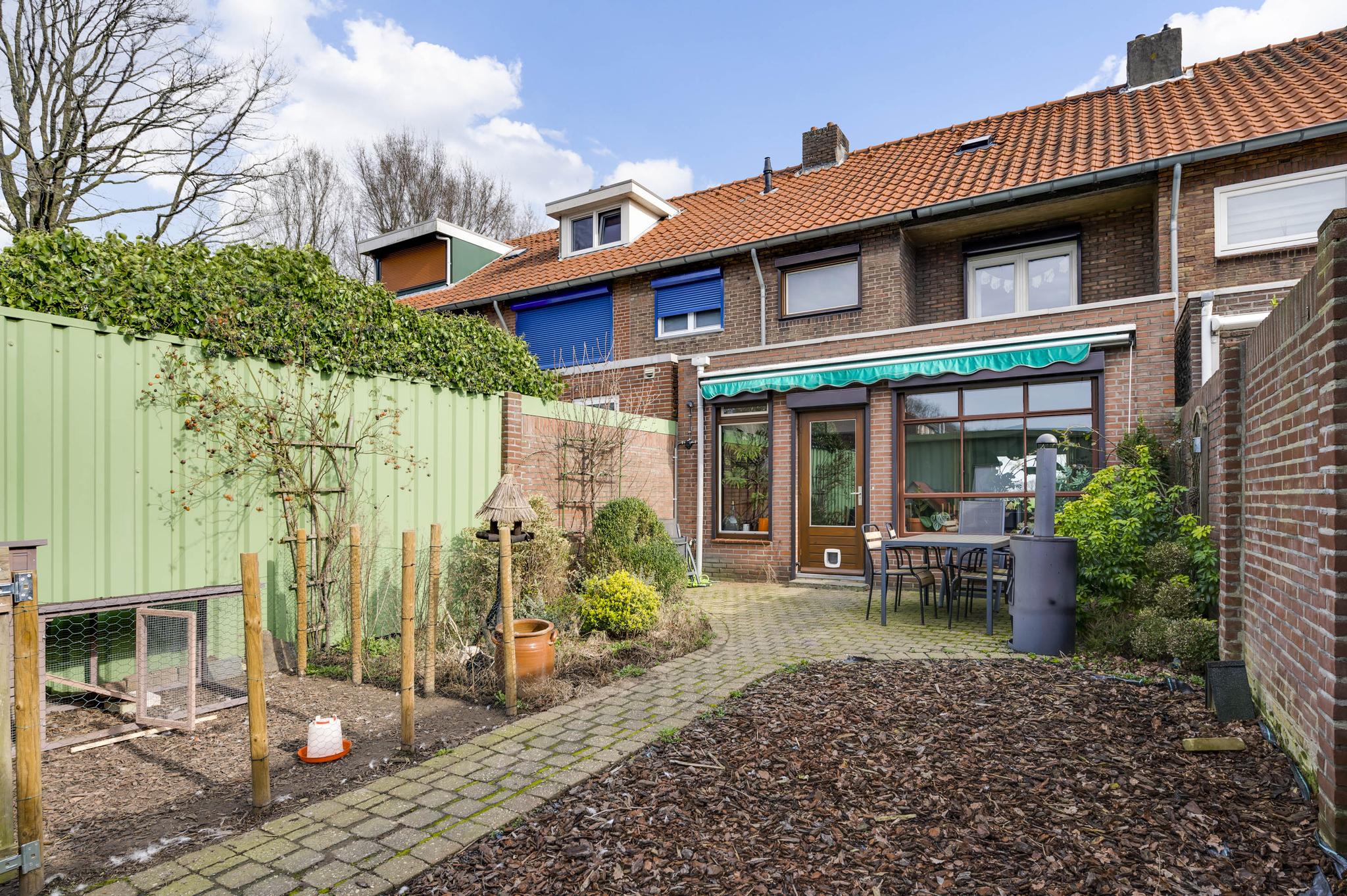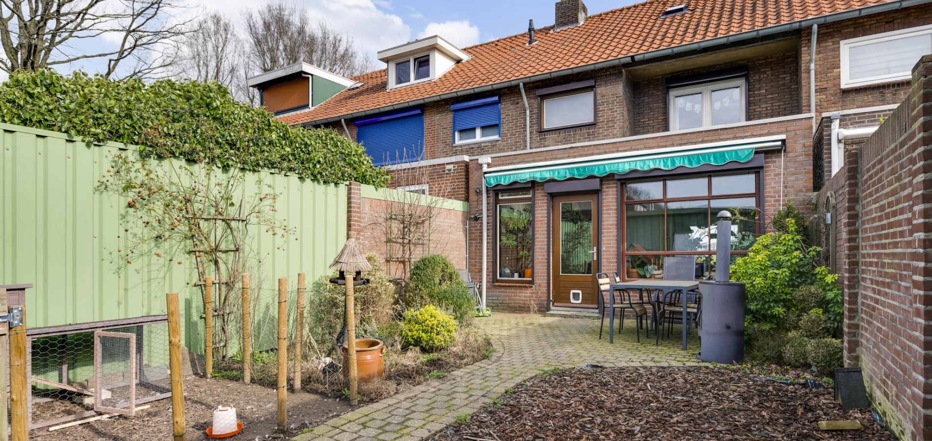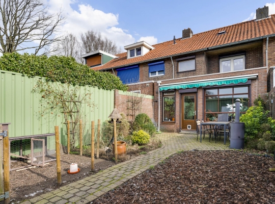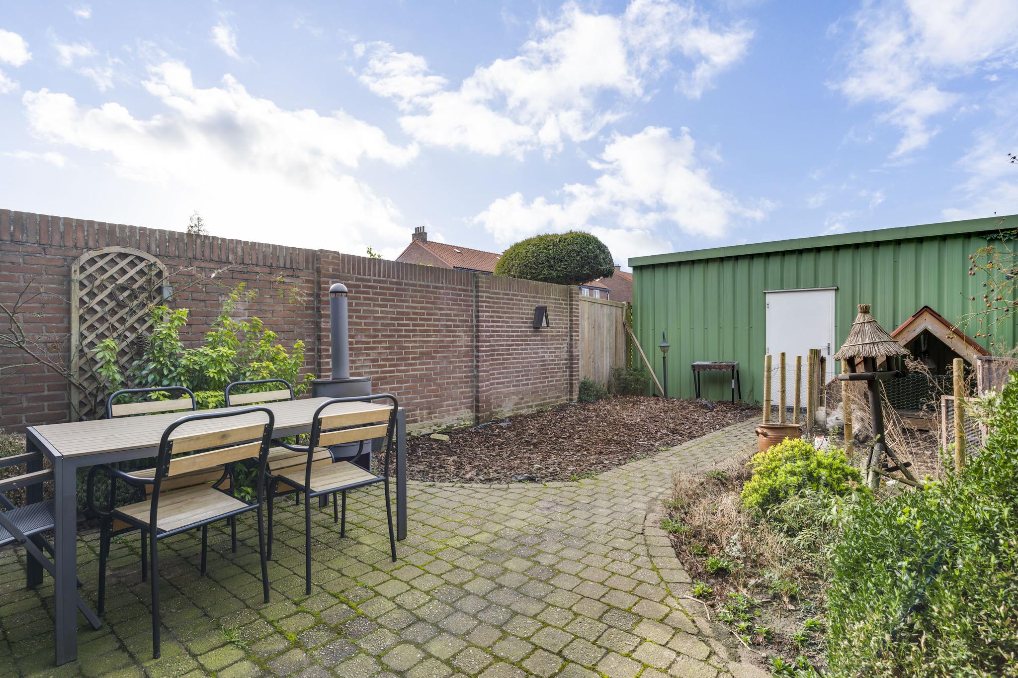 De achtertuin met ruime garage/berging (7,33 x 5,84) is gesitueerd op het westen. In de tuin ziet u een groot terras, diverse beplanting en er is plek voor een dierenverblijf. Voor de fietsen, motor en als hobbyruimte is de garage met elektra een fantastische plek. Via een pad kunt u, ook met een auto, de Bosweg bereiken.