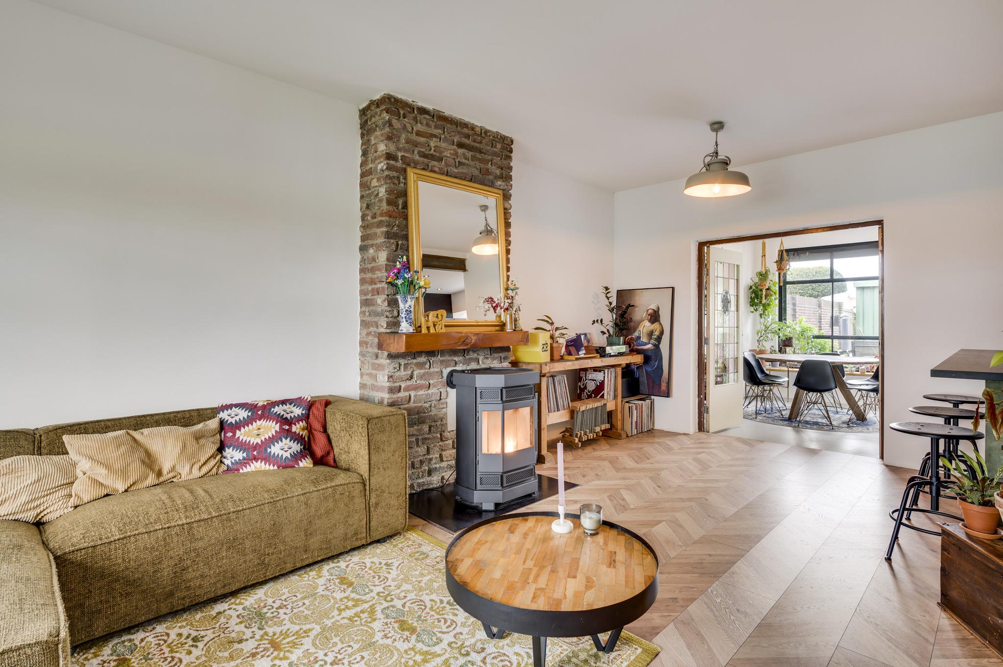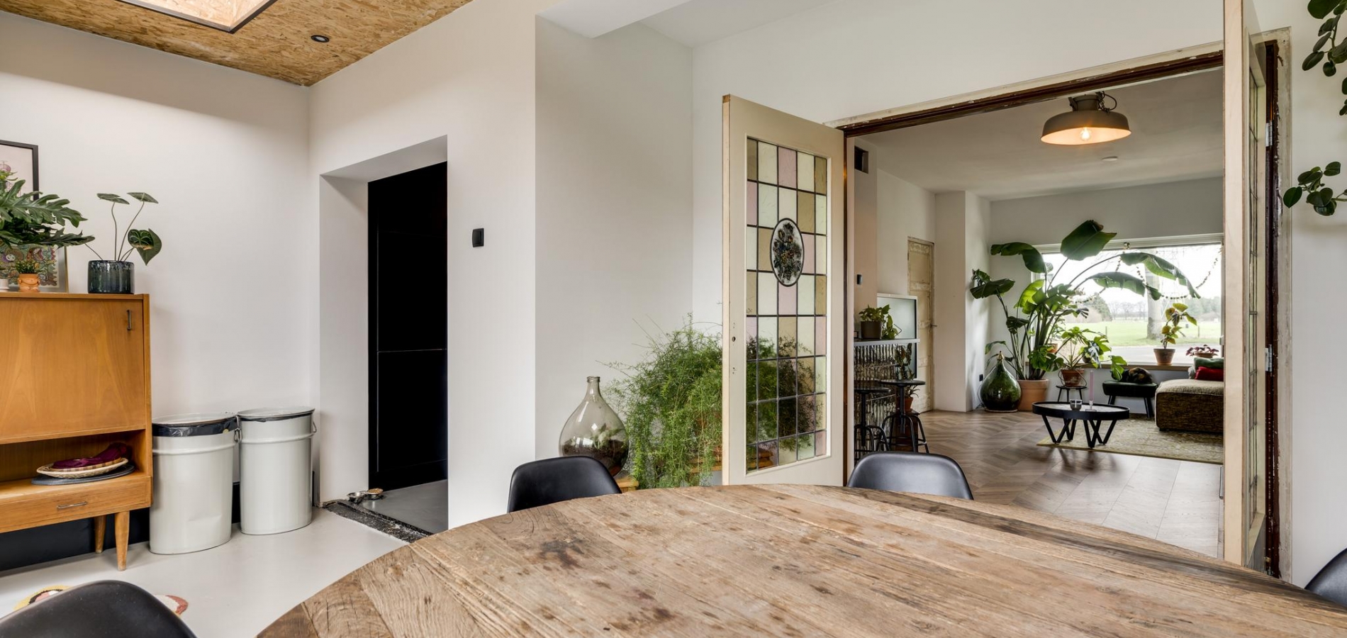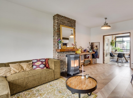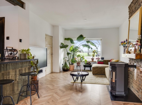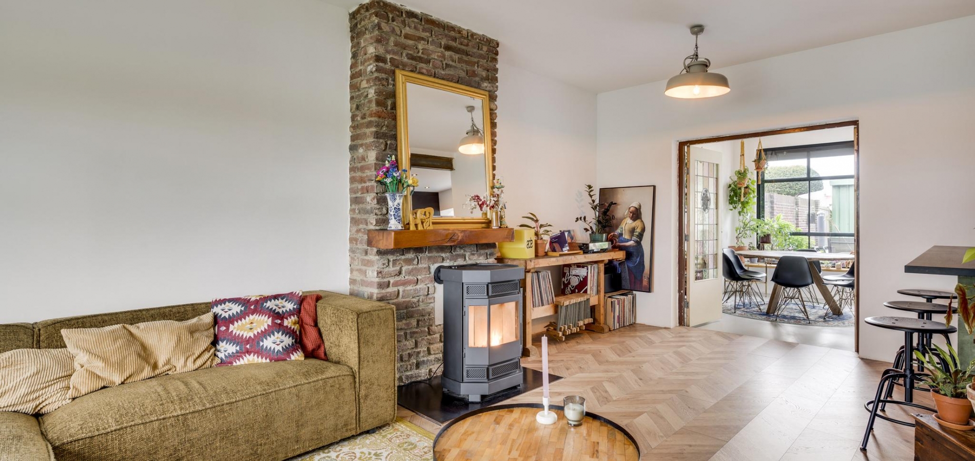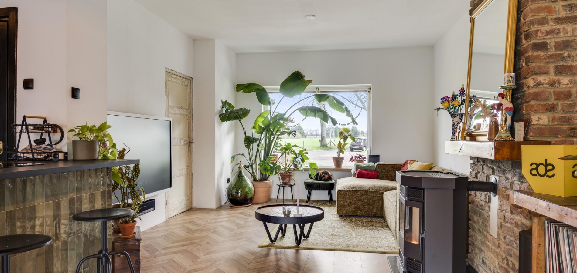 Vanuit de hal zijn de woonkamer en keuken te bereiken. De woonkamer (6,41 x 3,53) staat via dubbele deuren in verbinding met de eetkamer, waardoor er een leefruimte van ca. 39,4 m2 is ontstaan. Zo kunt de woonkamer met trendy vloer en pelletkachel inrichten als zitkamer en de eetkamer met twee lichtkoepels en gietvloer heeft een fantastische uitstraling.