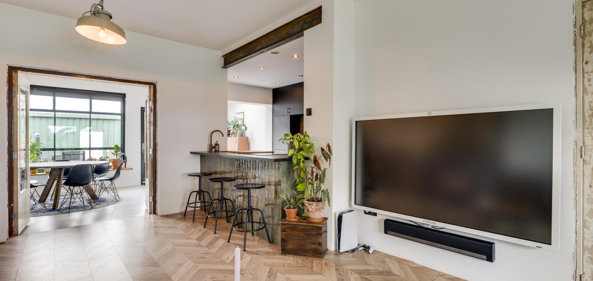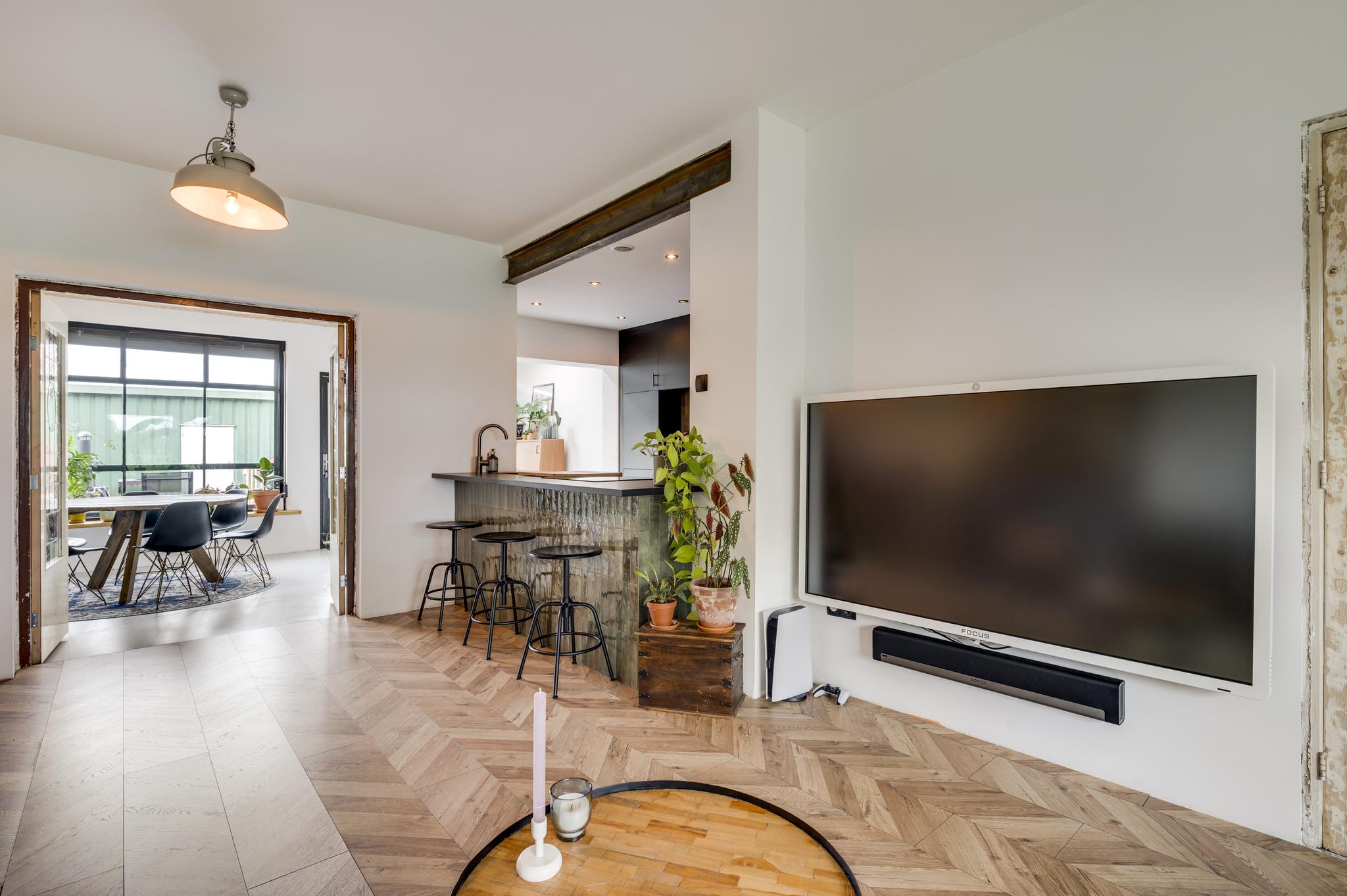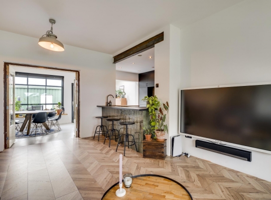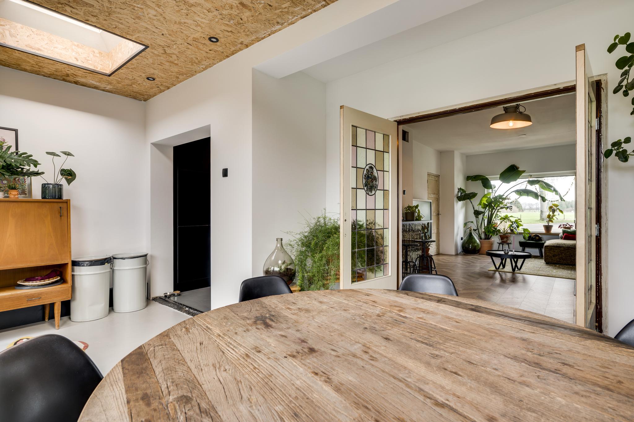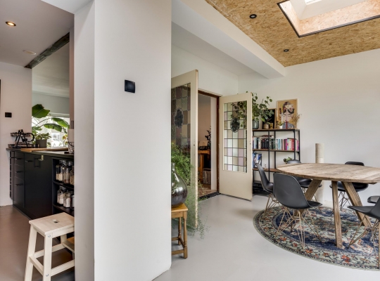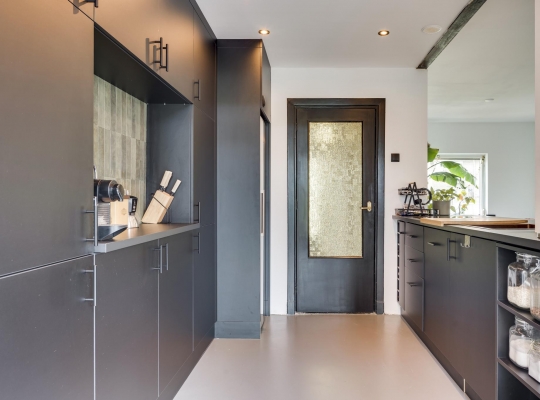 Vanuit de hal zijn de woonkamer en keuken te bereiken. De woonkamer (6,41 x 3,53) staat via dubbele deuren in verbinding met de eetkamer, waardoor er een leefruimte van ca. 39,4 m2 is ontstaan. Zo kunt de woonkamer met trendy vloer en pelletkachel inrichten als zitkamer en de eetkamer met twee lichtkoepels en gietvloer heeft een fantastische uitstraling.