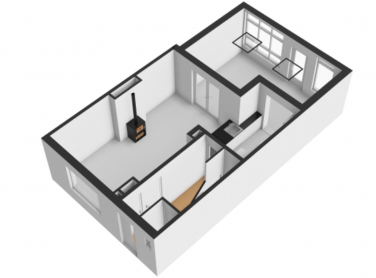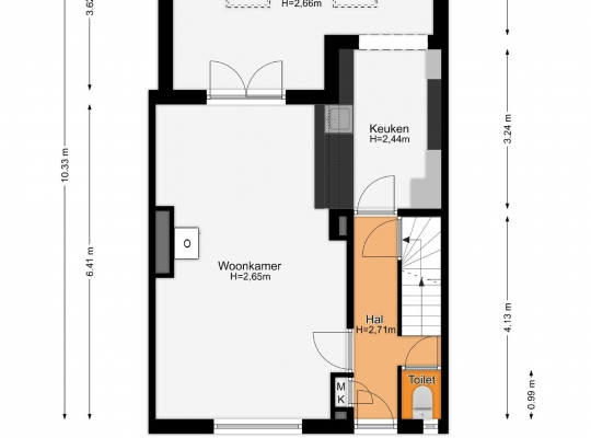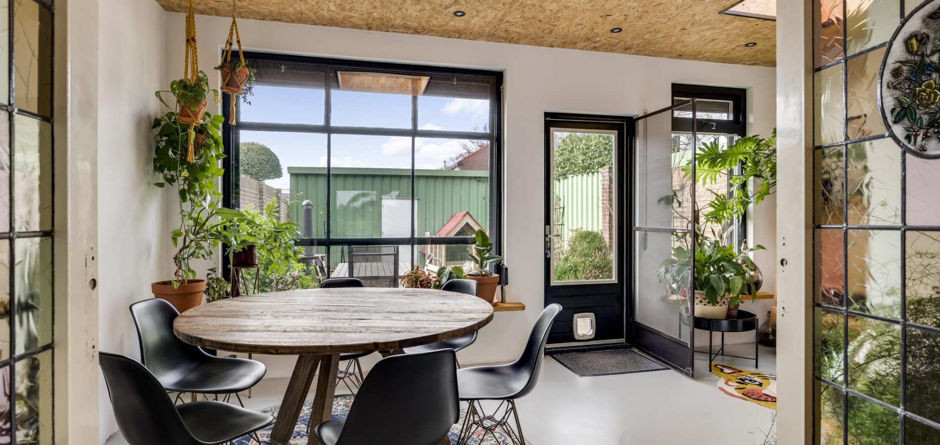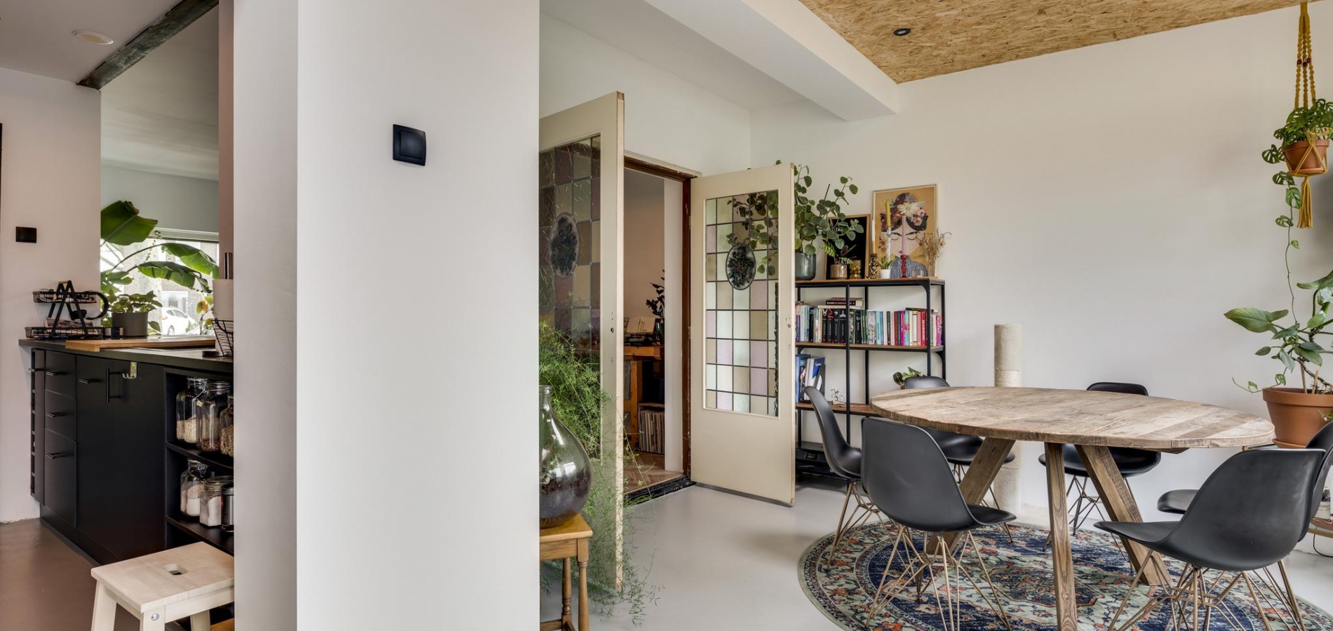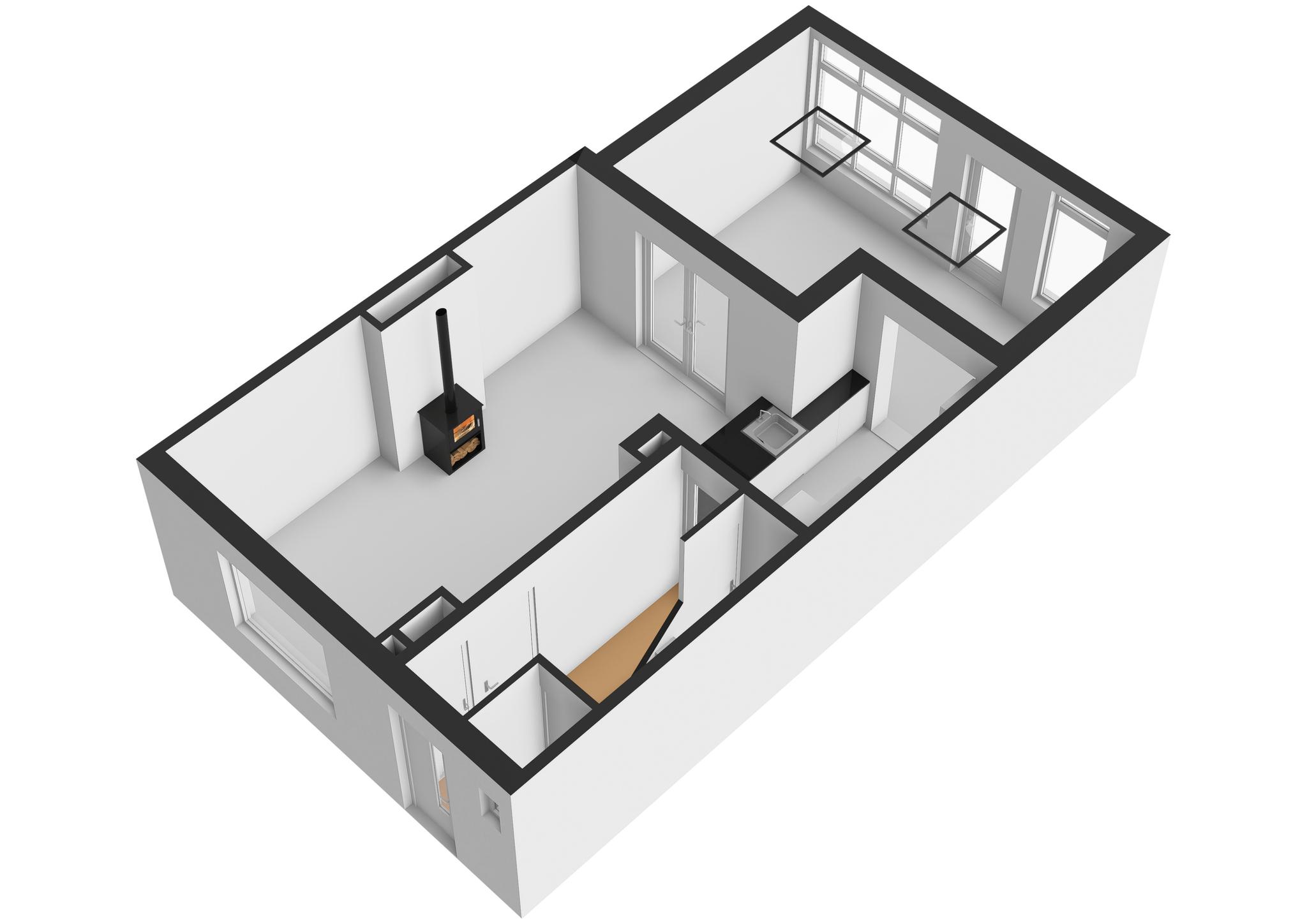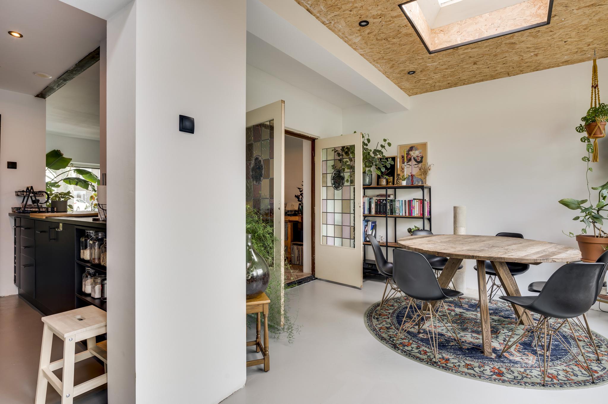 Vanuit de hal zijn de woonkamer en keuken te bereiken. De woonkamer (6,41 x 3,53) staat via dubbele deuren in verbinding met de eetkamer, waardoor er een leefruimte van ca. 39,4 m2 is ontstaan. Zo kunt de woonkamer met trendy vloer en pelletkachel inrichten als zitkamer en de eetkamer met twee lichtkoepels en gietvloer heeft een fantastische uitstraling.